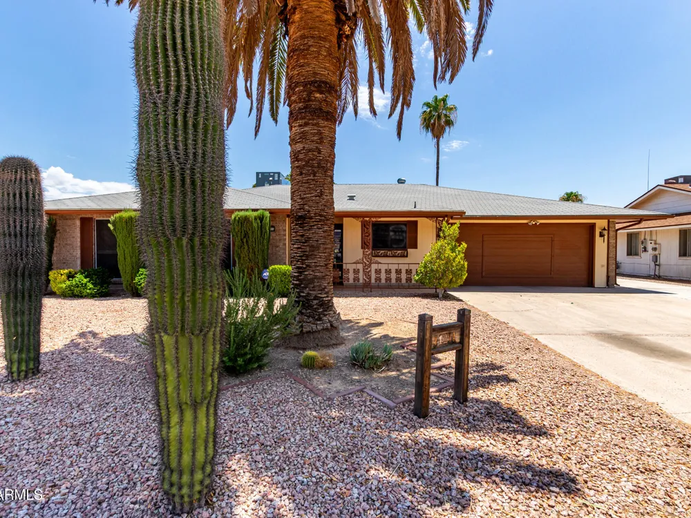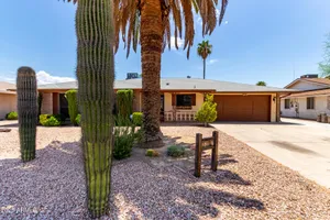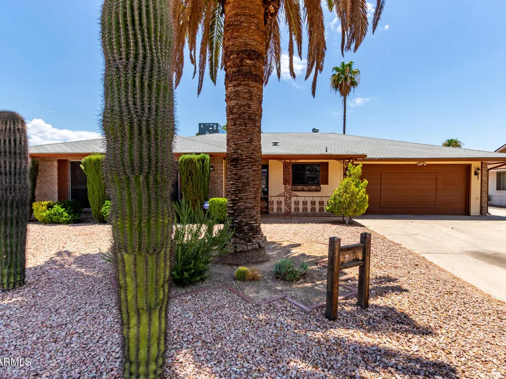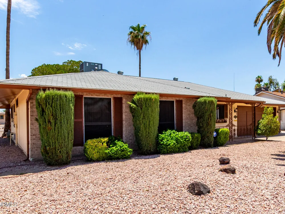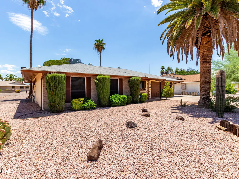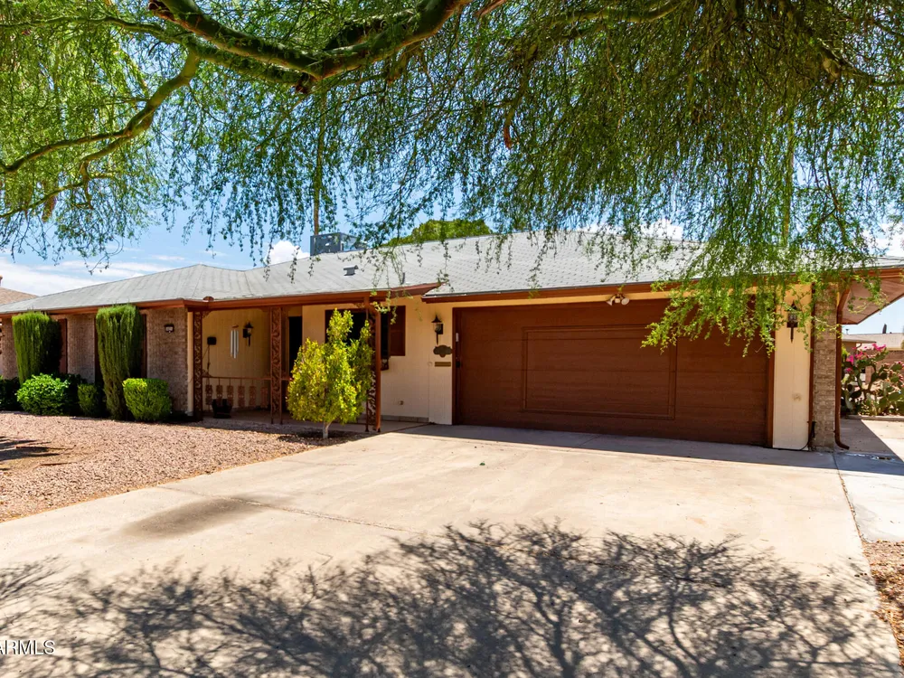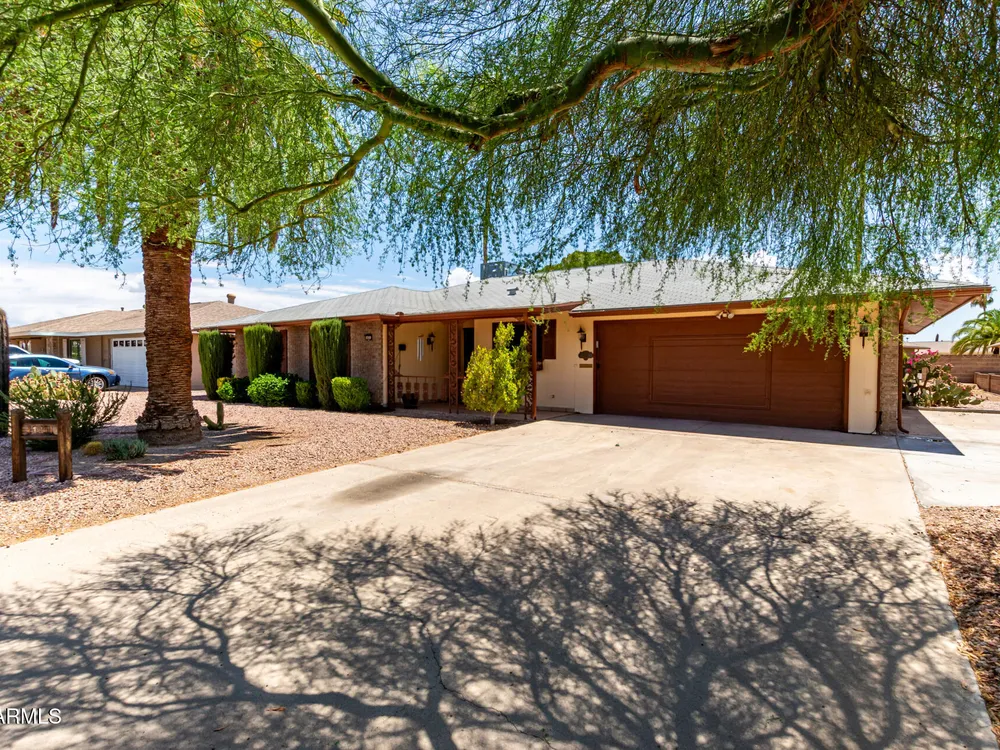Your new retirement home is here in the gorgeous Sun City Community! This one-level gem features desert landscaping for easy care and a 2-car garage + extended driveway for extra parking. Discover 1689 SqFt of living spaces that provide endless entertainment. The Kitchen has ample counters, plenty of cabinets, and the essential cooking appliances. Out the back, the low-care backyard allows you to relax under the covered patio while enjoying a refreshing beverage. Seize this opportunity!