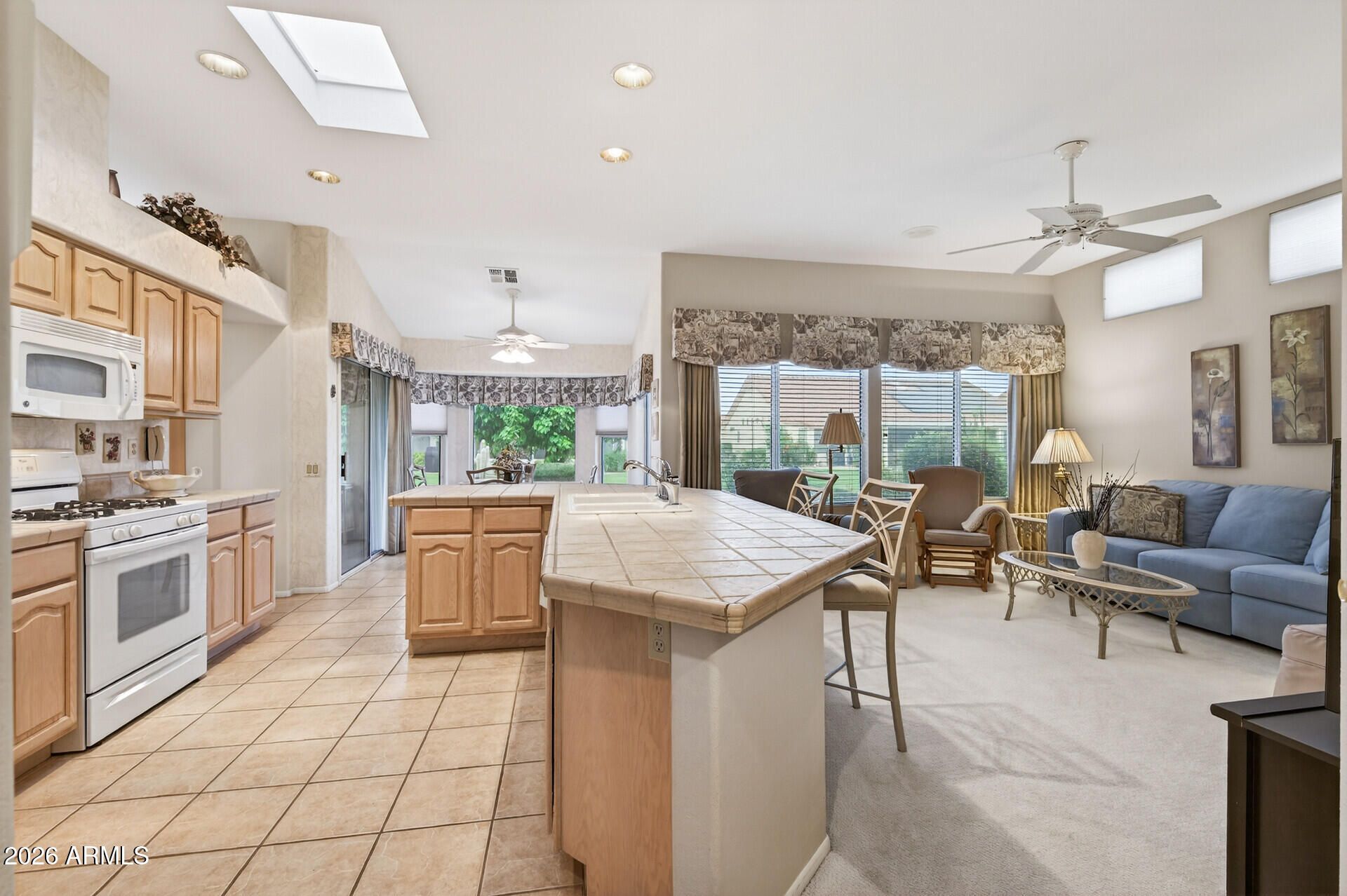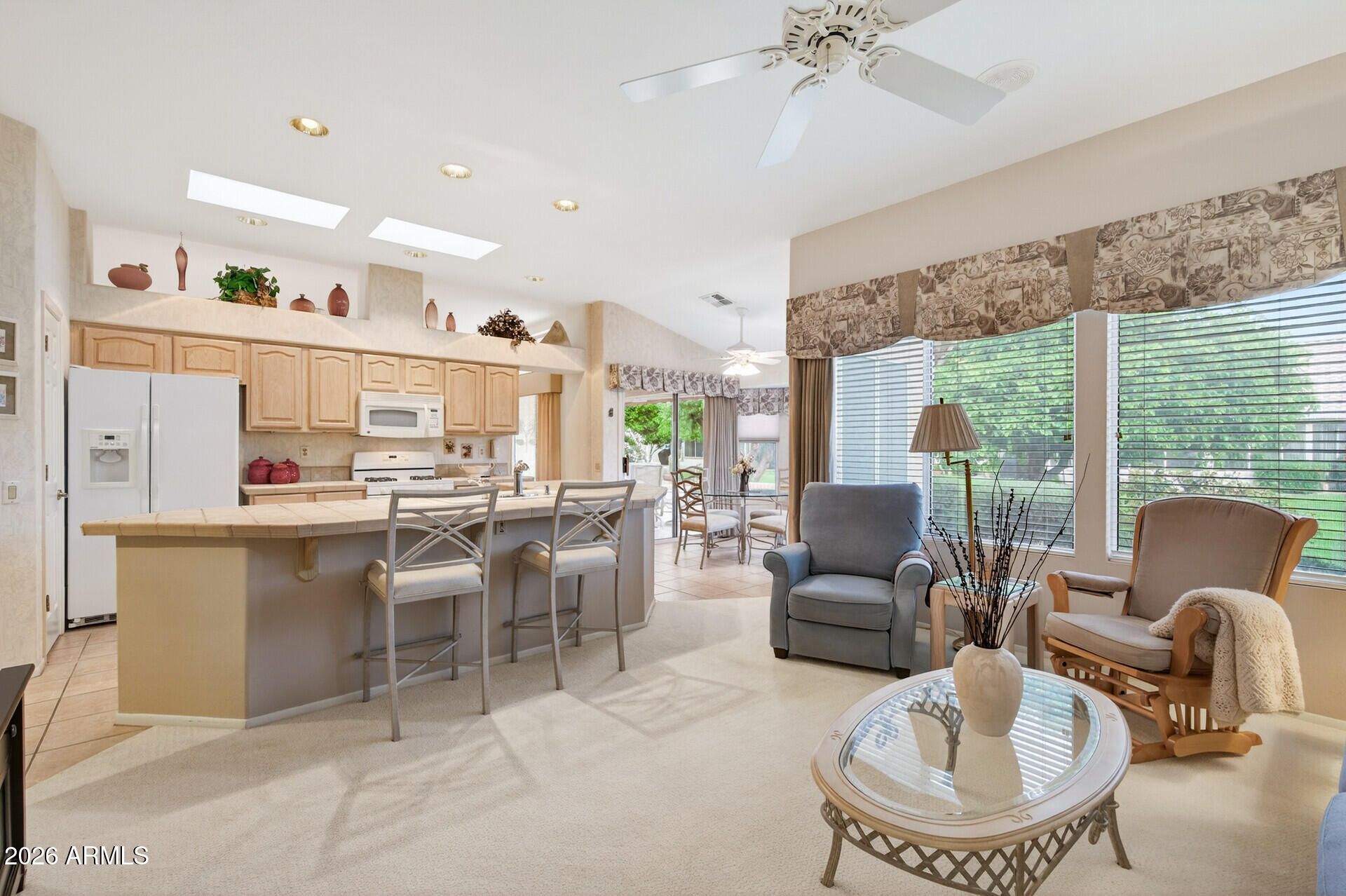 Step into easy, resort-style living with this beautifully maintained home! A Kool deck walkway leads to a welcoming front porch & secure entry. Inside, the bright kitchen features a gas cooktop, two skylights, an instant hot water dispenser at sink & convenient pull-out drawers. The spacious owner's suite boasts a vaulted ceiling, bay window, cultured marble shower, 19'' Kohler toilet, + a large walk-in closet w/organized shelving & mirrored doors. A versatile den offers built-in cabinetry & desk space. Relax on the extended patio w/knee wall, awning & Kool Deck, overlooking a lush, HOA-maintained yard including trimming, mowing & exterior water. Garage cabinets & sink. NEW sunscreens (2025), NEW TRANE HVAC (2022), NEW WTR HEATER (2020) & NEW BACK ROOF UNDERLAYMENT 2014 & FRONT ROOF 2020!