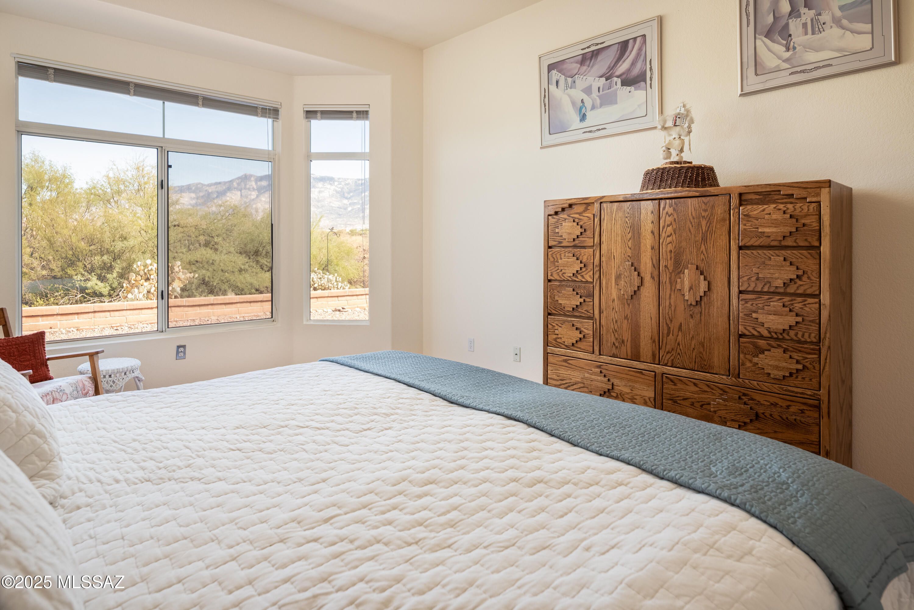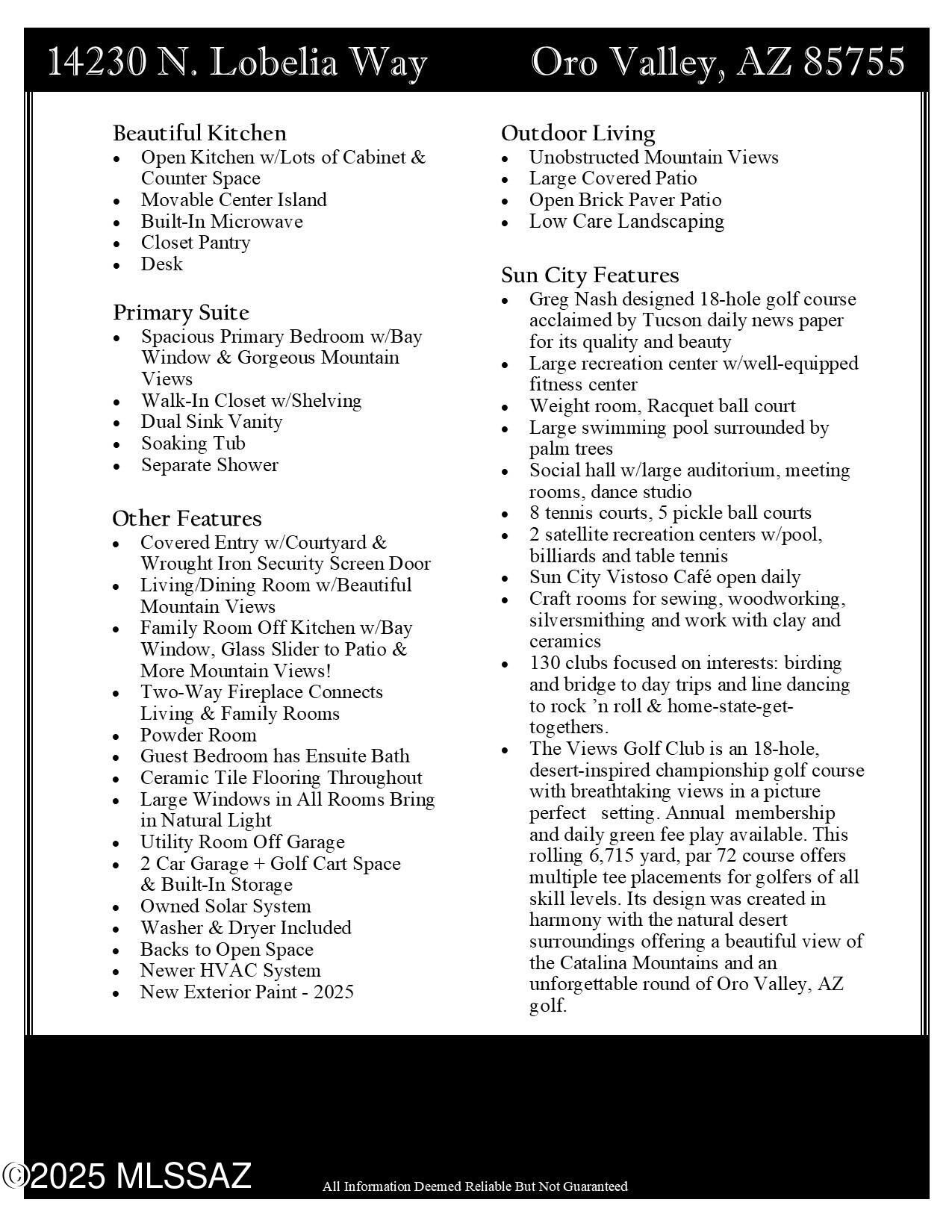 Discover the sought-after Skyline model in age restricted Sun City Oro Valley, one of Tucson's premier active adult communities. This 2BR/2 1/2BA, 2,034sf home features two spacious primary suites with en-suite baths, perfect for guests or multi-generational living. Set on a premium lot backing to open space, the home offers unobstructed Catalina Mountain views. Beautiful ceramic tile flooring throughout, a cozy two-way fireplace & bright, open living spaces. The kitchen has movable island, closet pantry, desk and an open flow to the family room and casual dining area. A covered patio extends your living space outdoors, perfect for relaxing or enjoying evening mountain views. Enjoy the benefit of an owned solar system keeping utility bills low, plus a newer HVAC system,