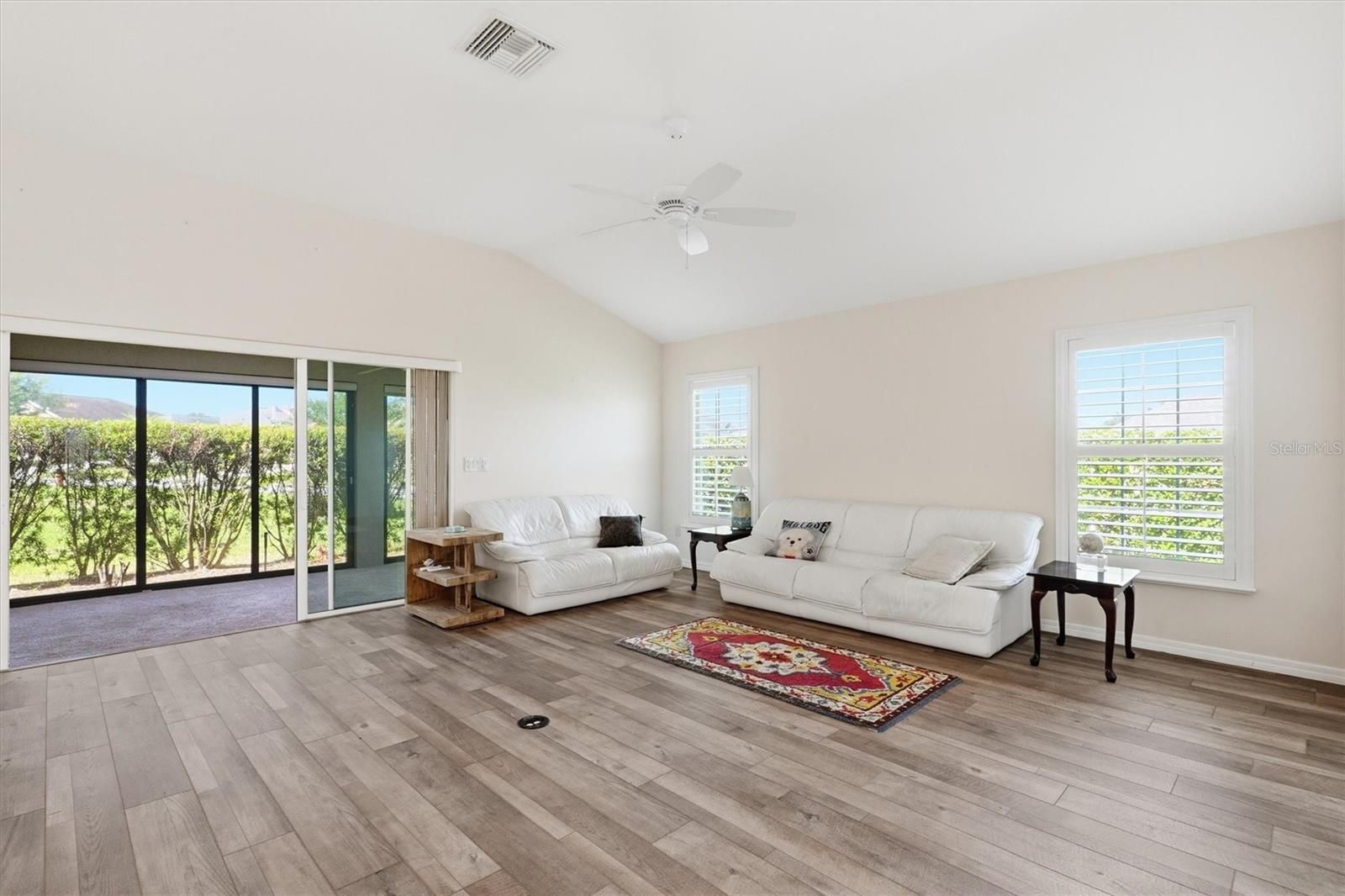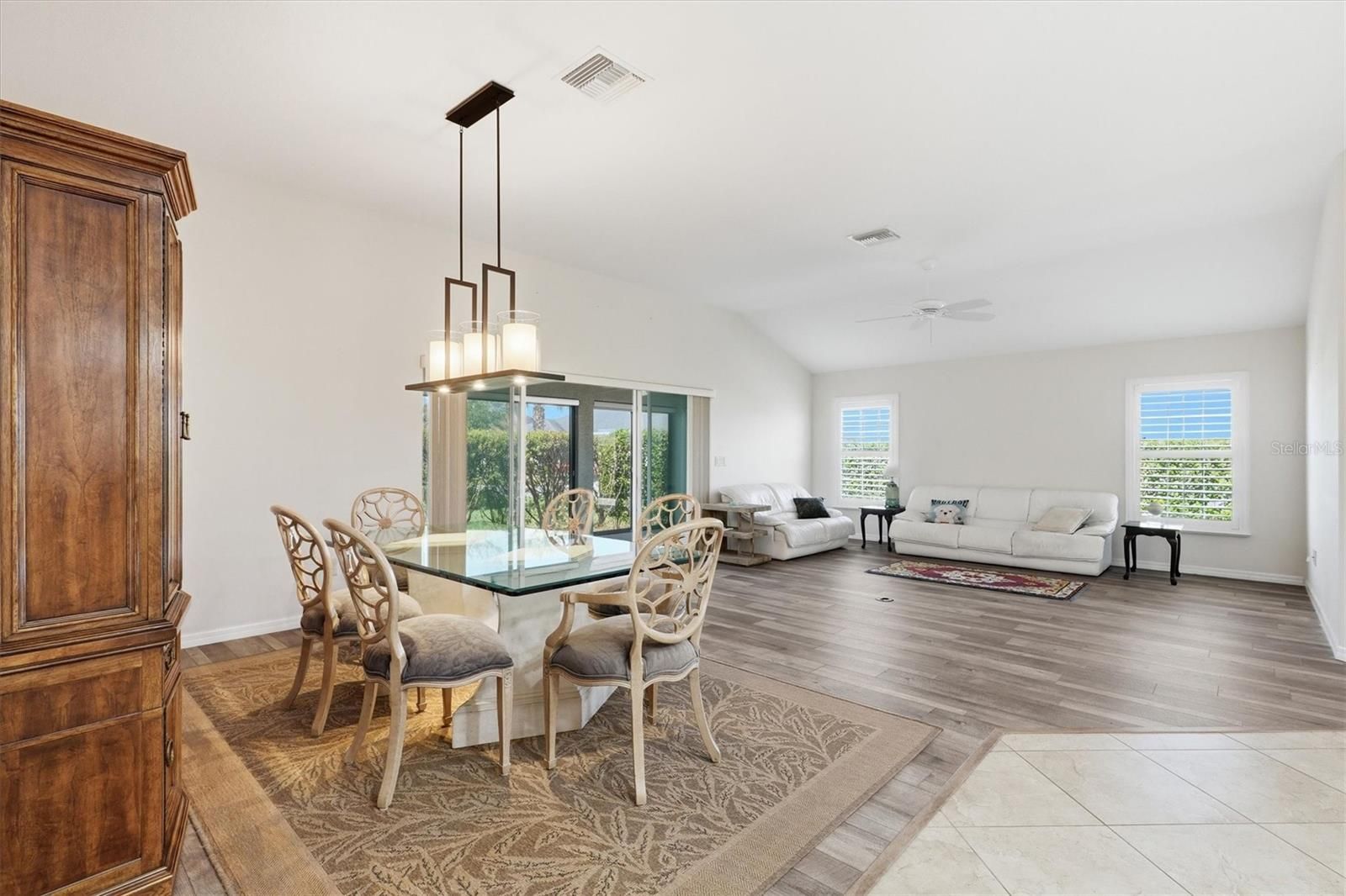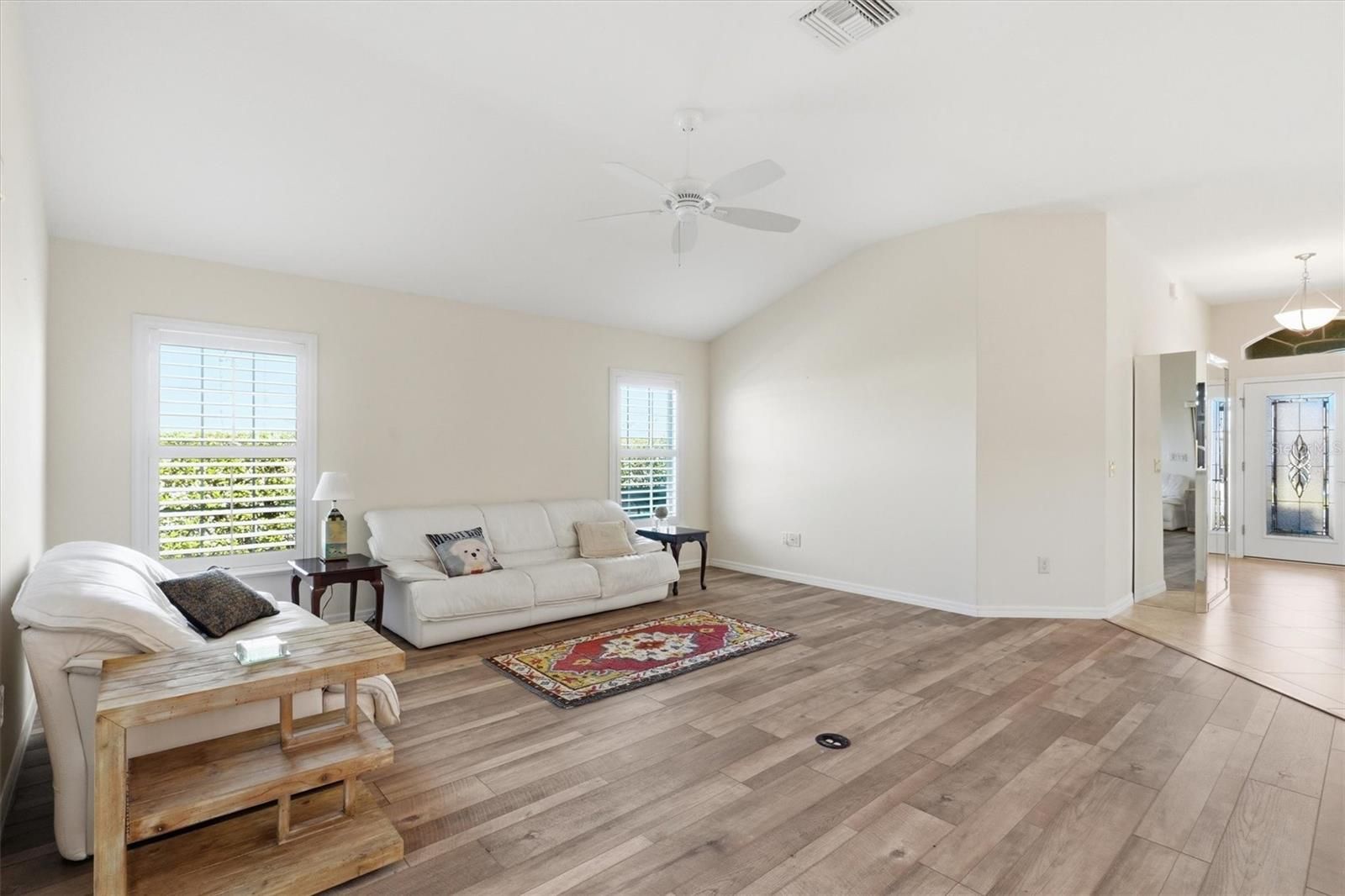 Welcome to this beautifully appointed 3/3 with golf cart garage, Begonia Designer Home in the Village of Dunedin, perfectly situated on a desirable corner lot and designed for both comfort and style. From the moment you arrive, the screened front porch and stunning stained glass front door with matching side panel and transom window create a warm and elegant first impression. Step inside to a welcoming entry foyer, where a privacy door leads to two guest bedrooms—ideal for hosting family and friends. The open and split floor plan offers both spaciousness and functionality, enhanced by plantation shutters, ceiling fans throughout, and wood-look laminate flooring in the main living areas, with soft carpeting in the bedrooms. The upgraded eat-in kitchen is a true centerpiece, featuring stainless steel appliances, a breakfast bar with pendant lighting, dining nook, and both under and over cabinet lighting for added ambiance. A solar tube fills the space with natural light, while thoughtful details make this kitchen as practical as it is beautiful. This home boasts two master suites, providing exceptional flexibility. The primary master bedroom features a tray ceiling, his and hers walk-in closets, and an ensuite bath with dual split vanities, a private water closet, and a walk-in shower (no tub). The second master suite also includes its own ensuite bath with a walk-in shower—perfect for guests seeking privacy. The third bedroom offers versatility as a home office, den, or craft room, while the guest bath includes a convenient shower/tub combination. Enjoy year-round relaxation in the enclosed, temperature-controlled lanai with pull-down shades, or step outside to the private paver patio complete with a jacuzzi and lush privacy hedge—your own personal retreat. Additional highlights include a whole-home water filtration system, custom closets,interior lanundry room, and a spacious 2-car plus golf cart garage—providing ample room for vehicles, storage, and all your lifestyle needs. With thoughtful upgrades and inviting indoor and outdoor living spaces, this home offers the perfect blend of elegance and everyday comfort. Close to Manatee Village Recreation center, Evans Prairie Country Club and Executive Golf courses. Brownwood town center is just a short golf car ride for dining, entertainment and shopping. It’s the perfect place to start living the Villages lifestyle. Watch our Video and call to make your appointment to see this home today!