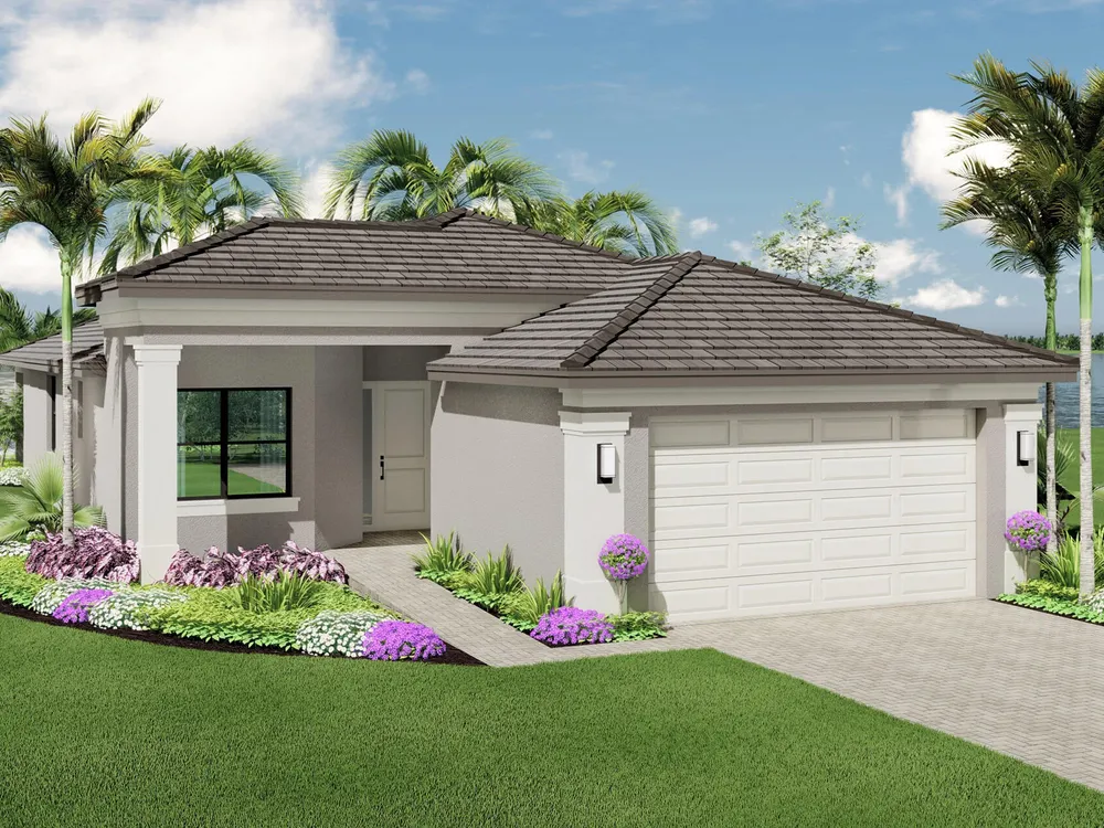 Valencia Grove at Riverland is where you'll find Port St. Lucie's best 55+ lifestyle with a million ways to have fun including a beautiful 34,000-square foot Clubhouse with resort-style amenities. This Seirra floorplan includes private landscaped views and an open floor plan with contemporary porcelain 24''x24'' matte tile flooring throughout all main living areas. All bedrooms include plush carpet. The home features high end finishes including impact glass windows, GE gas appliances, tile roof, and recessed LED lighting. The spacious kitchen includes quartz countertops with a full quartz backsplash, painted white maple shaker style cabinets with soft close doors and drawers, custom cabinet pantry built-in, and stainless-steel appliances.