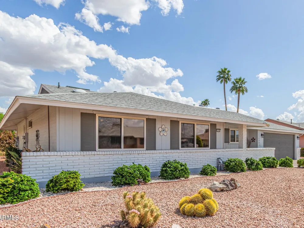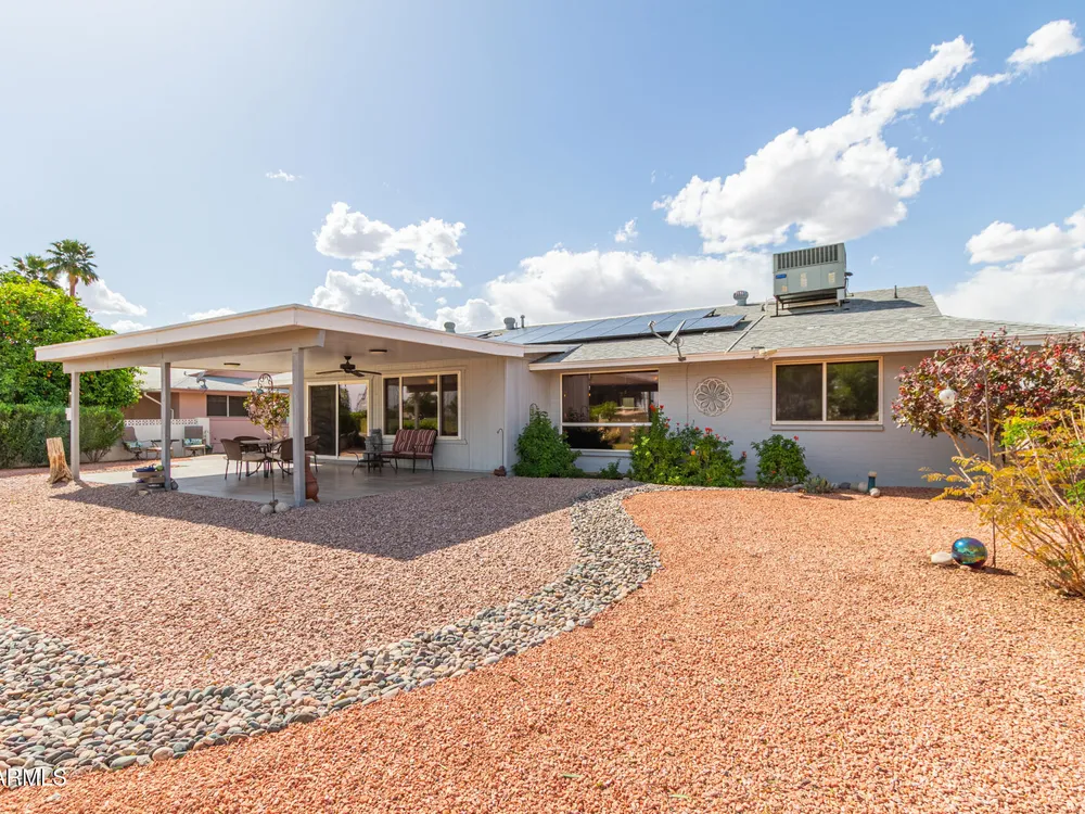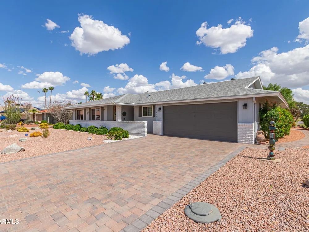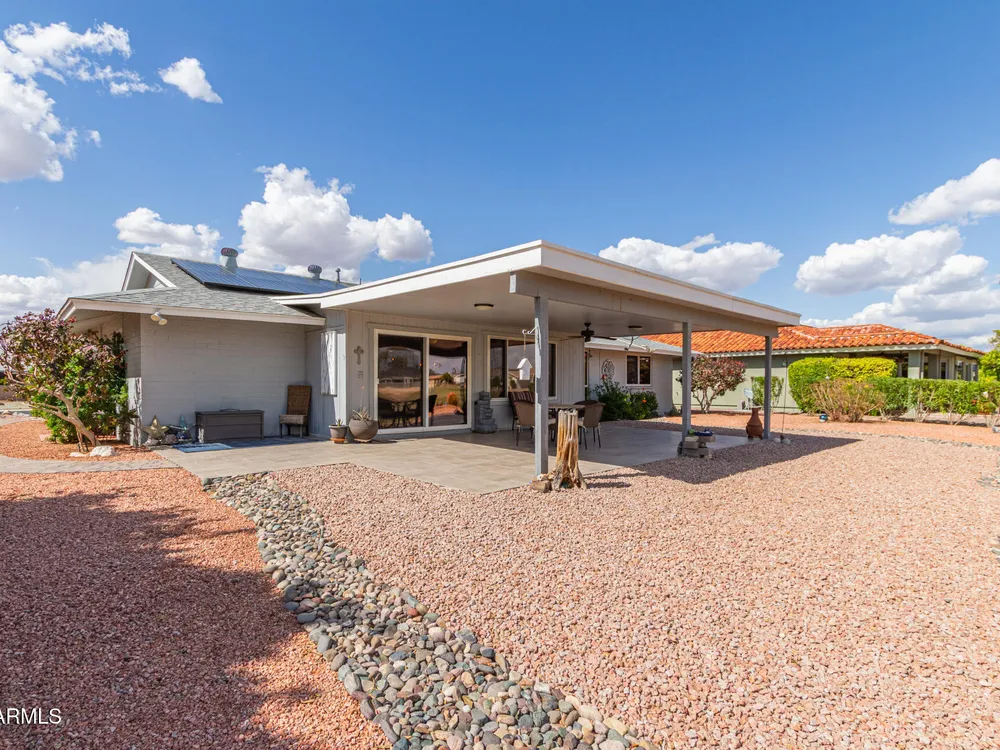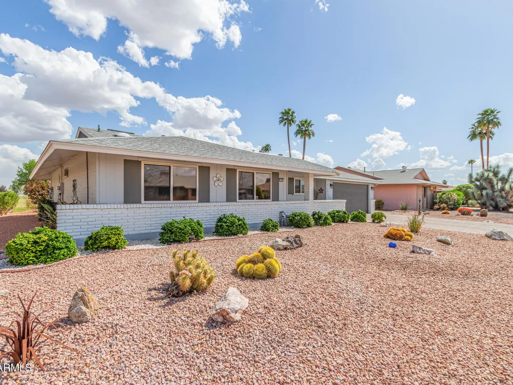 You don't want to miss this 3 bedroom home in Phase II of Sun City! This beautiful residence is a perfect balance of style & comfort, welcoming curb appeal, manicured landscape & a 2 car garage with epoxy flooring. Interior features an open floor plan with ceramic wood plank tile throughout, huge windows for plenty of natural light and great views. The modern kitchen displays recessed lights, custom shaker cabinetry for abundant storage, tile backsplash, granite countertops, breakfast bar & SS appliances. Cozy master suite has two walk-in closets and a bathroom with double sinks for convenience. Den is perfect for an office or craft room. Pluses: Sewer & water lines are up-to-date; Solar is owned outright. Pull out shelving through-out. Bar with built in wine cooler