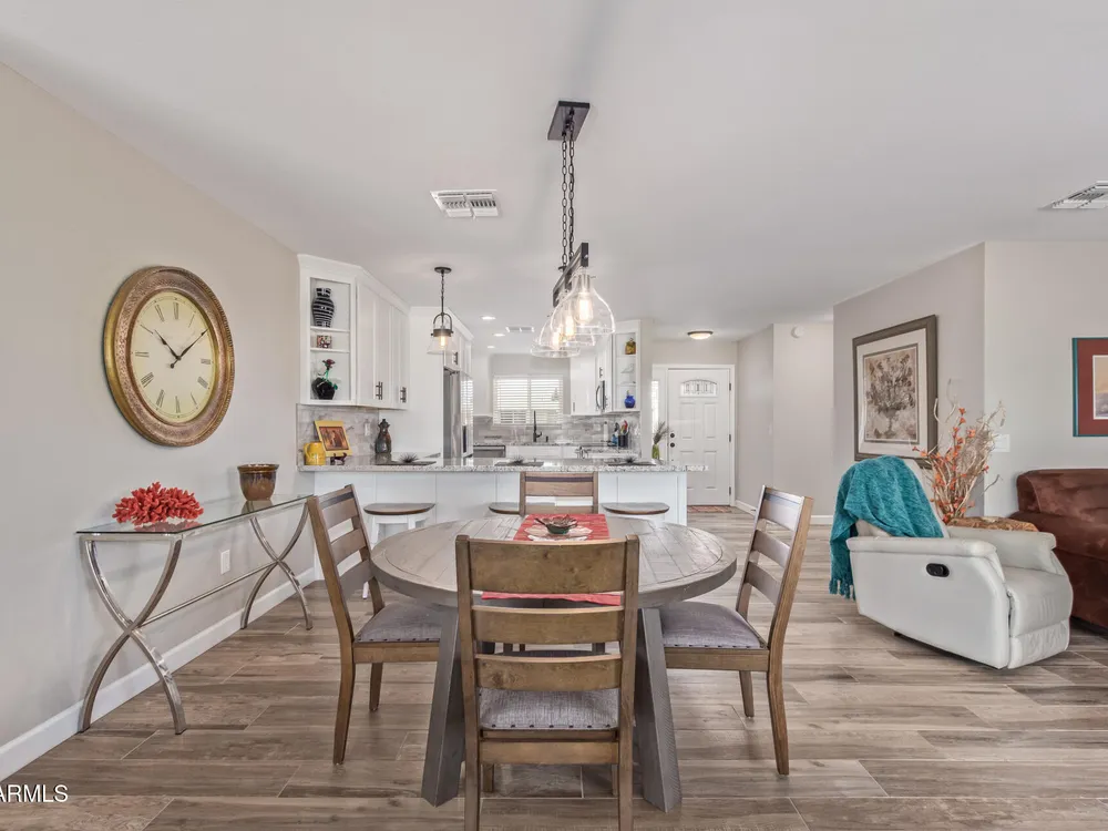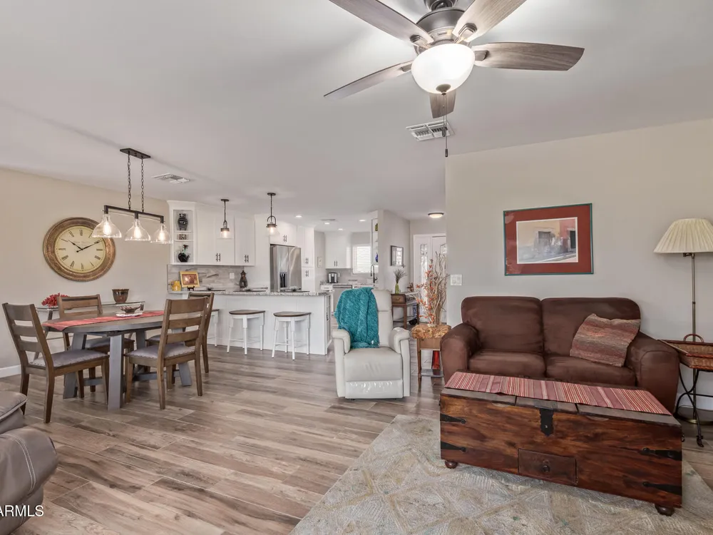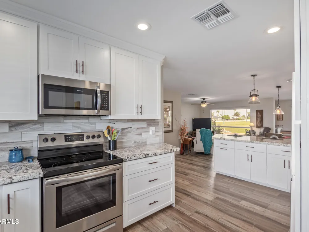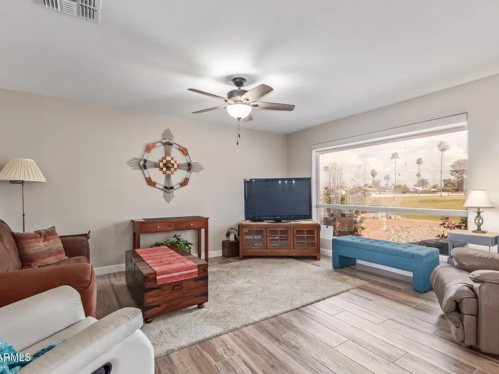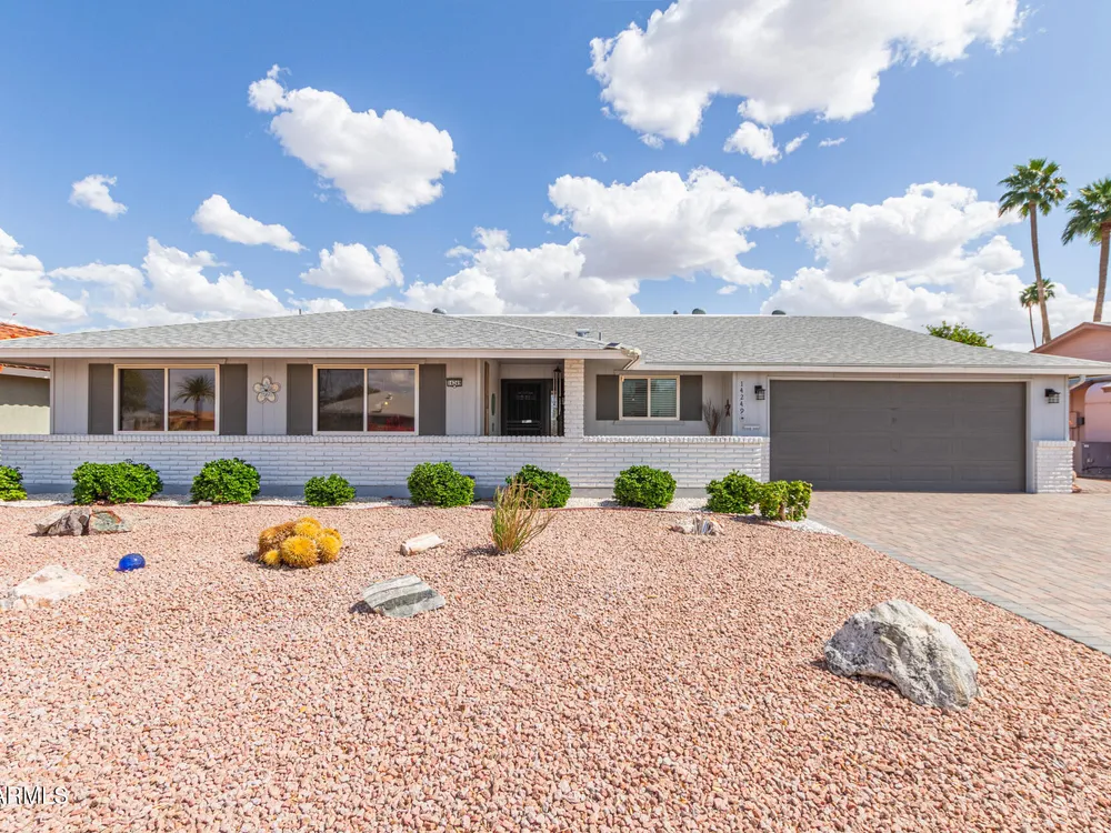 You don't want to miss this 3 bedroom home in Phase II of Sun City! This beautiful residence is a perfect balance of style & comfort, welcoming curb appeal, manicured landscape & a 2 car garage with epoxy flooring. Interior features an open floor plan with ceramic wood plank tile throughout, huge windows for plenty of natural light and great views. The modern kitchen displays recessed lights, custom shaker cabinetry for abundant storage, tile backsplash, granite countertops, breakfast bar & SS appliances. Cozy master suite has two walk-in closets and a bathroom with double sinks for convenience. Den is perfect for an office or craft room. Pluses: Sewer & water lines are up-to-date; Solar is owned outright. Pull out shelving through-out. Bar with built in wine cooler