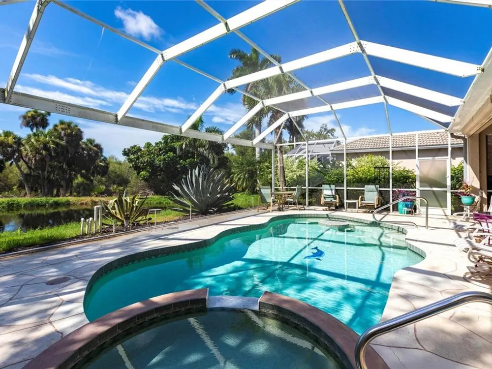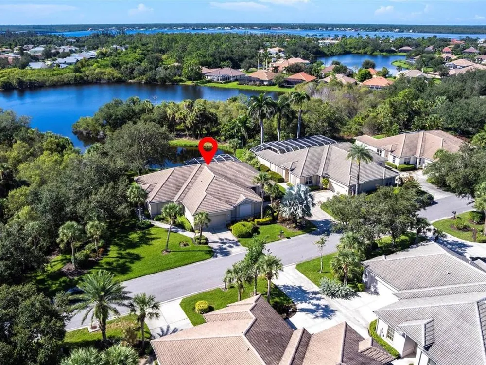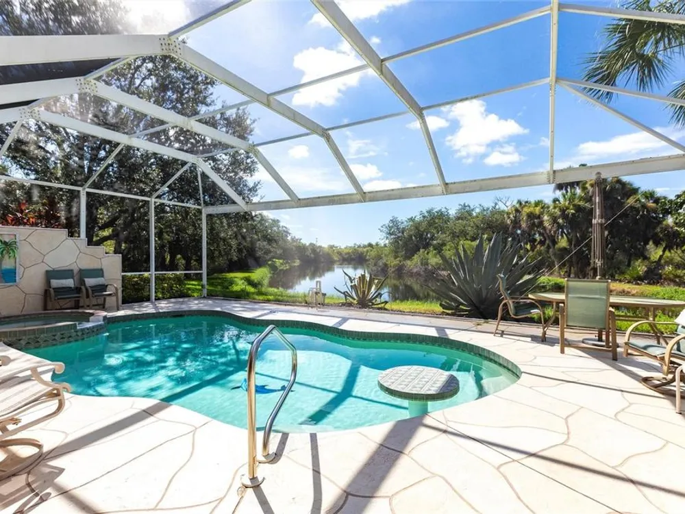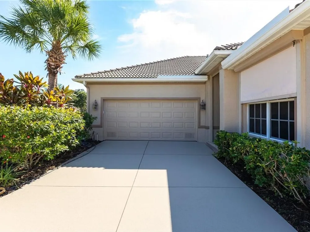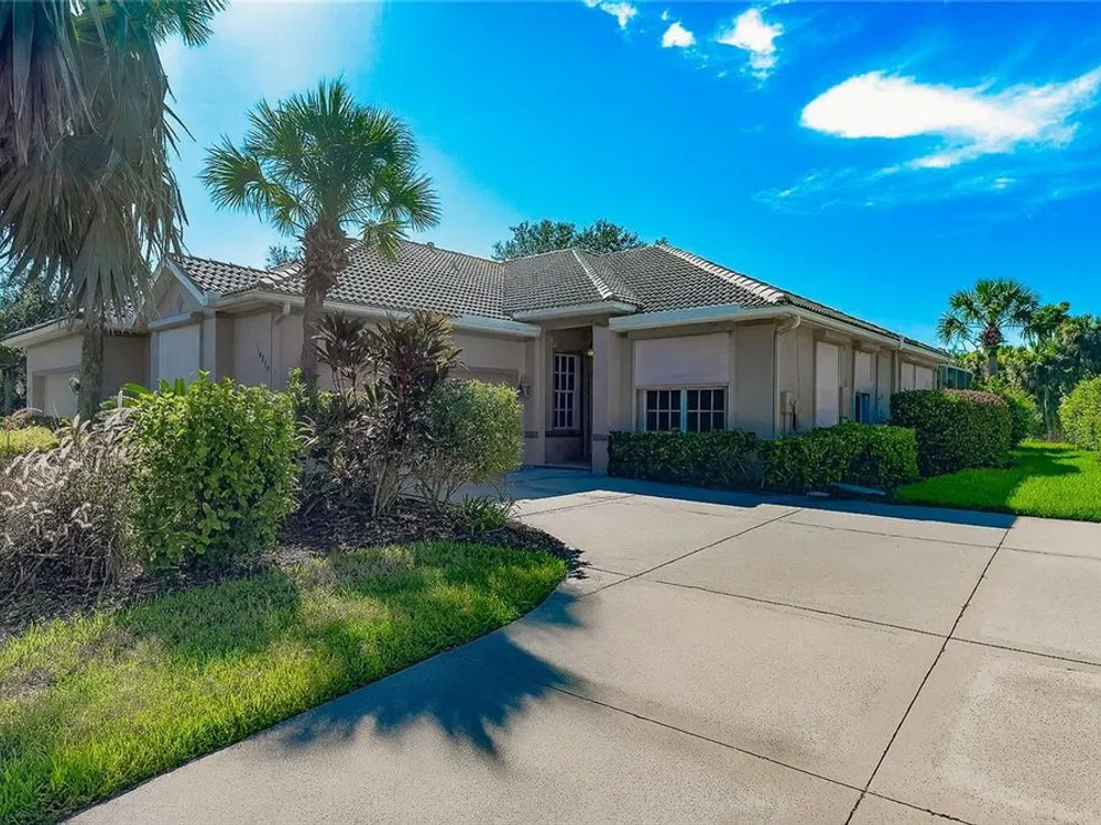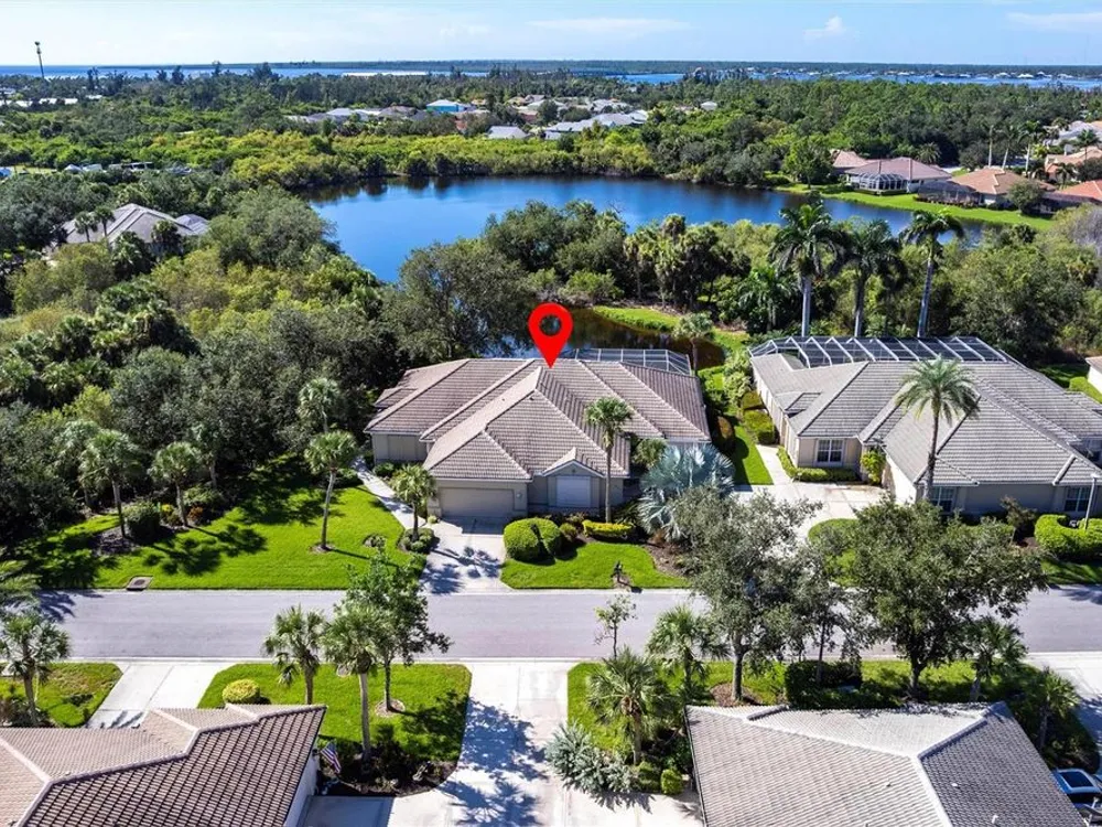 TURNKEY FURNISHED Lakefront Home with Private Pool! Welcome to this beautifully maintained home in the highly sought-after, deed-restricted golf community of Riverwood, complete with a transferable Beach Club membership on Manasota Beach. Ideally situated on a peaceful cul-de-sac, this right-side 1,576 sq. ft. villa offers serene lake views and features 3 bedrooms, 2 bathrooms, a 2-car garage, and a screened-in private pool and lanai—creating the perfect outdoor oasis for entertaining or relaxing in complete privacy. Lush tropical landscaping enhances the home’s curb appeal, while the low-maintenance design makes it ideal for year-round living or seasonal retreats. The open, split floor plan welcomes you with warm laminate flooring throughout the main living areas. High ceilings and sliding glass doors in the living room open to the lanai and pool area, while the dining area features French doors leading directly outside—providing seamless indoor-outdoor flow. The kitchen, the heart of the home, offers solid surface countertops, crisp white cabinetry, coordinating tile backsplash, full appliance package, and abundant storage. The open layout connects it to the living areas, with wood-look flooring and a tropical-inspired ceiling fan adding charm and character. The spacious Primary Suite boasts a generous walk-in closet and en-suite bath with a Roman shower. Two additional bedrooms with ample closet space share a full bathroom—one includes a Murphy bed and desk area, ideal for a home office or flex space. Step outside to your private screened lanai and sparkling pool with spa, overlooking a tranquil waterway. The outdoor area offers ample space for lounging or dining al fresco, surrounded by lush landscaping and peaceful views—the ultimate spot to soak up the Florida lifestyle. Additional features include a laundry room with stackable washer/dryer and utility sink, large two-car garage, generator, hurricane shutters, tile roof, and solar-heated pool. Riverwood is a gated golf community featuring a par-72 championship public course, updated sports campus with state-of-the-art fitness center, zero-entry resort pool, tiki bar, tennis and pickleball courts, and a wide range of fitness and social activities including bocce, croquet, and more. Enjoy scenic walks or bike rides through this pristine community. Separate fees apply for golf club and Manasota Key Beach Club memberships. **PLEASE ENJOY THE 3D INTERACTIVE VIRTUAL TOUR ASSOCIATED WITH THIS LISTING**