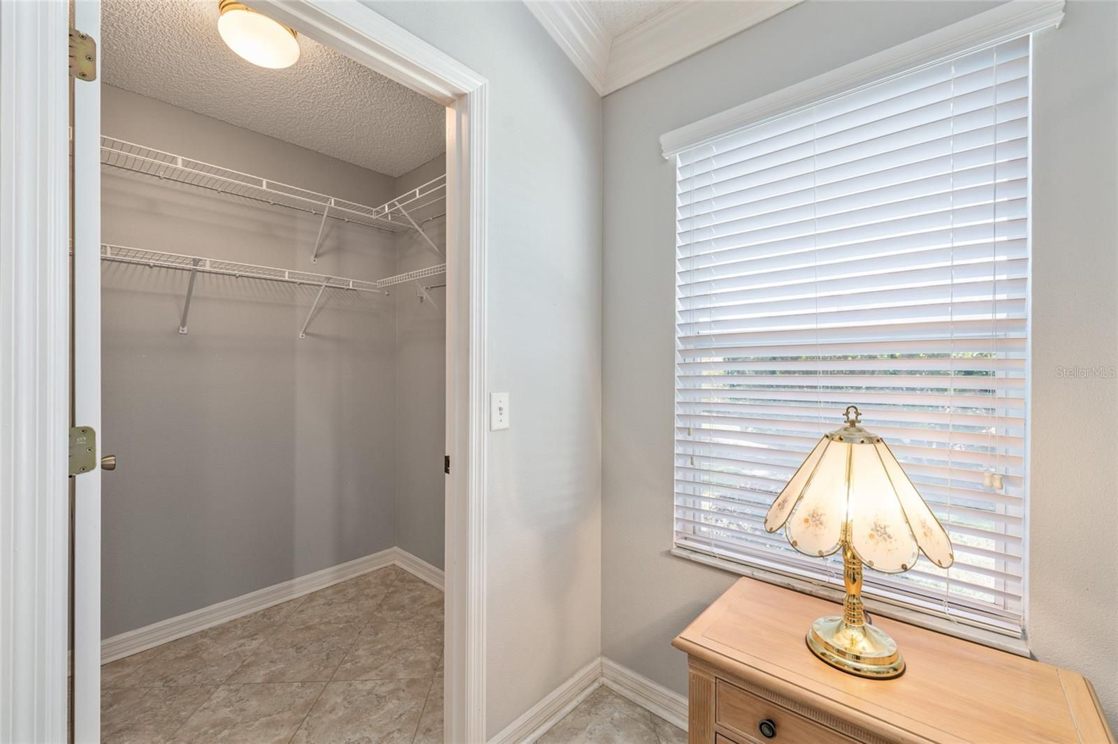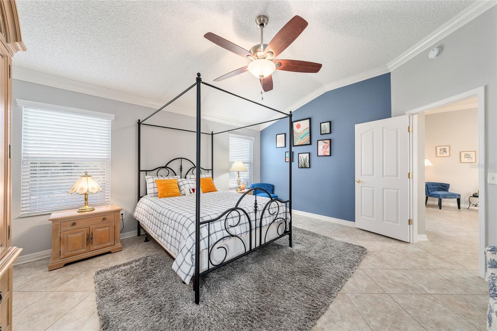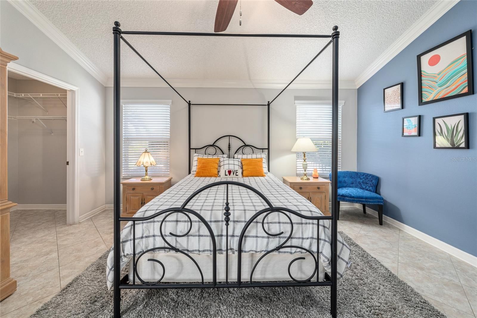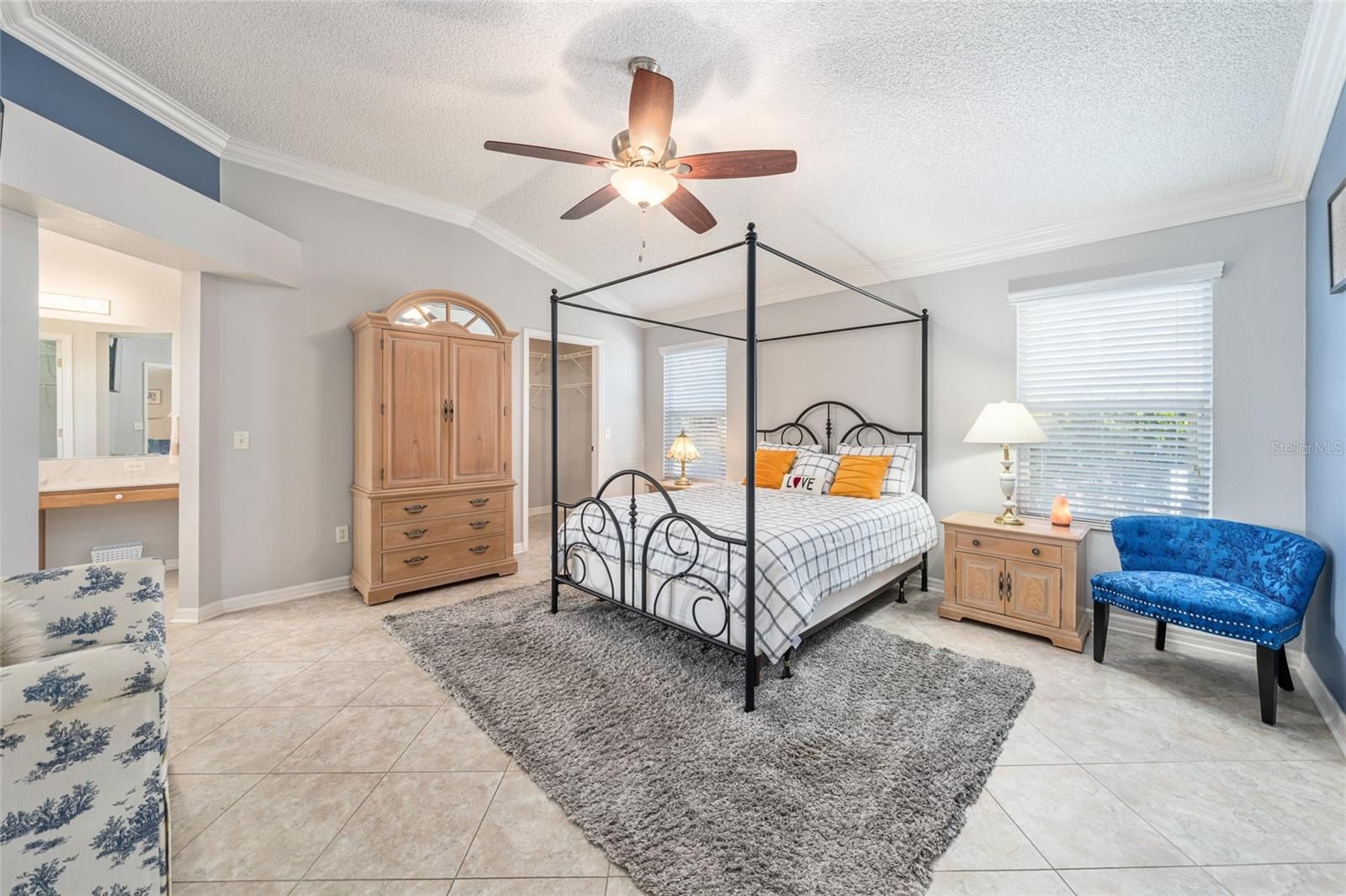 - Ceiling Fan(s), Crown Molding, Eat-in Kitchen, High Ceilings, Living/Dining Room, Solid-Wood Cabinets, Split Bedrooms, Stone Counters, Thermostat, Walk-In Closet(s), Window Treatments