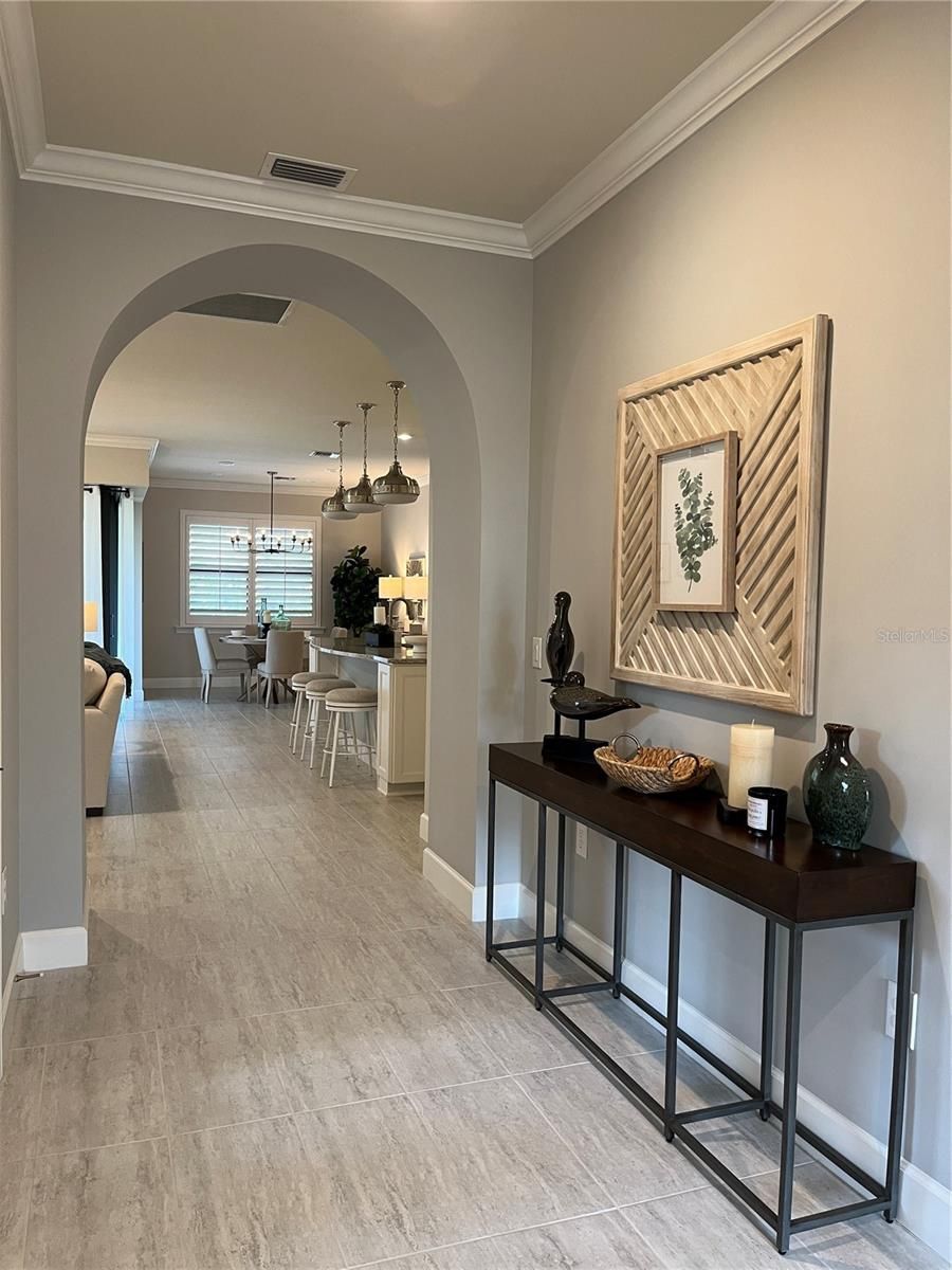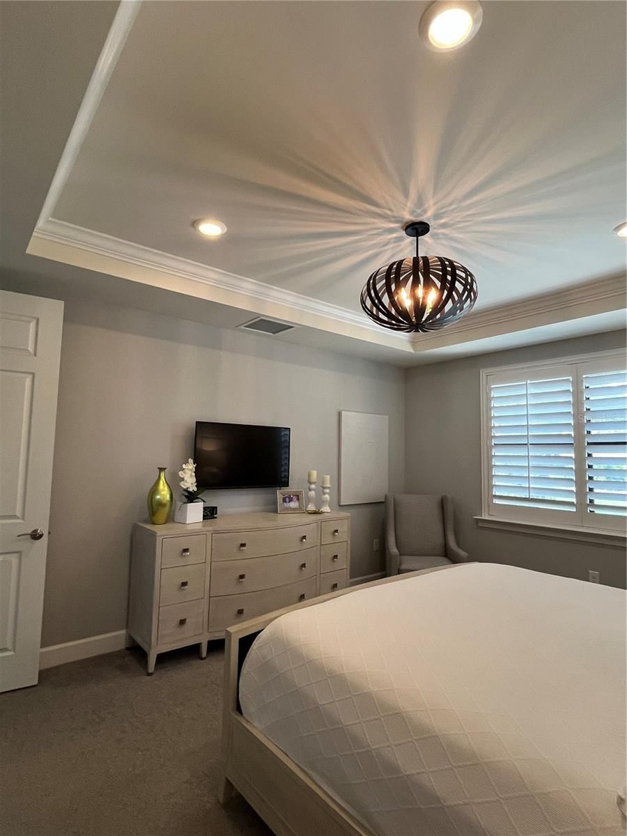 - Ceiling Fan(s), Crown Molding, Eat-in Kitchen, High Ceilings, In-Wall Pest Control, Kitchen/Family Room Combo, Living/Dining Room, Open Floorplan, Upper Level Primary, Smart Home, Solid-Wood Cabinets, Stone Counters, Thermostat, Tray Ceiling(s), Walk-In Closet(s), Window Treatments
