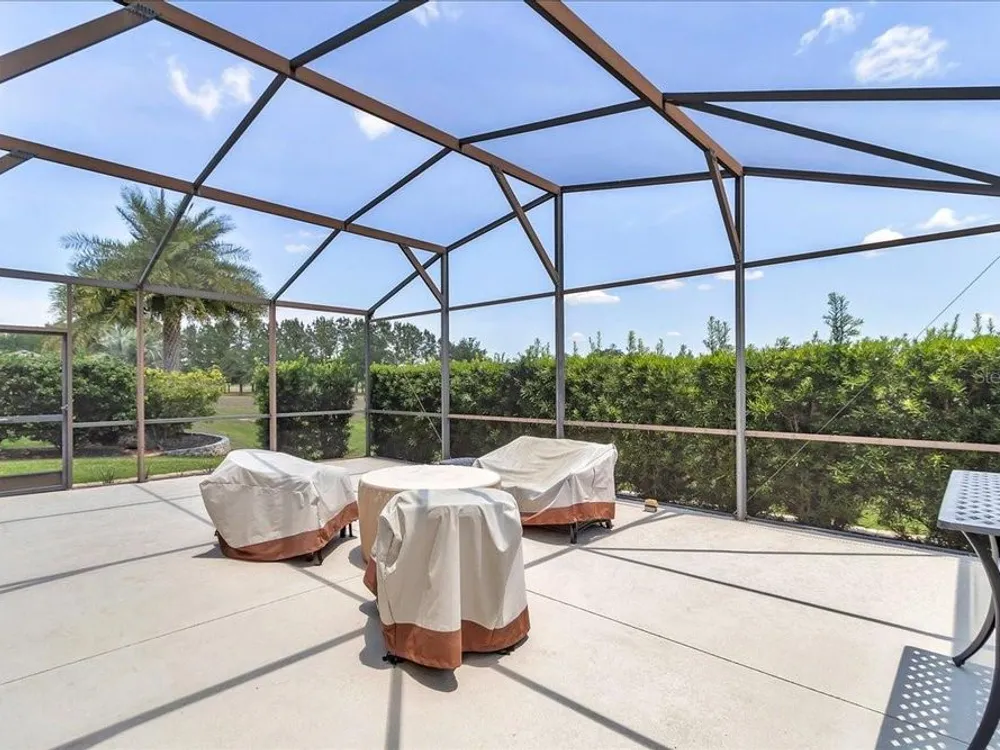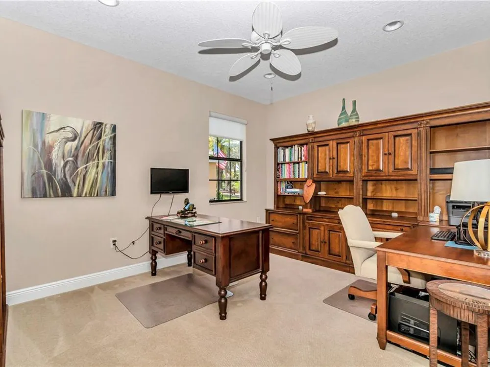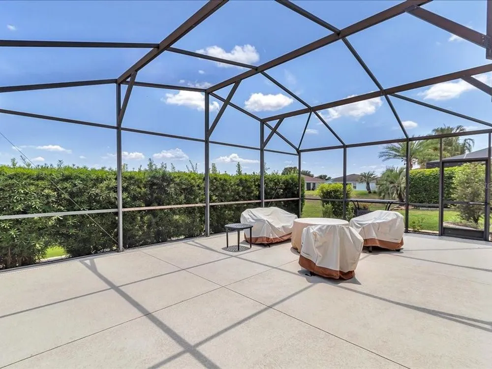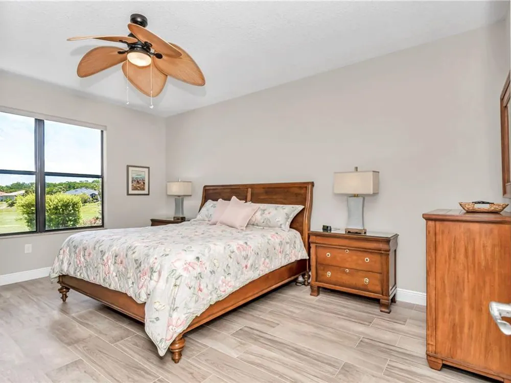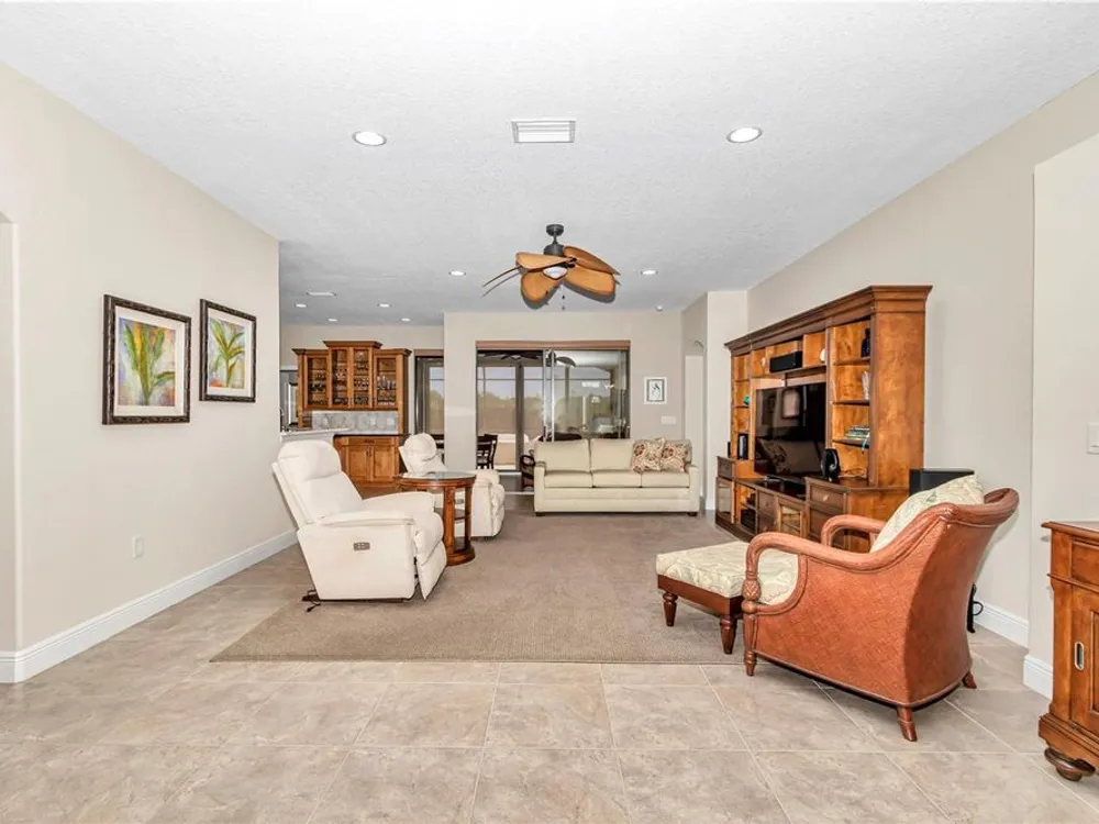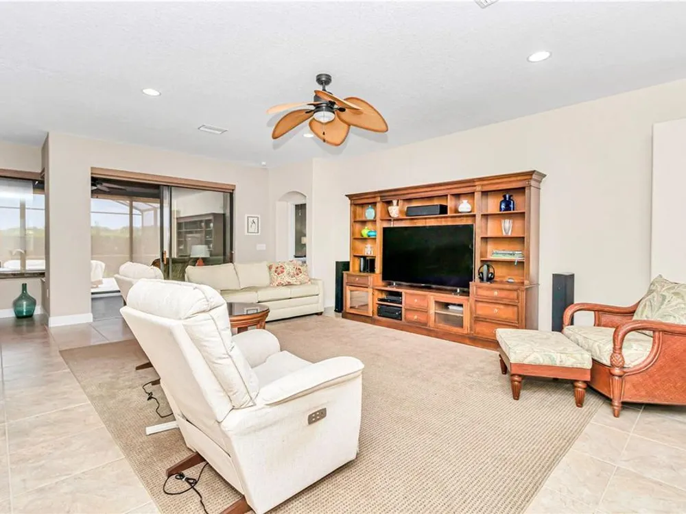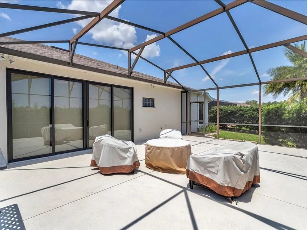 Seller Offering $10,000 in Buyer Advantages! Move right in and enjoy this thoughtfully expanded Jacaranda model, featuring 4 bedrooms, 3 bathrooms, and two versatile bonus rooms ideal for an office, hobby space, guest room, or extra living area. Designed and built by its original owner with a widened footprint for added comfort, this home is tucked away on a peaceful cul-de-sac for extra privacy. The chef’s kitchen shines with a premium Thermador gas range, custom cabinetry, granite countertops, and a walk-in pantry. The open living and dining areas flow beautifully to an expansive screened lanai, perfect for entertaining or relaxing year-round. One wing offers a spacious private room large enough to serve as a true in law suite or multi-generational retreat. A separate bonus room includes a built in Murphy bed, making it an ideal flex space for guests or hobbies. The garage is widened by 5 feet, extended 8 feet deep, and includes a dedicated golf cart bay, providing exceptional storage and functionality. Upgrades include a new roof (2024), HVAC (2022), fresh interior paint, custom closet systems, solar attic fans, and lush tropical landscaping. Enjoy the resort-style 55+ community amenities like a sparkling pool, pickleball, spa, fitness center, social events, and a brand new on site restaurant. HOA fees include internet, cable, lawn care & more, creating a true low-maintenance lifestyle.