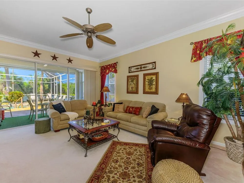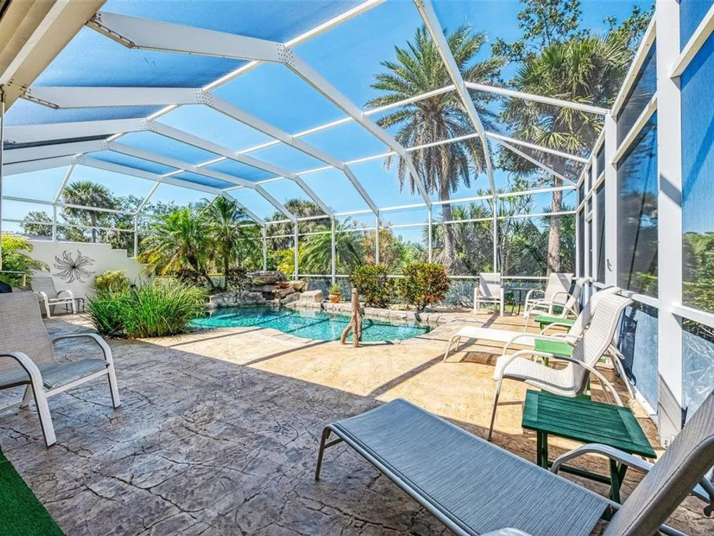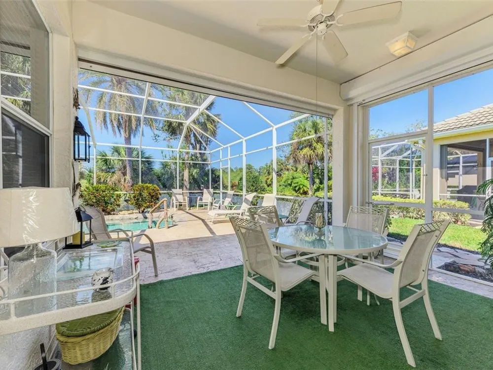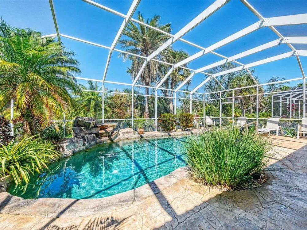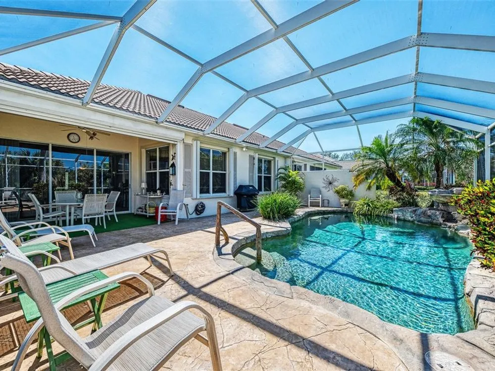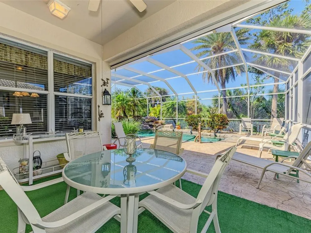DISCOVER FLORIDA CHARM by owning this FURNISHED JUNIPER VILLA. Nestled on a premium landscaped lot, this beautiful villa offers serene preserve views and desirable privacy from an expansive 25’ x 10’ screened lanai. Enjoy the ultimate Florida lifestyle with a custom rocked, heated pool with decorative fountain, all complemented by a 14’ x 8’ covered outdoor area. Your own TROPICAL OASIS perfect for relaxing in the sunshine or entertaining guests. Inside, the villa features a spacious Great Room, a 3rd Bedroom utilized as a Den, a well-appointed Kitchen with a breakfast bar, a Dining Area, a Guest Bedroom, and an attached 2-car garage. Elegant details include crown molding, custom window treatments, ambient lighting, and tile flooring throughout the Primary Suite, which also boasts a generous walk-in closet. BONUS: This home comes with a turn-key furniture package, upgraded Storm Shutters for peace of mind, and HOA dues include all exterior maintenance, offering peace of mind and true lock-and-leave convenience. Experience Resort-Style Living at Riverwood Set on 1,300 acres along the scenic Myakka River in Port Charlotte—conveniently located between Fort Myers and Sarasota—Riverwood is a premier Southwest Florida gated community. Amenities include 4.5-star Golf Digest-rated golf course. Exclusive private Beach Club on the Gulf of Mexico. Recreational Center with a state-of-the-art fitness room, Junior Olympic-size pool, Tennis and Pickleball courts A wide array of classes, social events, and clubs. Explore the nearby world-class beaches, boating, fishing, marinas, and an abundance of cultural experiences. Golf and Beach Club memberships available (subject to availability).Call the agent today for details and immerse yourself in the unique charm of Riverwood—where resort living meets natural beauty!