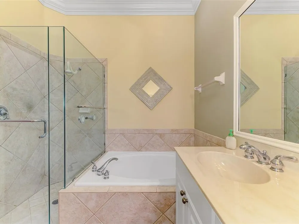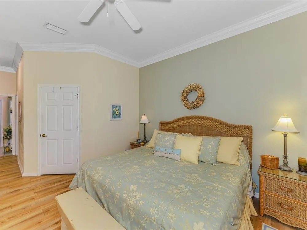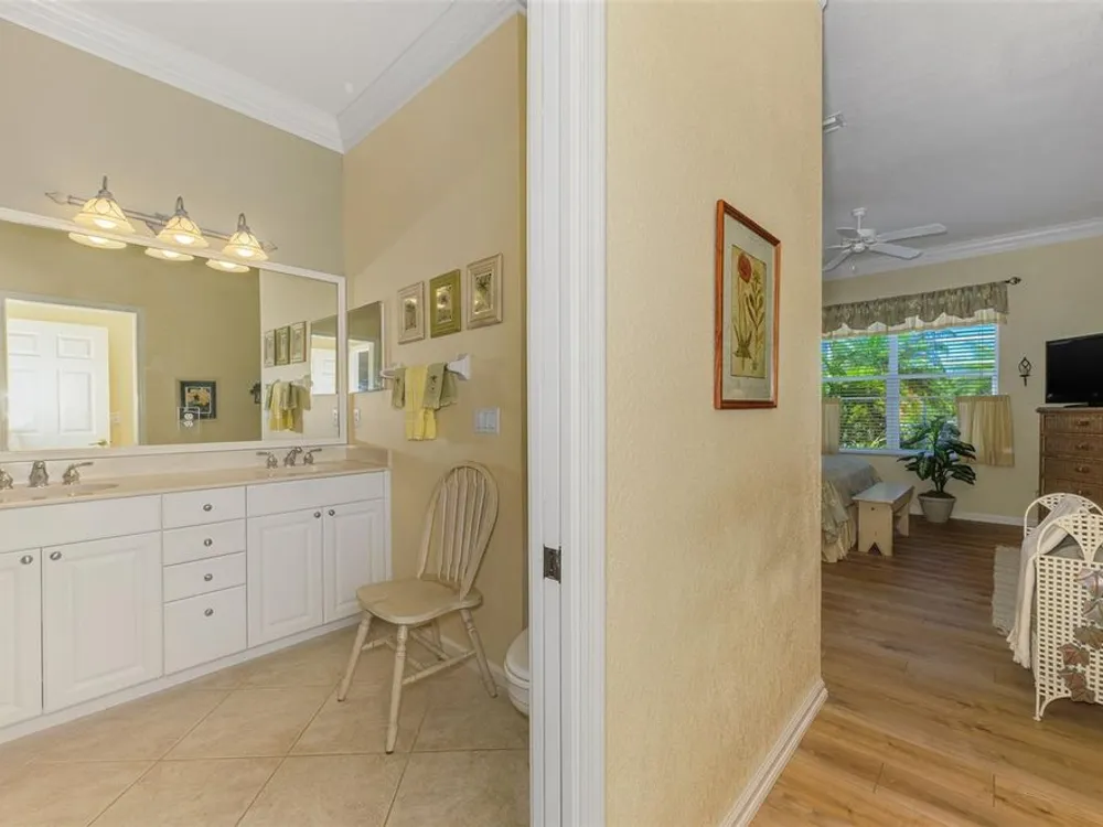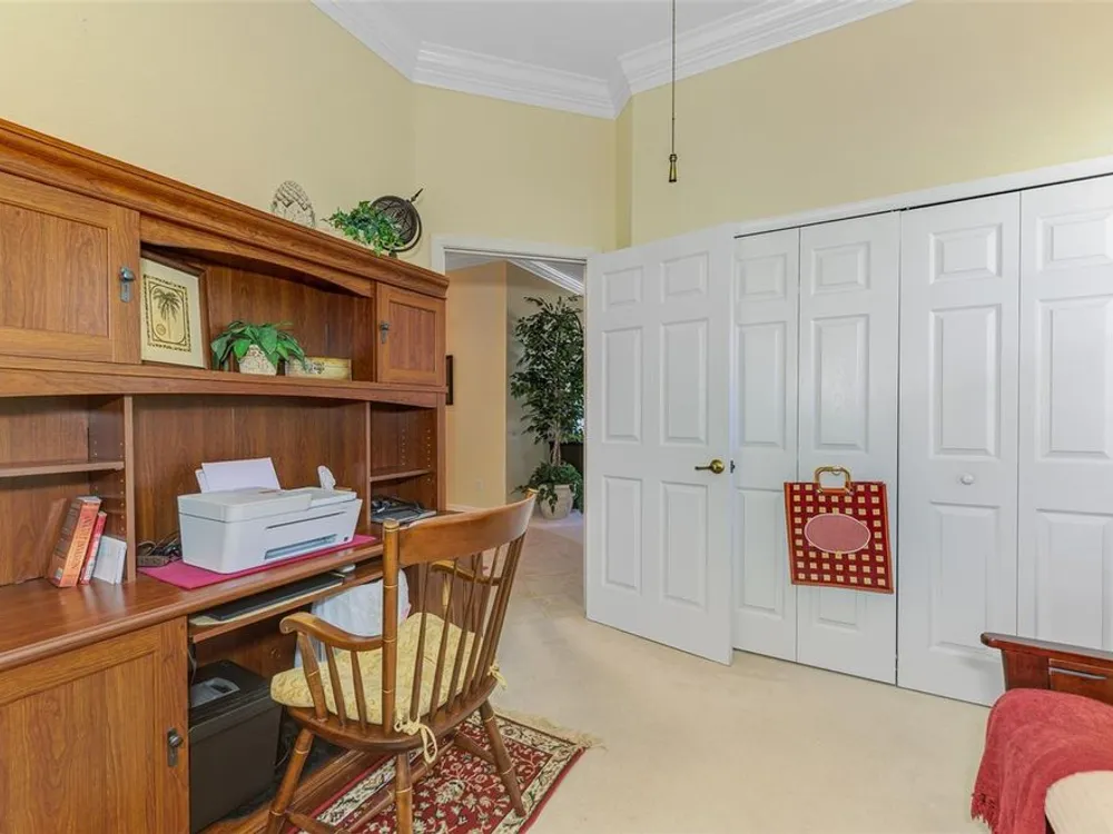 - Ceiling Fan(s), Crown Molding, High Ceilings, Open Floorplan, Solid Surface Counters, Walk-In Closet(s), Window Treatments
