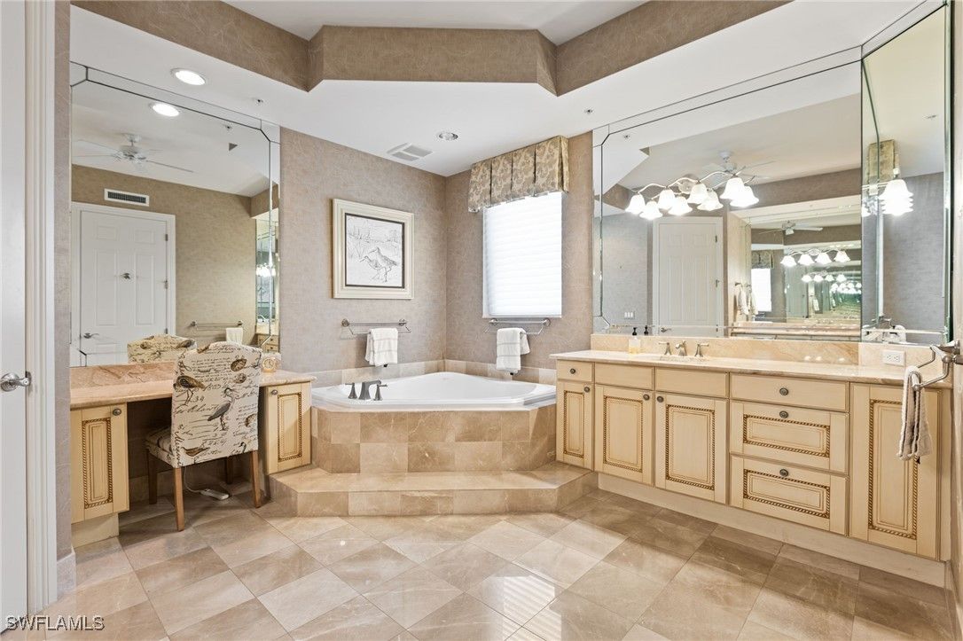 - Wet Bar, Breakfast Bar, Built-in Features, Bathtub, Tray Ceiling(s), Dual Sinks, Entrance Foyer, Eat-in Kitchen, Jetted Tub, Kitchen Island, Living/Dining Room, Custom Mirrors, Separate Shower, Cable TV, Bar, Walk-In Closet(s), Window Treatments, Elevator, High Speed Internet, Split Bedrooms