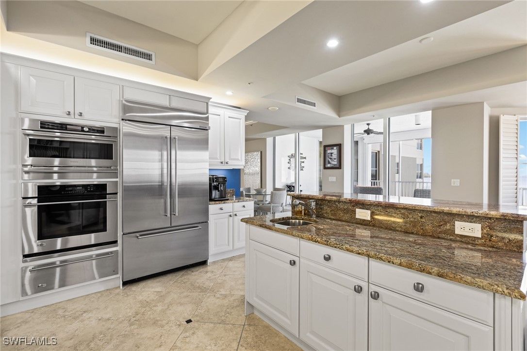 Significant price reduction!! Welcome to The Paramount, the crown jewel and most prestigious condominium building in Gulf Harbour Yacht & Country Club. This furnished condo offers 3 bedrooms, 3.5 baths and over 3,300 sq. ft. of elegant waterfront living with sweeping river and golf course views and a marina for your boat just outside your door. Located within easy walking distance, to the newly renovated, soon to be completed, club house and new fitness facilities with state-of-the-art equipment. Building highlights — unmatched service and amenities: *Gated, secure building with two on-site full-time maintenance managers who deliver packages to your door daily and assist with resident needs *Resort-style pool with hot tub spa, private fitness facility with sauna *Large social/meeting room with expansive outdoor lanai, full kitchen, clear-ice maker and bar area for large gatherings *Billiard’s area and 8-seat poker table *Conference room available for private meetings *Private secure mailroom *Immaculate, enclosed secure garage with two assigned parking spaces. Indoor golf cart parking stations with electricity is also available *Impressive, expansive lobby to greet your guests. Step off your private elevator (one of three elevators to the unit) into a gracious foyer and an open floor plan designed for entertaining. The gourmet kitchen features granite counters, tumbled marble backsplash, under and above-cabinet lighting, KitchenAid dishwasher, GE Advantium Speed oven, GE convection oven, warming drawer and built-in KitchenAid French door refrigerator. A full wet bar with wine cooler complements the living and dining areas. The luxurious primary suite offers a custom walk-in closet, and a spa-like bath with separate granite vanities, sitting area, jetted soaking tub and walk-in marble shower. Two ensuite guest suites include one with cherry hardwood and a private lanai overlooking the golf course. Enjoy beautiful sunsets and panoramic water views from the screened lanai accessible from the kitchen, family room and primary suite with Roll Secure hurricane shutters Lots of storage in this unit with an additional large climate-controlled storage unit on the first floor, Recent systems and upgrades within 4 years include two A/C units, 2022 60-gallon water heater with circulating pump, whole-house Kinetico water softener/conditioner and Water Cop main shut-off, washer/dryer, dishwasher, refrigerator and speed oven. Private memberships are available for immediate access to Gulf Harbour’s world-class golf course, marina, dining and fitness facilities. Once you experience the level of luxury, service and amenities at The Paramount, you will never want to leave.