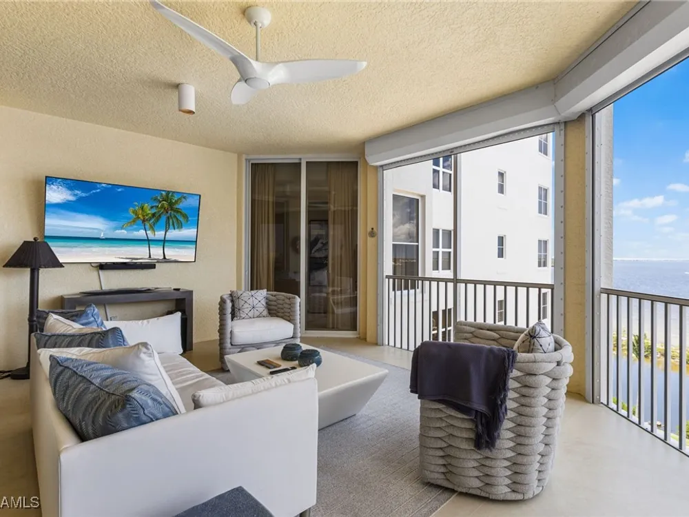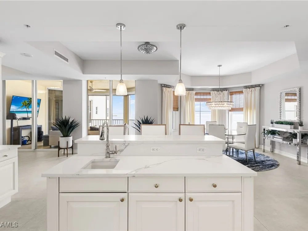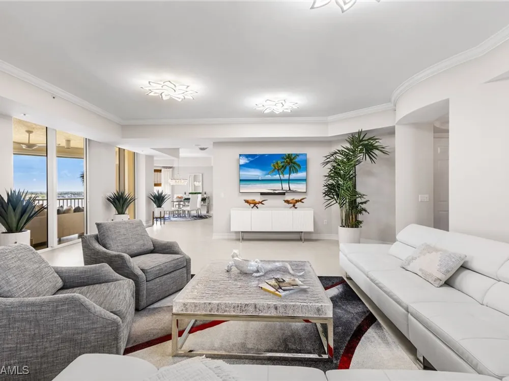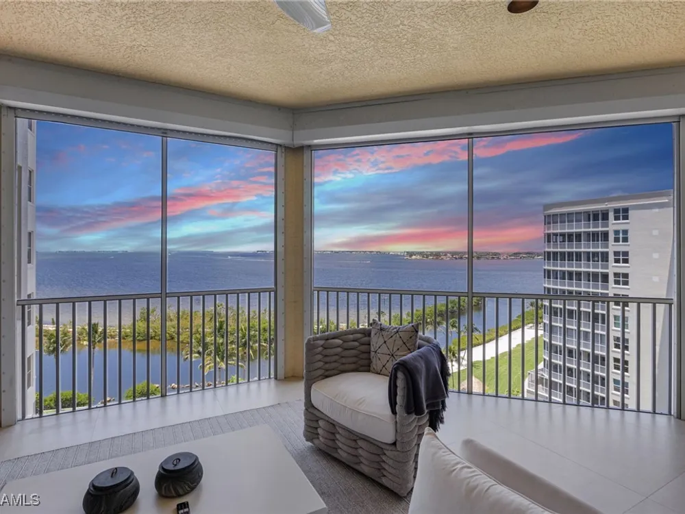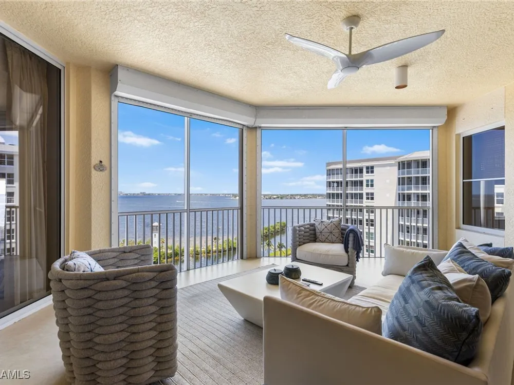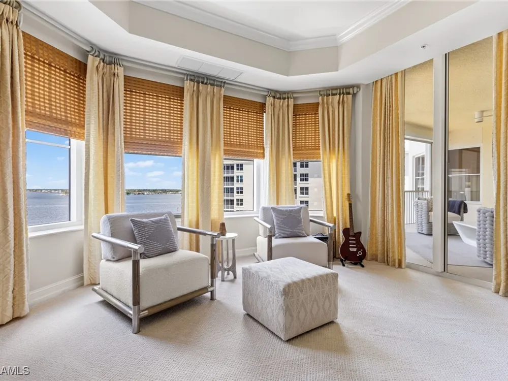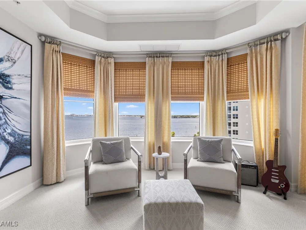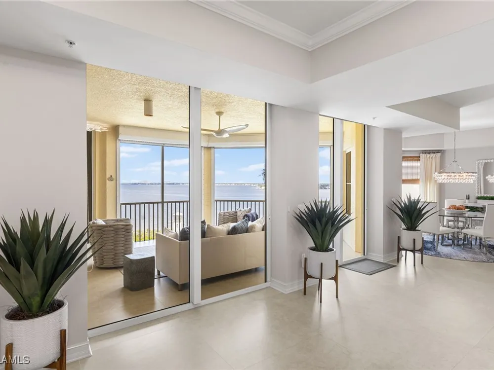TEMPORARILY - SPORTS MEMBERSHIP JOINING FEE HAS BEEN REDUCED BY $32,000! Take advantage now of Gulf Harbour’s temporary reduction. For a limited time you can obtain a sports membership for a joining fee of $20,000. Light-Filled Luxury with Unmatched Sunset Views at The Paramount in Gulf Harbour Experience elevated coastal living in one of Gulf Harbour’s most prestigious addresses—The Paramount. This stunning Torriera floorplan residence features 3 bedrooms, 3.5 baths, and offers a sprawling 3,340 sq. ft. of beautiful living space, complete with breathtaking panoramic westerly waterfront views that deliver spectacular sunsets nightly is being sold turnkey. Step off your private elevator into an Artist Hand-Painted foyer that sets the tone for the thoughtful elegance throughout. Redesigned and remodeled in 2022, the home features a seamless flow of 24” x 24” quartz-infused flooring extending from the living area to the lanai. The gourmet kitchen is a showstopper, boasting marble countertops, white appliances, a warming drawer, center island, built-in desk, and ample space for both function and style. The great room opens to a riverfront lanai with sunshades, perfect for entertaining or relaxing while taking in the tranquil water views. The primary suite is a true retreat with its own waterfront seating area, dual marble vanities, zen soaking tub, walk-in shower, and dressing area. Enormous walk in closet.Both guest bedrooms are private ensuites, one featuring its own lanai with views of the golf course, lakes and downtown Ft. Myers. Additional highlights include: • Wet bar and wine cooler with marble counters • Artist Hand-Painted powder bath and unique lighting throughout • Crown molding, new carpet, and fresh interior paint • Hurricane-rated windows, doors, and shutters on both lanais • Large laundry room • A/C storage area • Two deeded parking spaces Enjoy resort-style amenities without ever leaving the building, including a community pool, fitness room, steam room, meeting room, and BBQ area—all within The Paramount. This residence represents the pinnacle of high-rise luxury and is move-in ready for the discerning buyer. Private memberships to Gulf Harbour are available for a separate purchase. Don't miss the 2 awe-inspiring videos!