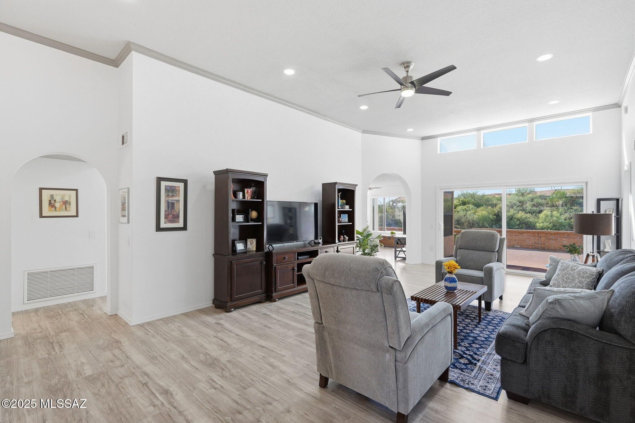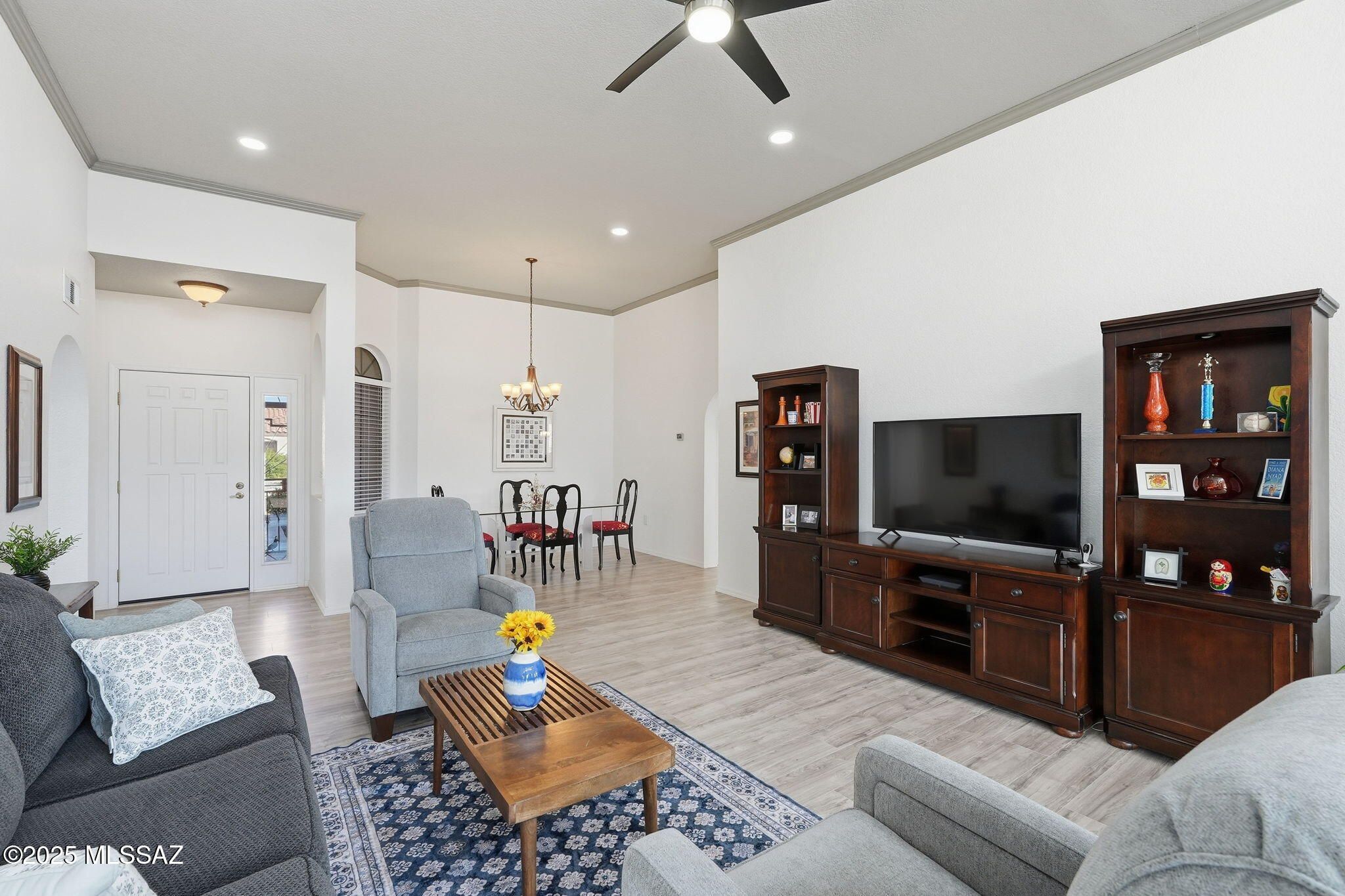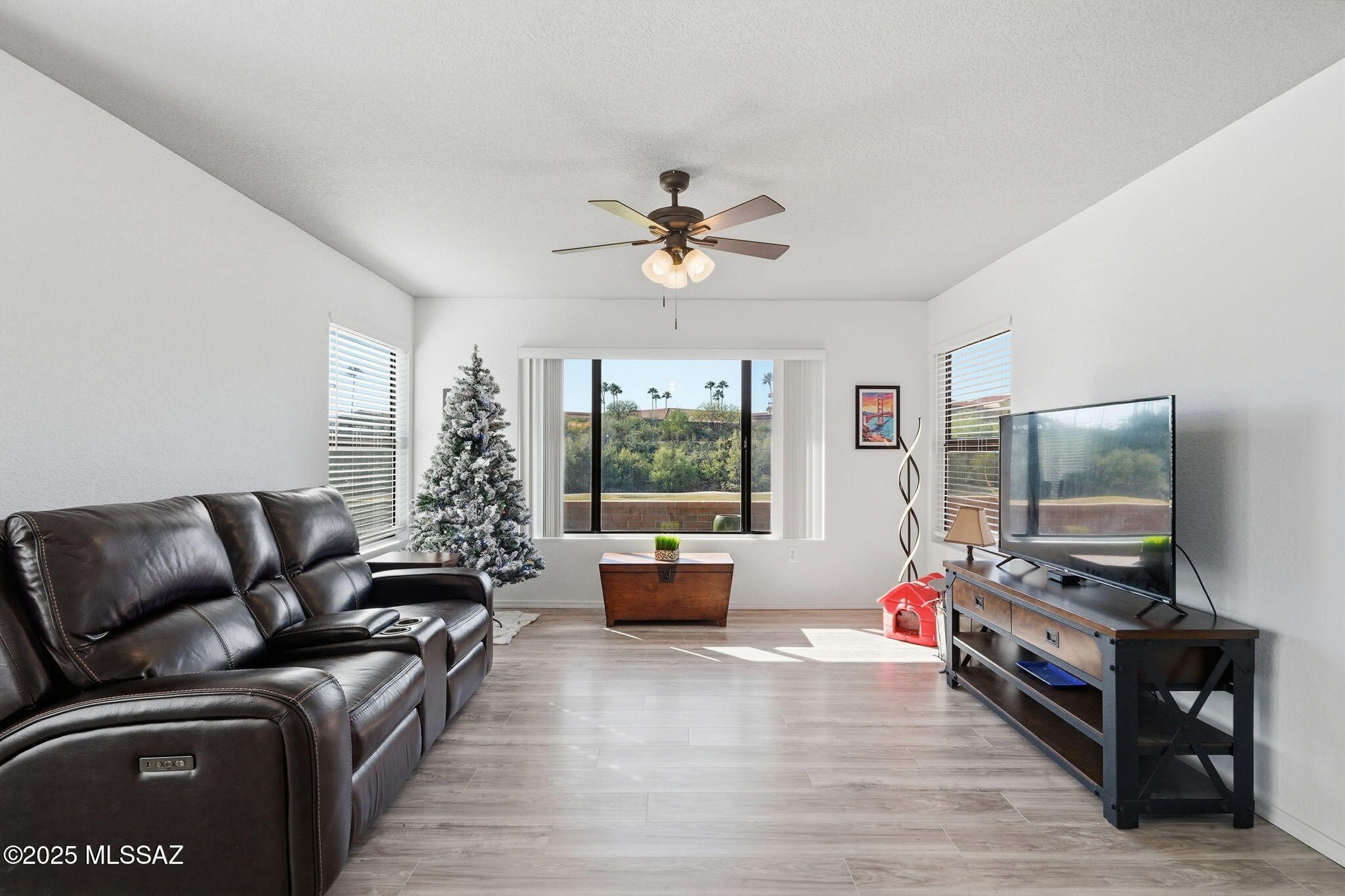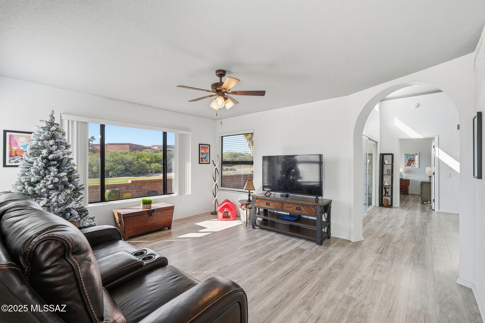Beautifully updated 2BD/2BA Valencia model (1,753 sq ft) on an elevated golf-course lot in Sun City Oro Valley. Enjoy mountain and fairway views from the covered patio. This move-in ready home features a newly renovated kitchen with new shaker cabinets, new granite counters, and new stainless appliances. Updates include new luxury vinyl plank flooring, new recessed lighting, new blinds, new ceiling fans, and fresh interior and exterior paint. New roof (2024) and new HVAC (2024) provide peace of mind. Epoxy driveway, indoor laundry, and lemon tree complete this exceptional home. Resort amenities include golf, pools, fitness, tennis, pickleball, and clubs.