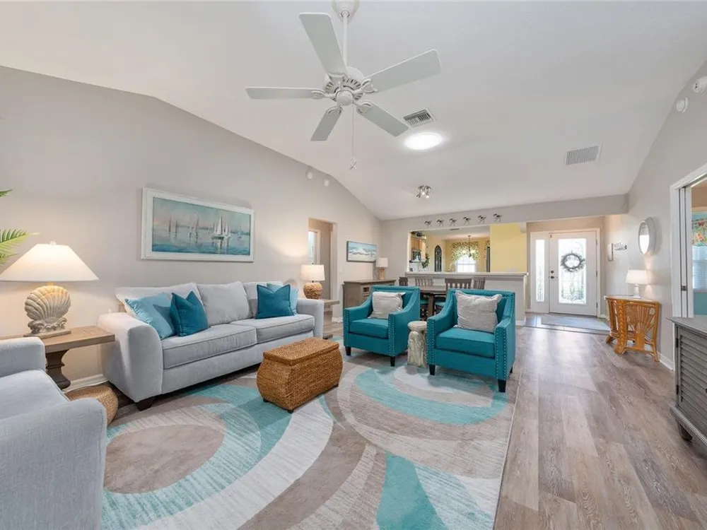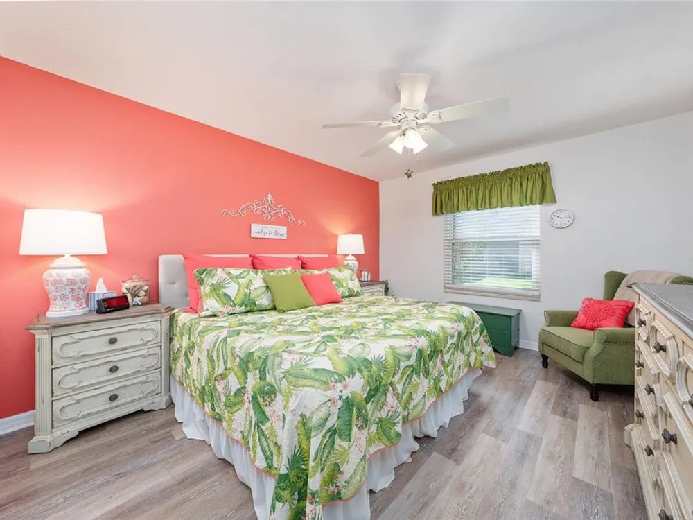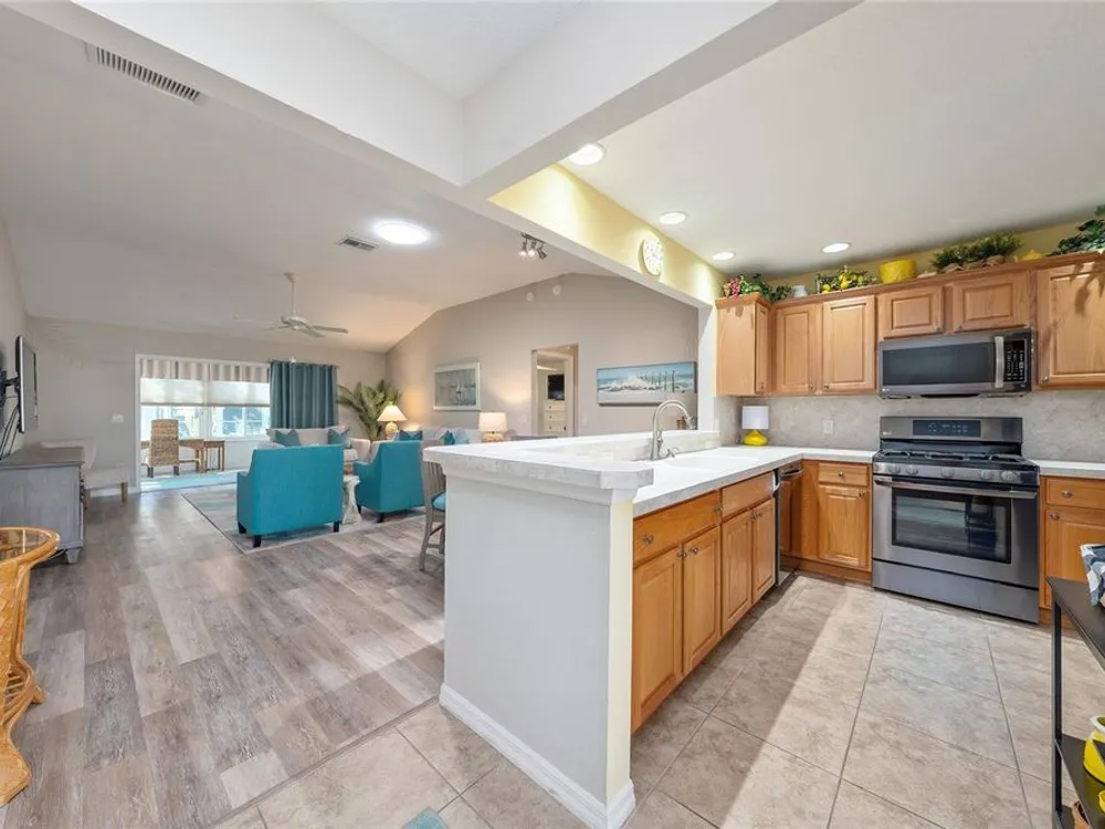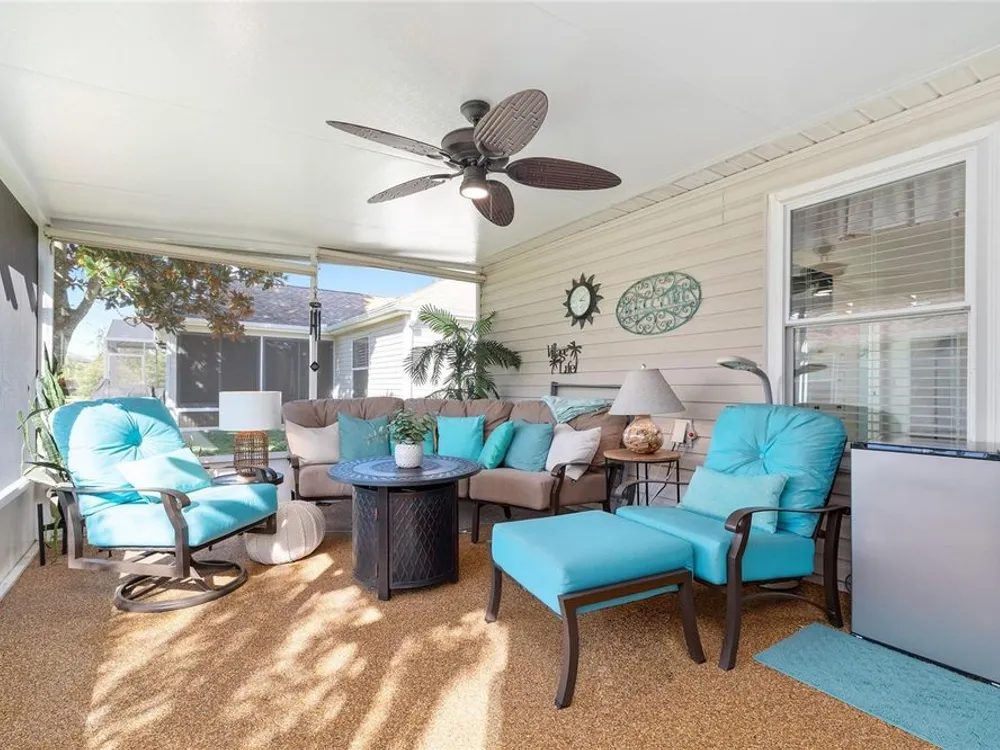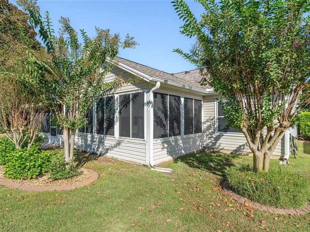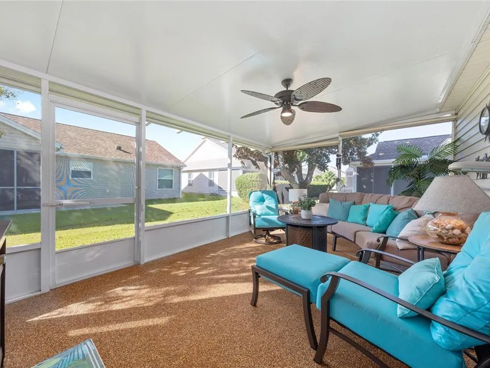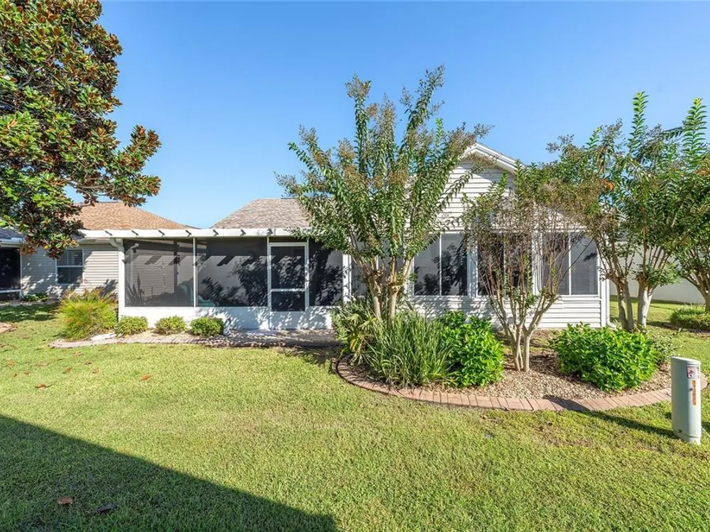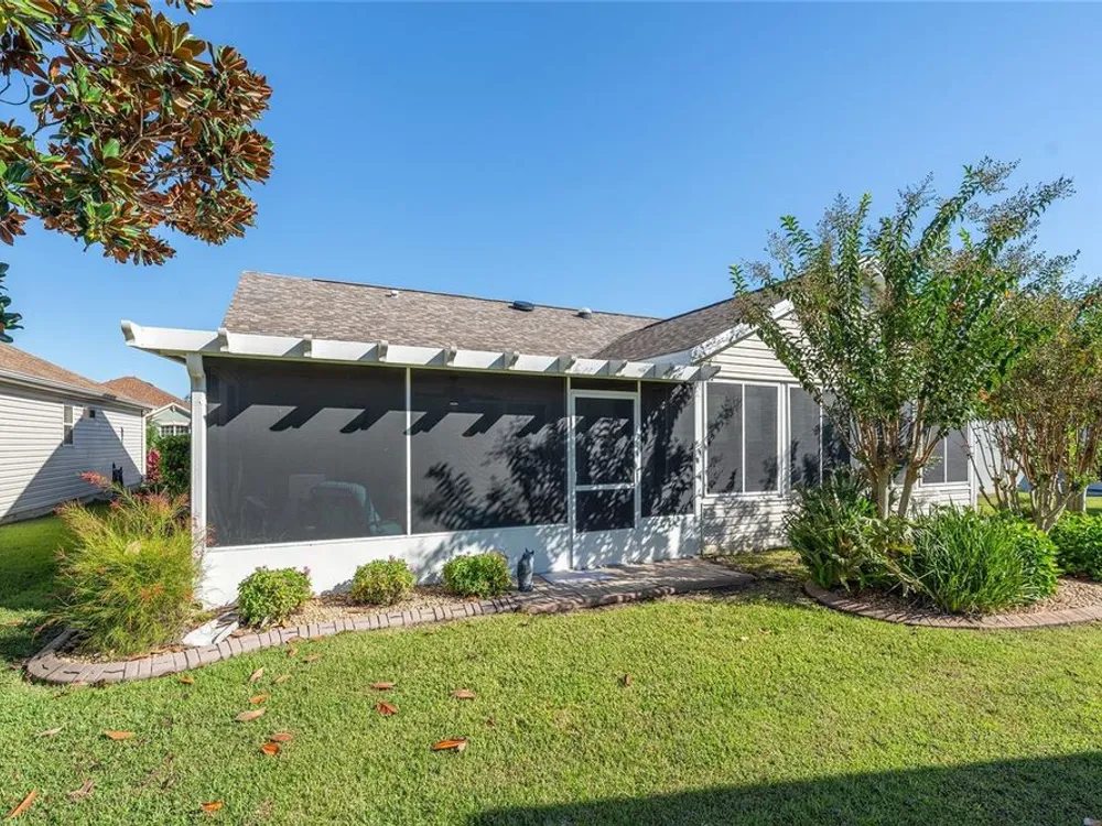 BOND PAID & TURN-KEY! This beautifully maintained 3/2 Wisteria Designer offers 1,512 sq ft under heat and air, plus an additional 240 sq ft bonus room. Every inch of this home reflects care, comfort, and attention to detail, with an inviting open layout that captures the relaxed, joyful spirit of life in The Villages®. The open-concept design fills the home with natural light, complemented by luxury vinyl plank flooring that adds warmth and elegance. Step through to the enclosed patio and covered outdoor area—perfect for morning coffee or evening gatherings with friends. The kitchen shines as the heart of the home, featuring newer smudge-resistant stainless-steel appliances, pull-out cabinetry, a spacious breakfast bar, and ample counter space. Its open sightlines connect seamlessly to the dining and living areas, making entertaining or everyday living effortless. The primary suite offers a peaceful retreat with vaulted ceilings, a large walk-in closet, and an ensuite bath with dual sinks, a walk-in shower, and abundant natural light—creating a true sanctuary for rest and relaxation. The bonus room adds 240 sq ft of heated and cooled flexibility, complete with full A/C ductwork, epoxy flooring, and a ceiling fan—ideal for a den, craft studio, home office, or second living area. Outdoors, enjoy an inviting enclosed patio with epoxy flooring, a ceiling fan, and a tranquil setting surrounded by low-maintenance landscaping. Whether entertaining or unwinding, this home offers the perfect blend of comfort, versatility, and classic Villages charm.