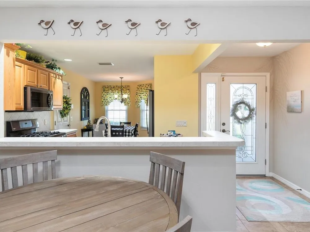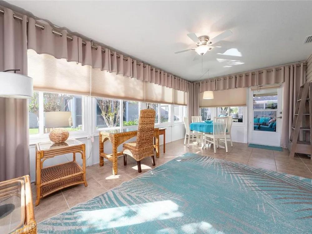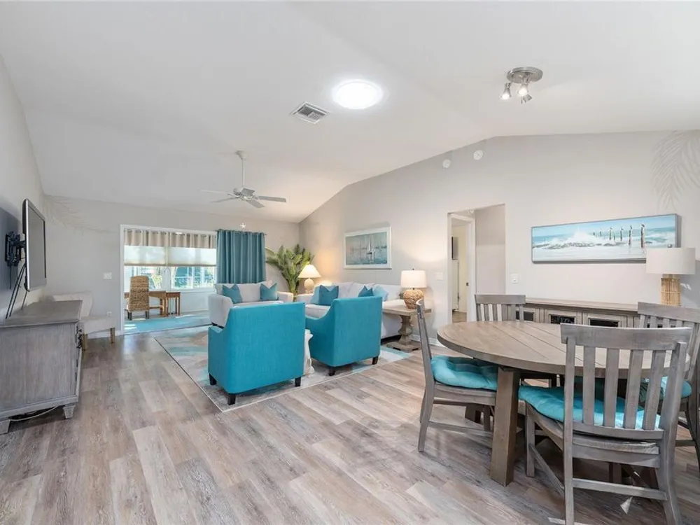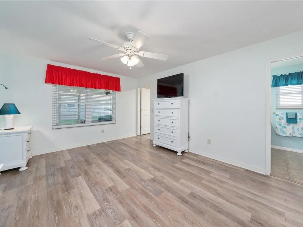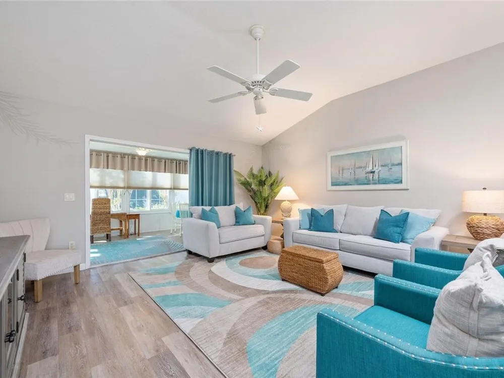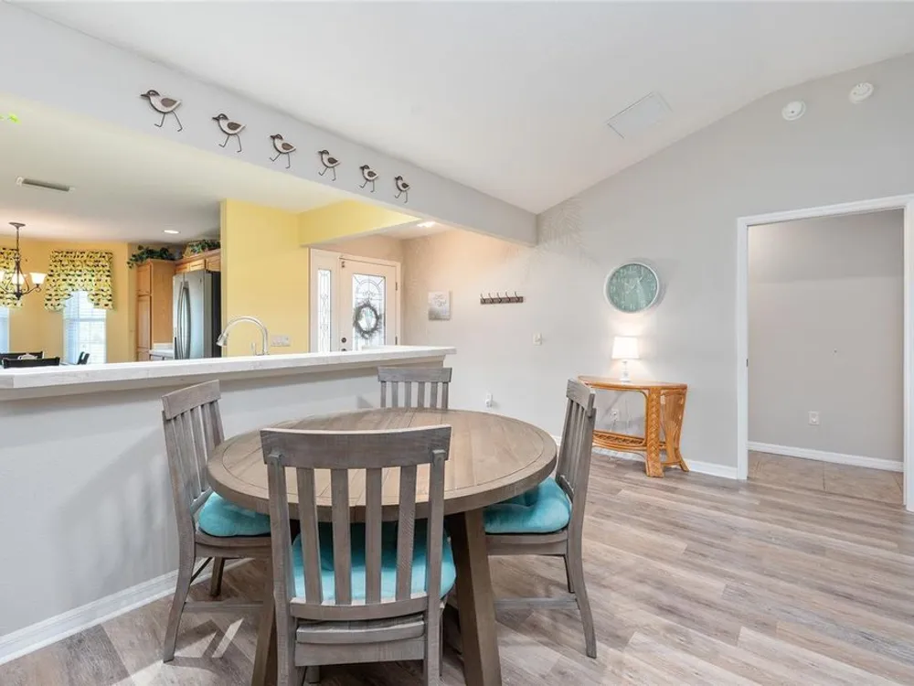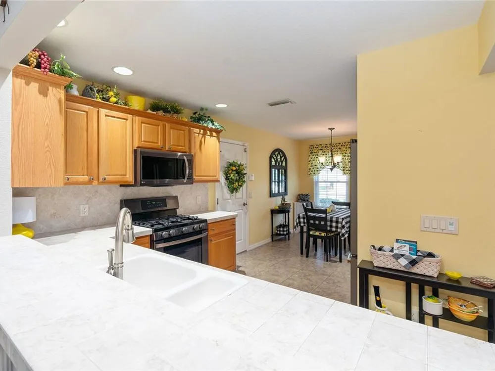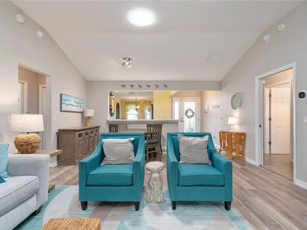 BOND PAID & TURN-KEY! This beautifully maintained 3/2 Wisteria Designer offers 1,512 sq ft under heat and air, plus an additional 240 sq ft bonus room. Every inch of this home reflects care, comfort, and attention to detail, with an inviting open layout that captures the relaxed, joyful spirit of life in The Villages®. The open-concept design fills the home with natural light, complemented by luxury vinyl plank flooring that adds warmth and elegance. Step through to the enclosed patio and covered outdoor area—perfect for morning coffee or evening gatherings with friends. The kitchen shines as the heart of the home, featuring newer smudge-resistant stainless-steel appliances, pull-out cabinetry, a spacious breakfast bar, and ample counter space. Its open sightlines connect seamlessly to the dining and living areas, making entertaining or everyday living effortless. The primary suite offers a peaceful retreat with vaulted ceilings, a large walk-in closet, and an ensuite bath with dual sinks, a walk-in shower, and abundant natural light—creating a true sanctuary for rest and relaxation. The bonus room adds 240 sq ft of heated and cooled flexibility, complete with full A/C ductwork, epoxy flooring, and a ceiling fan—ideal for a den, craft studio, home office, or second living area. Outdoors, enjoy an inviting enclosed patio with epoxy flooring, a ceiling fan, and a tranquil setting surrounded by low-maintenance landscaping. Whether entertaining or unwinding, this home offers the perfect blend of comfort, versatility, and classic Villages charm.