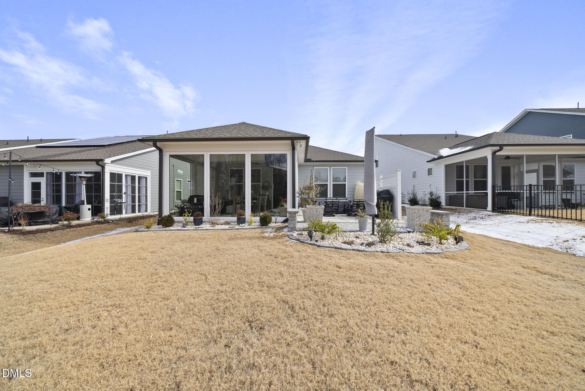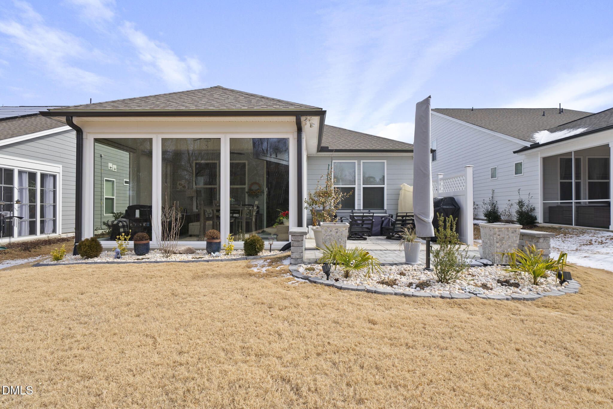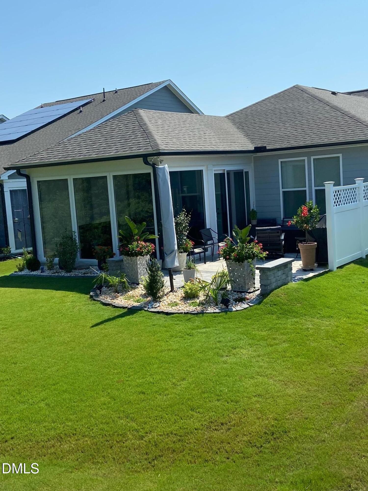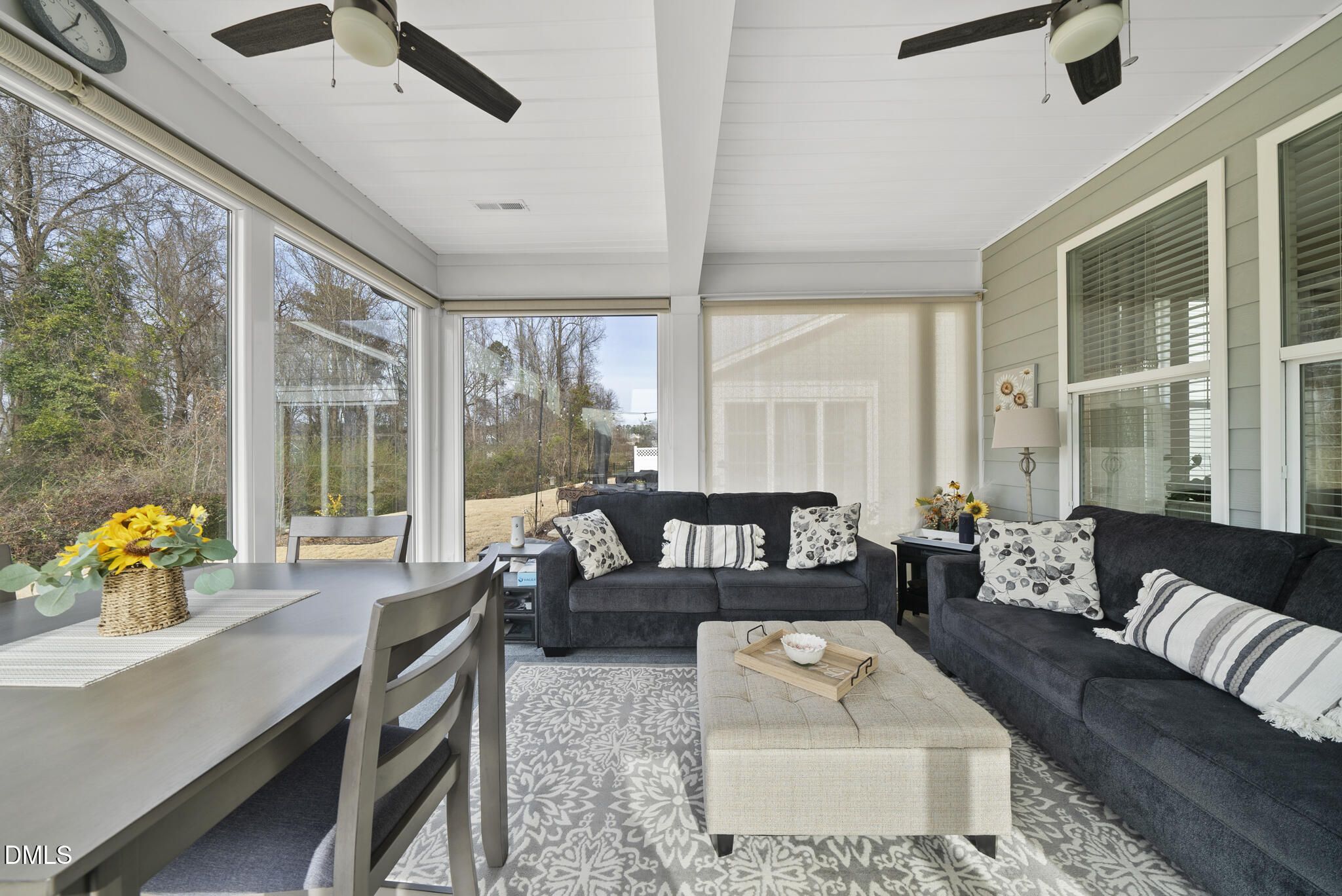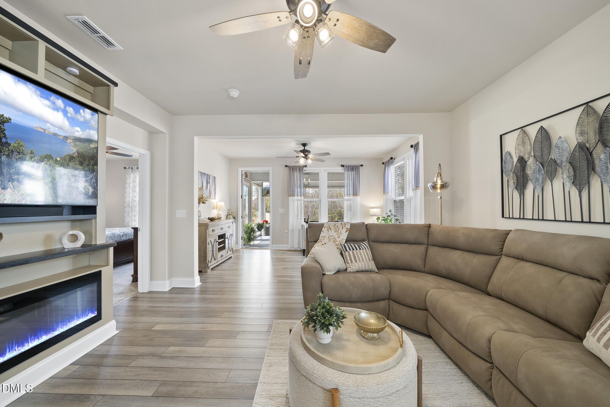 Come see this enhanced Alpine design with additional square footage, located in the highly desirable Carolina Gardens by Del Webb community. This beautifully appointed single-story home features an upgraded exterior elevation and professionally designed landscaping with decorative curb edging, delivering outstanding curb appeal. Inside, the open-concept floor plan is enhanced by an extended gathering room featuring a custom built-in electric fireplace with integrated entertainment center, creating a warm and stylish focal point for everyday living and entertaining. A professionally added four-season sunroom expands the home's living area and adds valuable square footage while offering serene wooded views, providing bright, year-round enjoyment and a peaceful connection to nature. The kitchen anchors the home with a spacious center island, ample cabinetry, and modern finishes, all open to the dining area and gathering room for effortless living. The private owner's suite serves as a relaxing retreat and features a generous walk-in closet with custom shelving, along with a spa-inspired bath. A secondary bedroom and full bath provide ideal flexibility for guests or hobbies. Step outside to enjoy the custom back patio hardscape with privacy fencing, ideal for outdoor dining, relaxing, or entertaining. Additional highlights include energy-efficient construction, a two-car garage, and garage attic access with a sturdy aluminum ladder leading to a floored attic storage area, offering exceptional additional storage. Residents of Carolina Gardens by Del Webb enjoy resort-style amenities, an active social calendar, and maintenance-friendly living — making this Alpine home an exceptional opportunity.