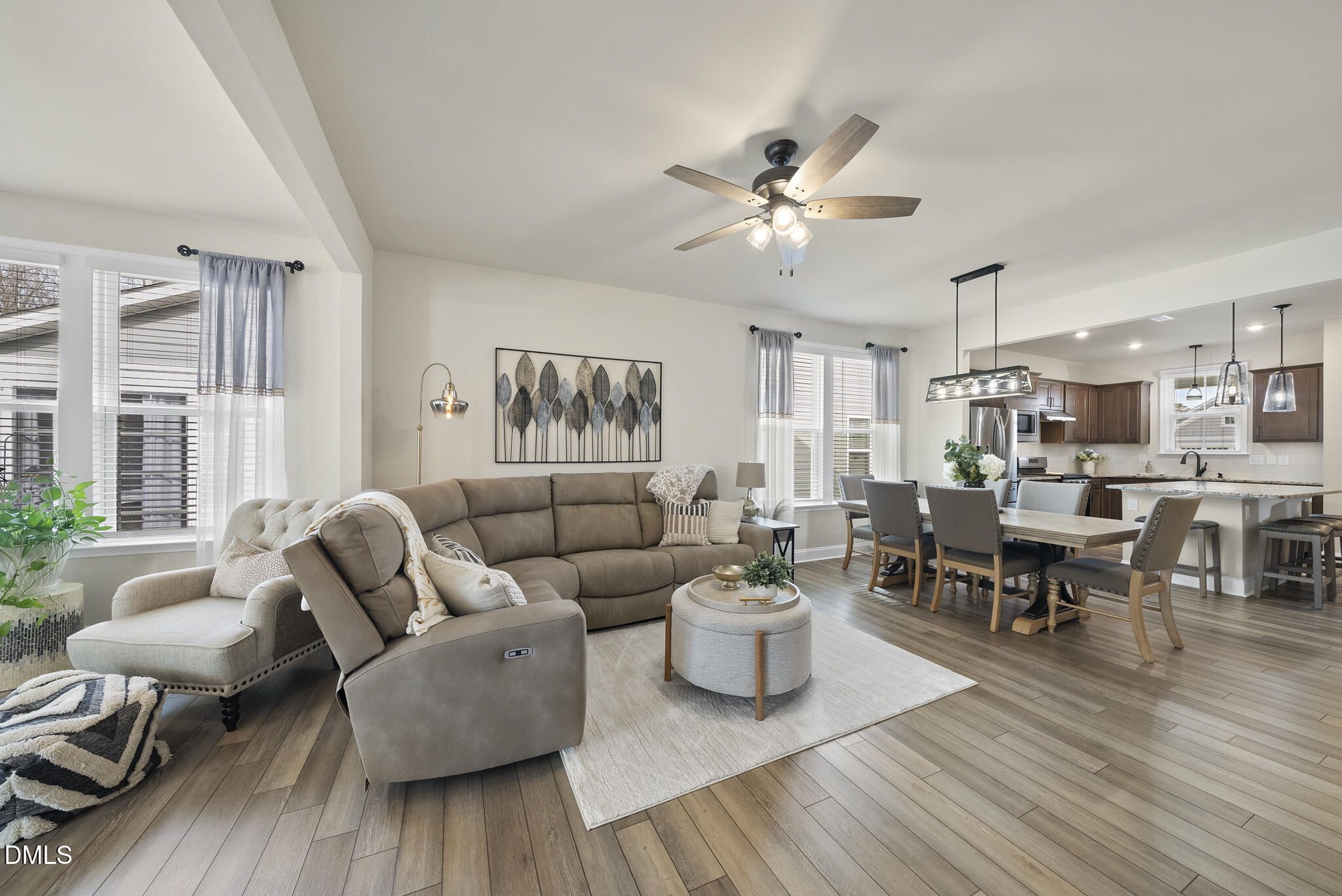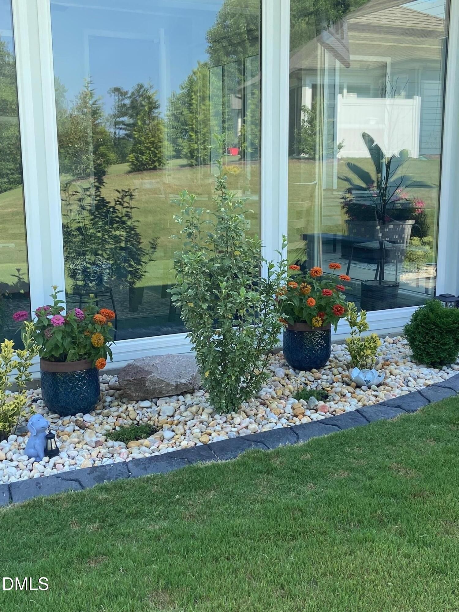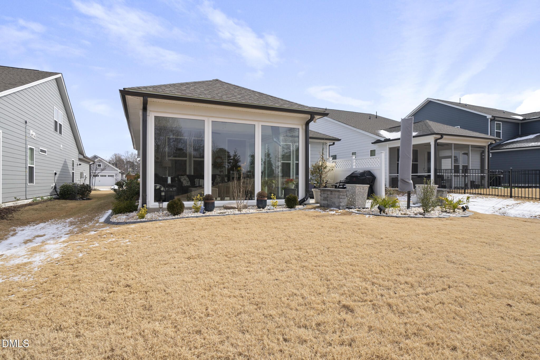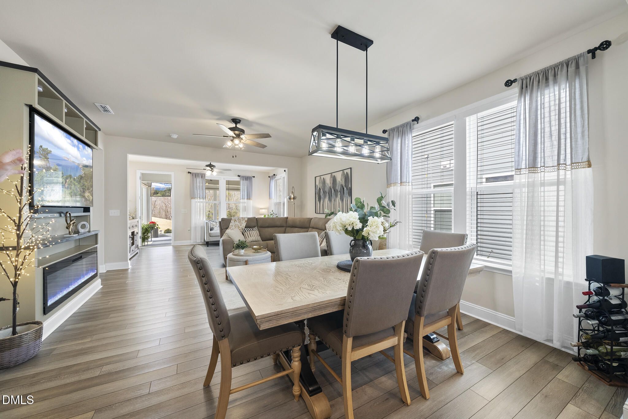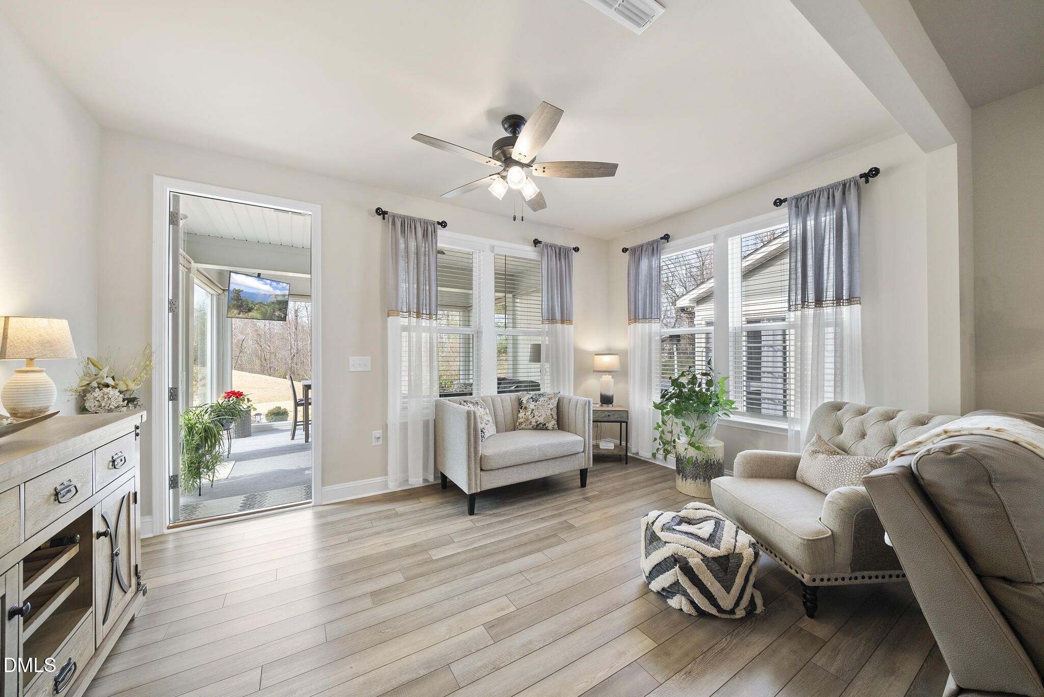 Come see this enhanced Alpine design with additional square footage, located in the highly desirable Carolina Gardens by Del Webb community. This beautifully appointed single-story home features an upgraded exterior elevation and professionally designed landscaping with decorative curb edging, delivering outstanding curb appeal. Inside, the open-concept floor plan is enhanced by an extended gathering room featuring a custom built-in electric fireplace with integrated entertainment center, creating a warm and stylish focal point for everyday living and entertaining. A professionally added four-season sunroom expands the home's living area and adds valuable square footage while offering serene wooded views, providing bright, year-round enjoyment and a peaceful connection to nature. The kitchen anchors the home with a spacious center island, ample cabinetry, and modern finishes, all open to the dining area and gathering room for effortless living. The private owner's suite serves as a relaxing retreat and features a generous walk-in closet with custom shelving, along with a spa-inspired bath. A secondary bedroom and full bath provide ideal flexibility for guests or hobbies. Step outside to enjoy the custom back patio hardscape with privacy fencing, ideal for outdoor dining, relaxing, or entertaining. Additional highlights include energy-efficient construction, a two-car garage, and garage attic access with a sturdy aluminum ladder leading to a floored attic storage area, offering exceptional additional storage. Residents of Carolina Gardens by Del Webb enjoy resort-style amenities, an active social calendar, and maintenance-friendly living — making this Alpine home an exceptional opportunity.
