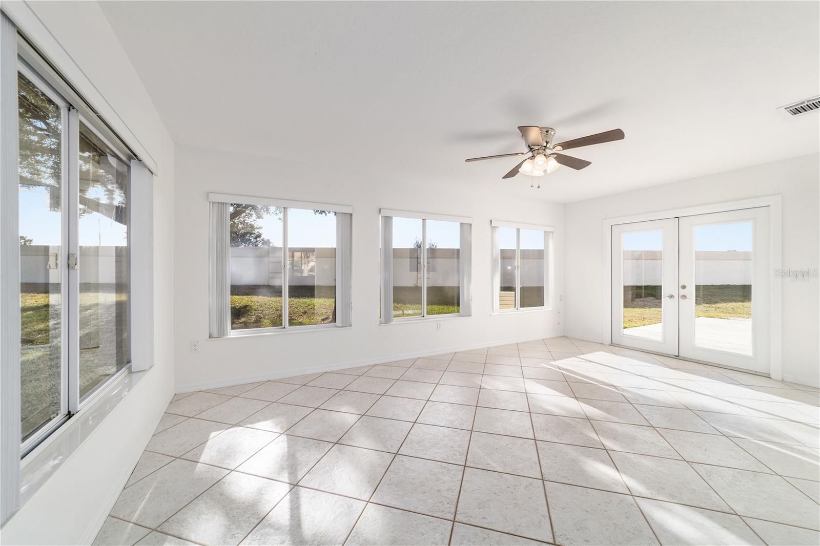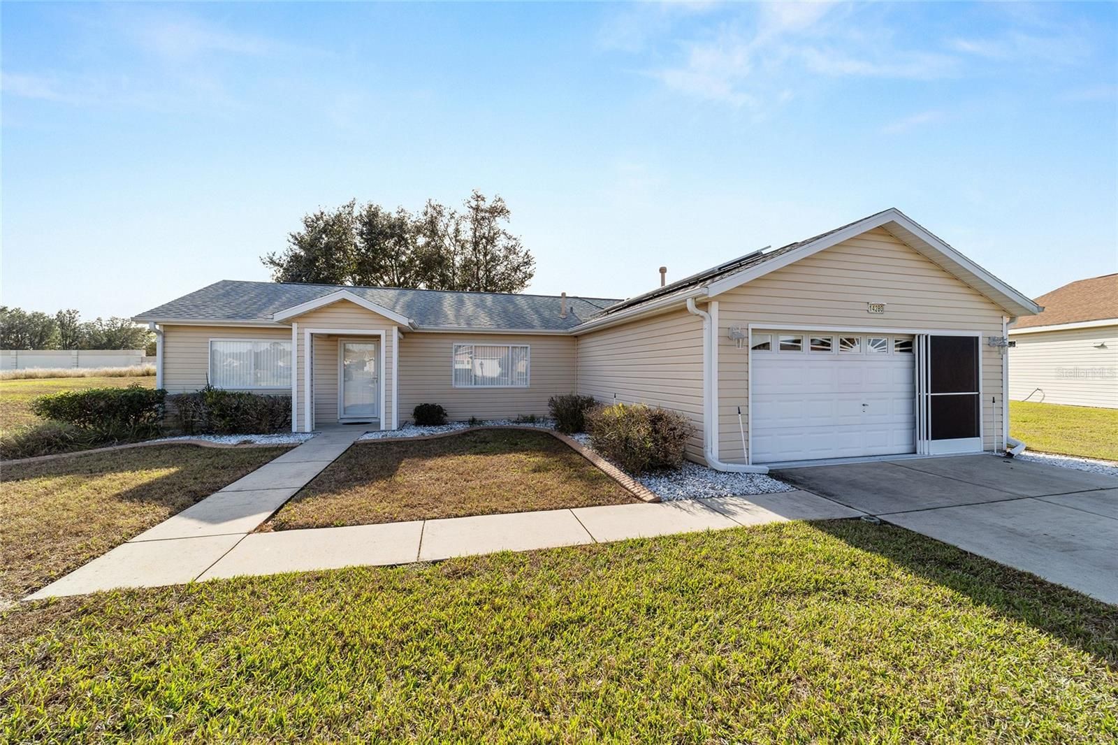 One or more photo(s) has been virtually staged. Discover exceptional value in this popular Chesapeake 2-bed/2-bath model featuring a bright, open floor plan and an expansive family room. Situated on a quiet cul-de-sac, this well-maintained home offers privacy, low-maintenance landscaping with attractive rock beds, and the added peace of mind of a whole-house Generac generator. Inside, vaulted ceilings and a split-bedroom layout create an inviting sense of space. The kitchen features an island with a breakfast counter, newer appliances, and flows seamlessly into both the formal dining and living rooms—ideal for everyday living and entertaining. No carpet anywhere—tile and laminate flooring run throughout the home for easy care and a clean, modern feel. The heated and cooled Florida room extends your living space year-round and leads to a generous 12' x 20' outdoor patio perfect for grilling, sunning, or simply relaxing. The ensuite primary bath includes a walk-in tub with jets and a shower. Laundry is conveniently located inside and equipped with a newer washer and dryer.This home is priced to sell—don’t miss your chance to see it today. Best of all, Solar Panels for reduced energy costs. All photos showing furniture are virtual.