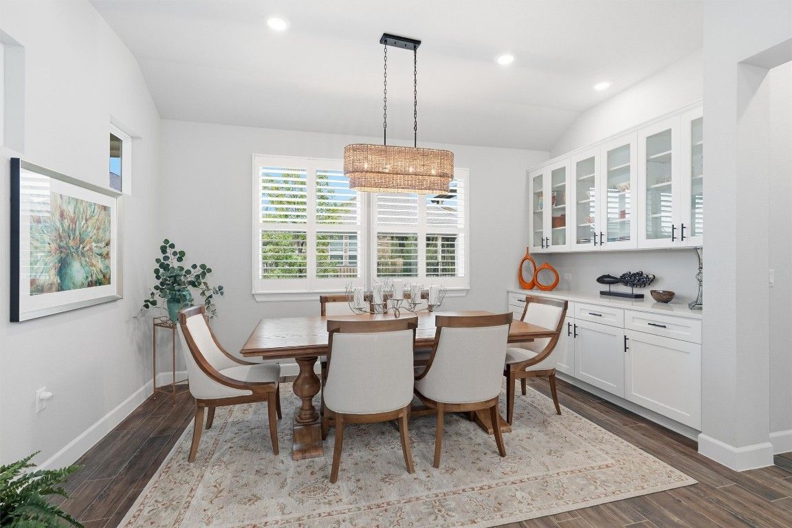 Absolutely gorgeous Trinity floor plan in the over-55 Kissing Tree neighborhood. Open floor plan with large living areas and light-filled rooms. 3 1/2 inch plantation shutters & custom seagrass blinds, recessed lighting, coffered & tray ceilings, recent/trendy dining room chandelier. Large dining area with a wall of custom built-in cabinets with a serviing bar & glass front cabinets. Kitchen and baths have quartz countertops, kitchen with glass tile backsplash and under & over-cabinet lighting. Oversize breakfast bar with under-counter bar stool seating. Wood-look tile flooring throughout the home. Extended covered patio overlooking the freshly landscaped backyard complete with an iron/stone fence. The side patio is covered, but this seller has added a screened exterior wall. This provides an additional living/entertaining space. The study has solid french doors and is currently used as an additional bedroom, but could be used as a study for the new buyer. The laundry has additional cabinets added over the included washer/dryer and cabients below the folding area. The half bath is between the garage and laundry room. The garage has an 8' extension to accomodate 2 golf carts or for additional storage. Huge bonus - space for 2 cars plus 2 golf carts in the garage!! This is the one you've been looking for, check this one out before it's taken! NOTE: Water softener is included as well as a reverse osmosis system under the kitchen sink. Grout has been sealed on all tile flooring. In primary bedroom closet, a small built-in desk & shelving has been added for aprivate workspace. Please make sure to view the video of this listing to see the most accurate view of the home and floor plan.