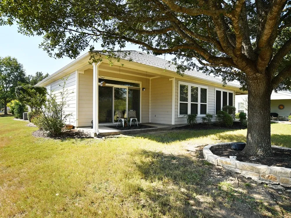 Enjoy pleasant views FRONT AND BACK at this nicely updated 'Monterey' cottage (individually owned 1/2 duplex,) as part of Sun City's 'lock & leave' program where year-round lawn care is included in the stated annual dues. Light wood flooring in the living area along with new carpet in bedrooms, new ceiling fans and neutral paint throughout combine to provide a pleasing palette for feathering your nest! Quartz counter tops, updated backsplash, white cabinets and appliances add sparkle to the kitchen as it opens to the combination living/dining room with views of the woods out back. Primary and guest bedrooms/baths are nicely separated in this plan and a nook at the front of the kitchen can serve as you wish. Roof 2020. Don't miss this nice package! Come live your best life in Sun City Texas!