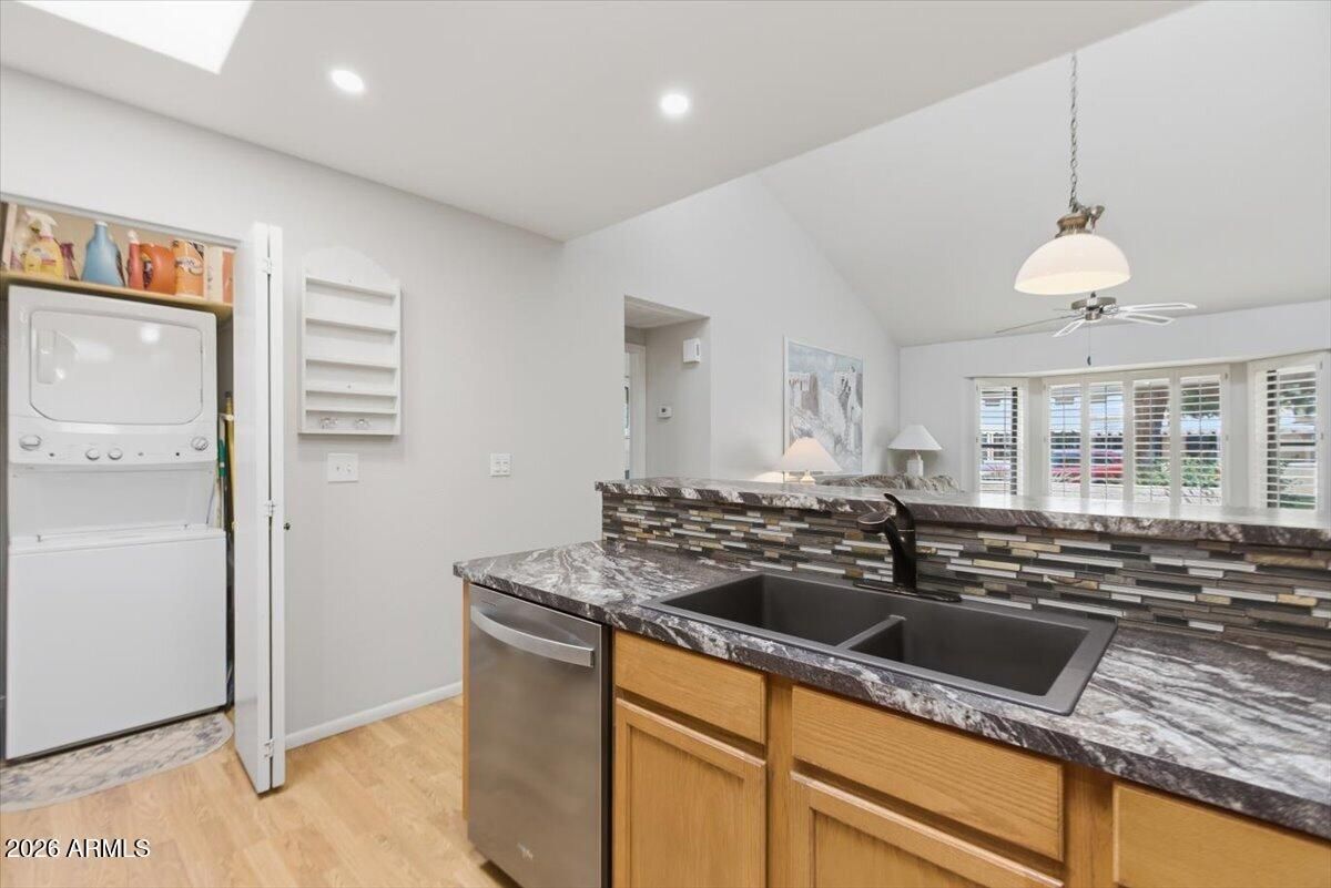 Fully furnished Vaulted Soccorro Model with beautiful views from patio. Enjoy the open feel of this vaulted ceiling unit with bay window at living area and split 2 bedroom, 2 bath floor plan. Beautifully updated with wood flooring, granite like counters with under cabinet lighting and glass tile backsplash. Two year old stainless steel appliances and stack washer and dryer. Enjoy the efficiency that the newer AC, windows and awning provide. Enjoy breakfast bar and dining area with beautiful light from windows and skylight. Dedicated covered parking and storage. Location of unit offers quick access to nearby shopping and entertainment as well as amenities within the community. Lush gated golf community includes pool and community center with extensive clubs and entertainment opportunities.