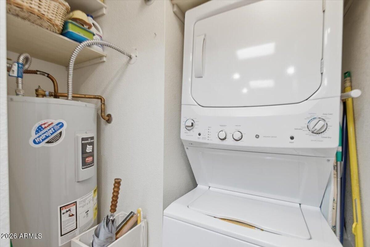 - Stacked Washer/Dryer, Dryer, Washer, Refrigerator, Dishwasher, Electric Range, Electric Oven, Built-In Electric Oven
