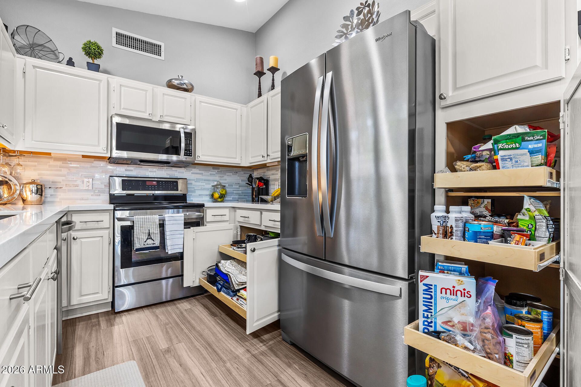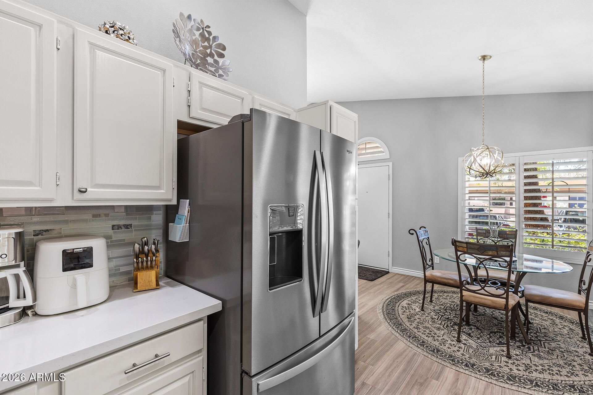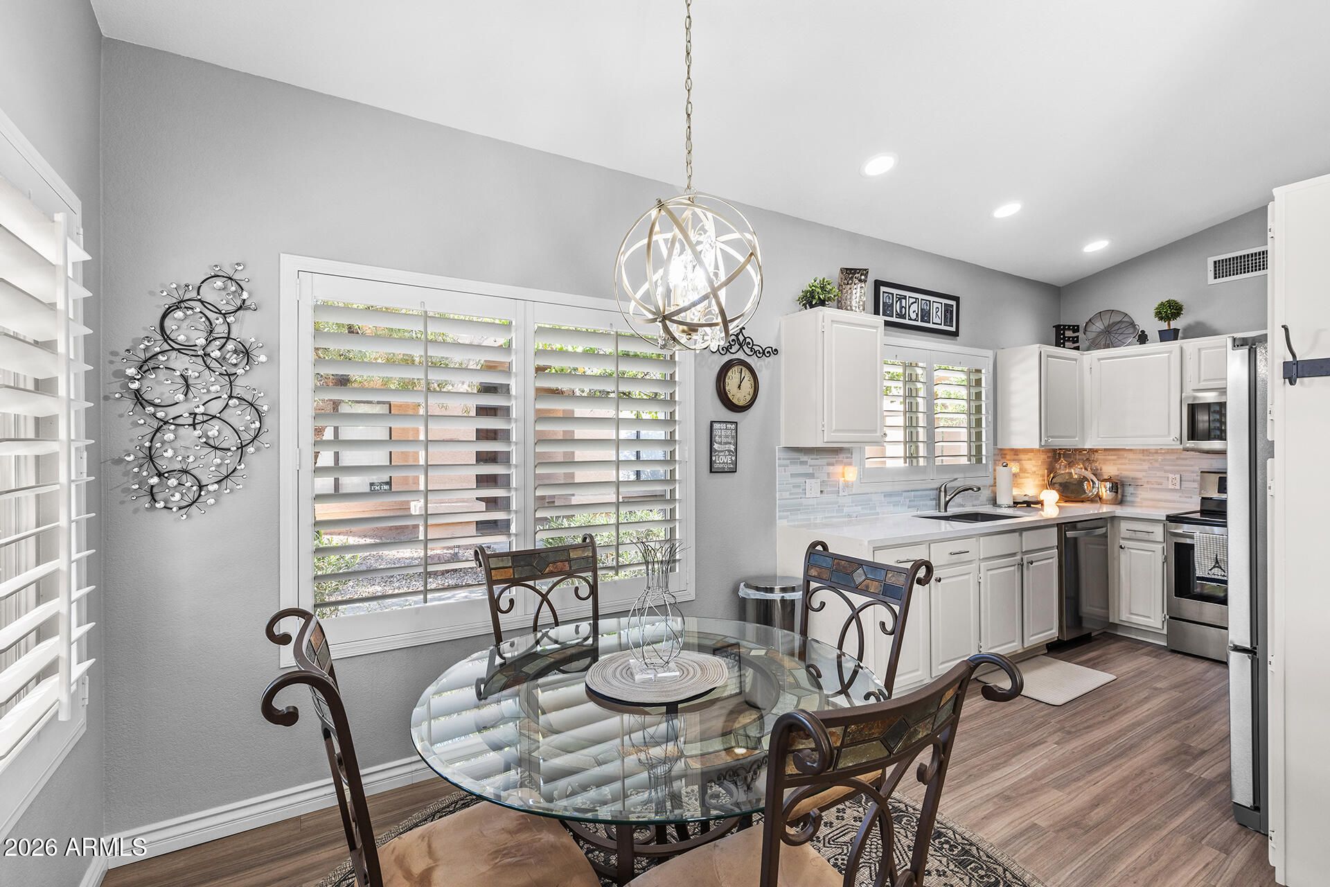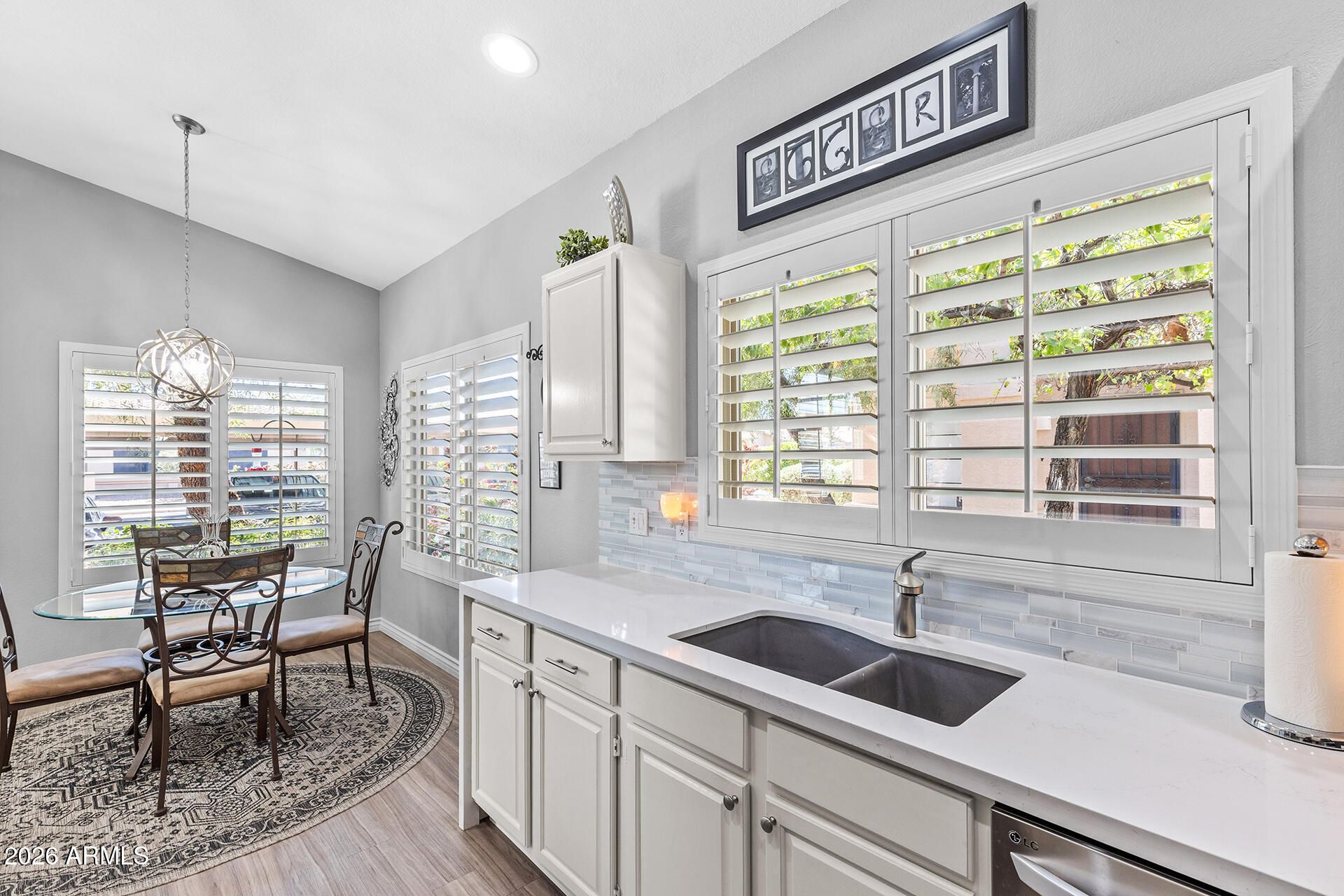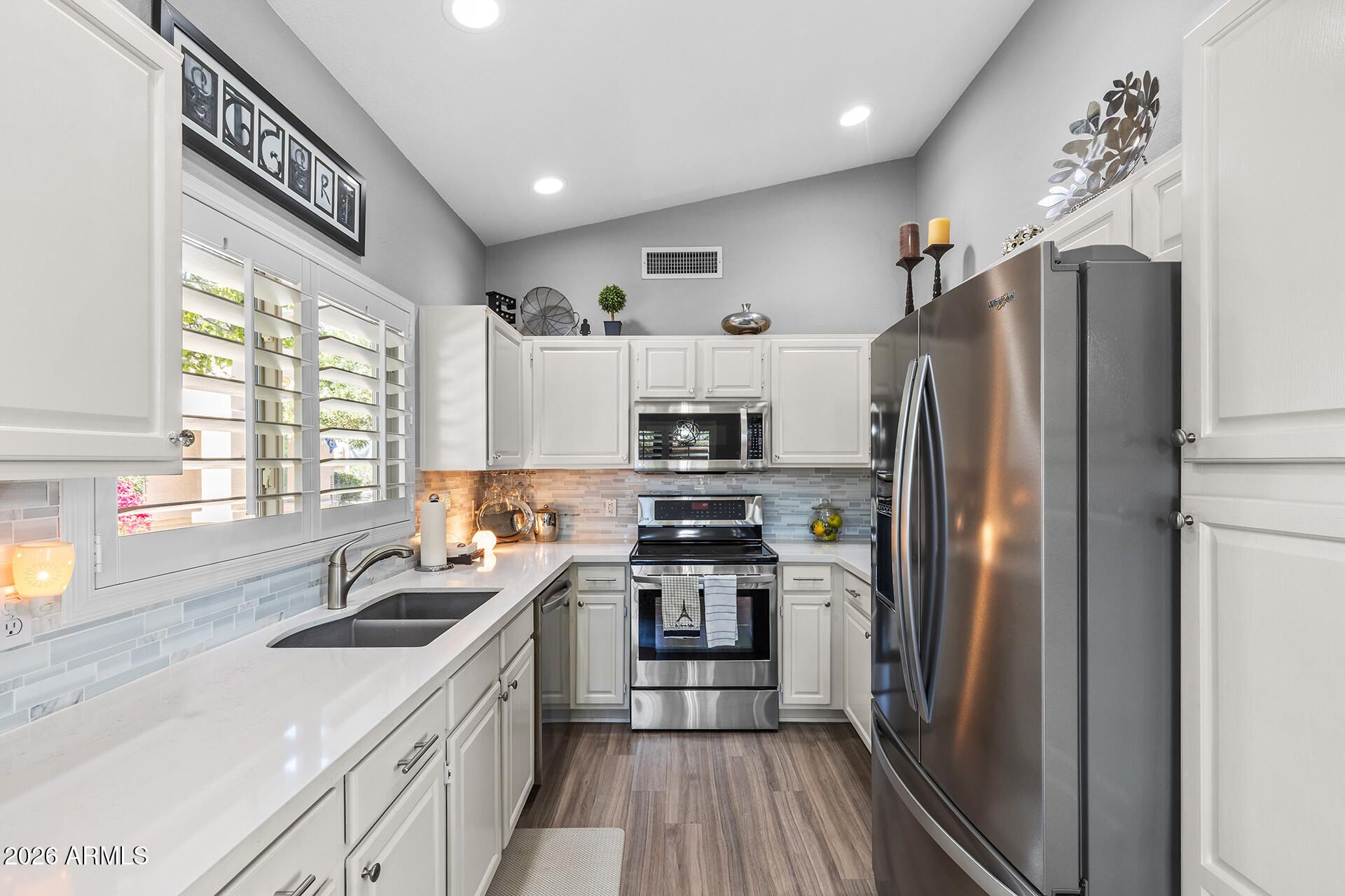 Updated and Furnished 2 bed, 2 bath Los Cabos Condo in Gated 55+ Resort Style Community of Sun Village! The updated kitchen features a waterfall QUARTZ COUNTERTOP, pull out drawers, stainless appliances including LG dishwasher, stove, microwave, and refrigerator. Vaulted ceilings in the kitchen and living room. Both bathrooms have quartz counters and updated sinks. Additional improvements include NEW WINDOWS(2021), wide baseboards, repainted cabinetry with new hardware, skylights and kitchen can lighting, LVP TILE FLOORING, newer bedroom carpet with upgraded pad, and PLANTATION SHUTTERS. Enjoy the covered patio with a new awning, plus a refurbished water softener and Lennox heat pump HVAC (2019). Luxury and peace of mind with amenities to spare, this home wont last long! Sun Village is a 55+ Gated, Resort Style Community. Enjoy the 18 hole par 3 golf course, gigantic heated pool & spa, pickleball, tennis, fitness gym, wood shop, billiards, onsite entertainment in our ball room and onsite restaurant! Sun Village, is a gated, security guarded, age 55+, community, in the city of Surprise, Arizona. This small community is made up of just under 1400 homes and condominiums. The Sun Village Community has an 18 hole, par three "no-"riding" golf course, a heated swimming pool and spa, tennis, pickleball and shuffleboard courts, horseshoe pits, an exercise room, a billiards room, sewing and crafts rooms, and a ballroom, where national and international entertainment can be enjoyed! Also, secure RV Storage is available for a fee. Close by you will find the spring training home of the Texas Rangers and the Kansas City Royals. Across the street from Surprises' baseball complex, is a 25 court tennis complex that is home to national and international tennis tournaments. A Regional Library, a park, and a fishing lake are also part of this fantastic recreational area.