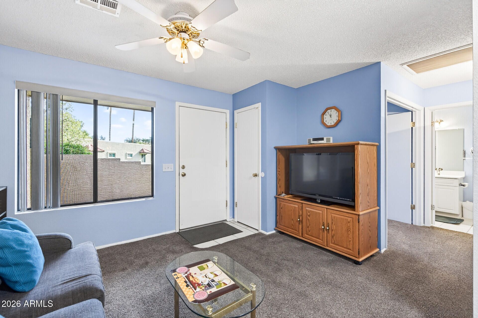 Turn-key condo and the perfect winter getaway. Spacious primary bedroom with a king-size bed, nightstands, and dresser. Dual-entry bath makes hosting guests easy. Open living and dining area with plenty of room and a sleeper sofa for extras. Fully stocked kitchen—just bring your suitcase. Inside laundry, one covered parking space, plus a storage shed. Located in a 24-hour gated and guarded 55+ golf resort community. Close to shopping, spring training, and tons of great restaurants. Walk to the community center, ballroom, heated pool, on-site restaurant, and golf course. Easy living. No drama. Just enjoy.