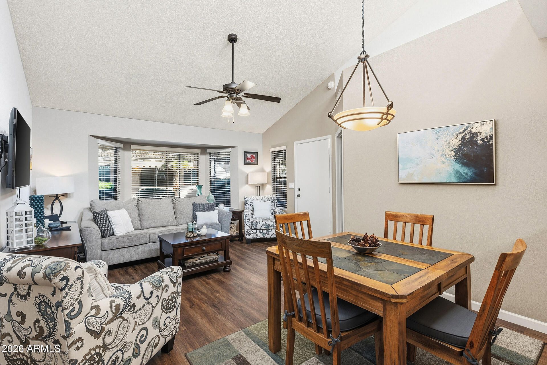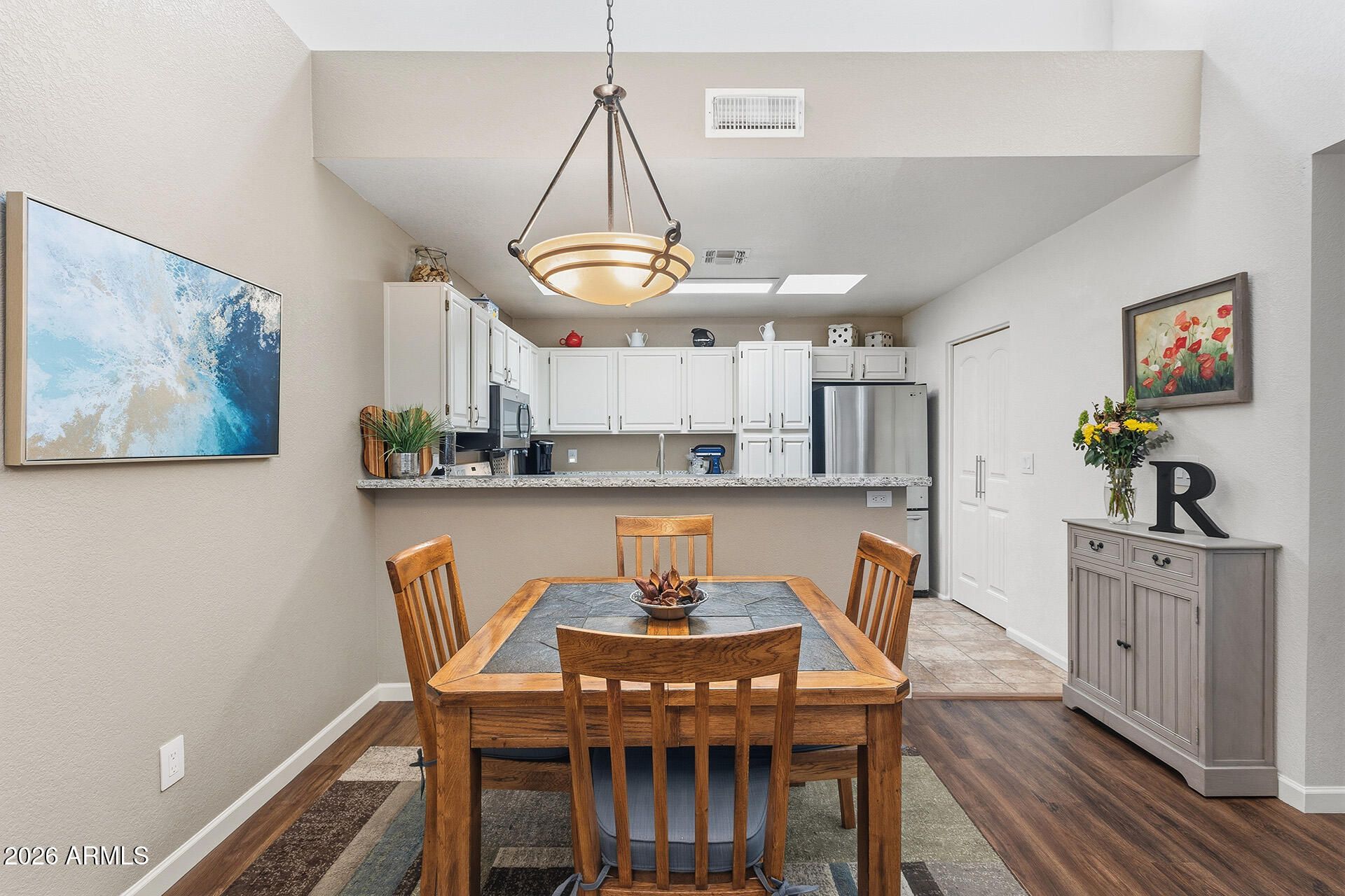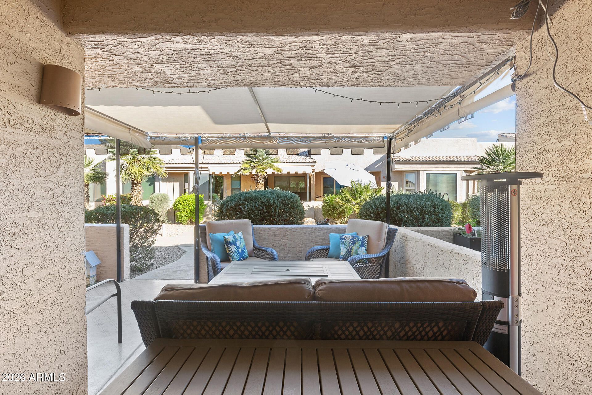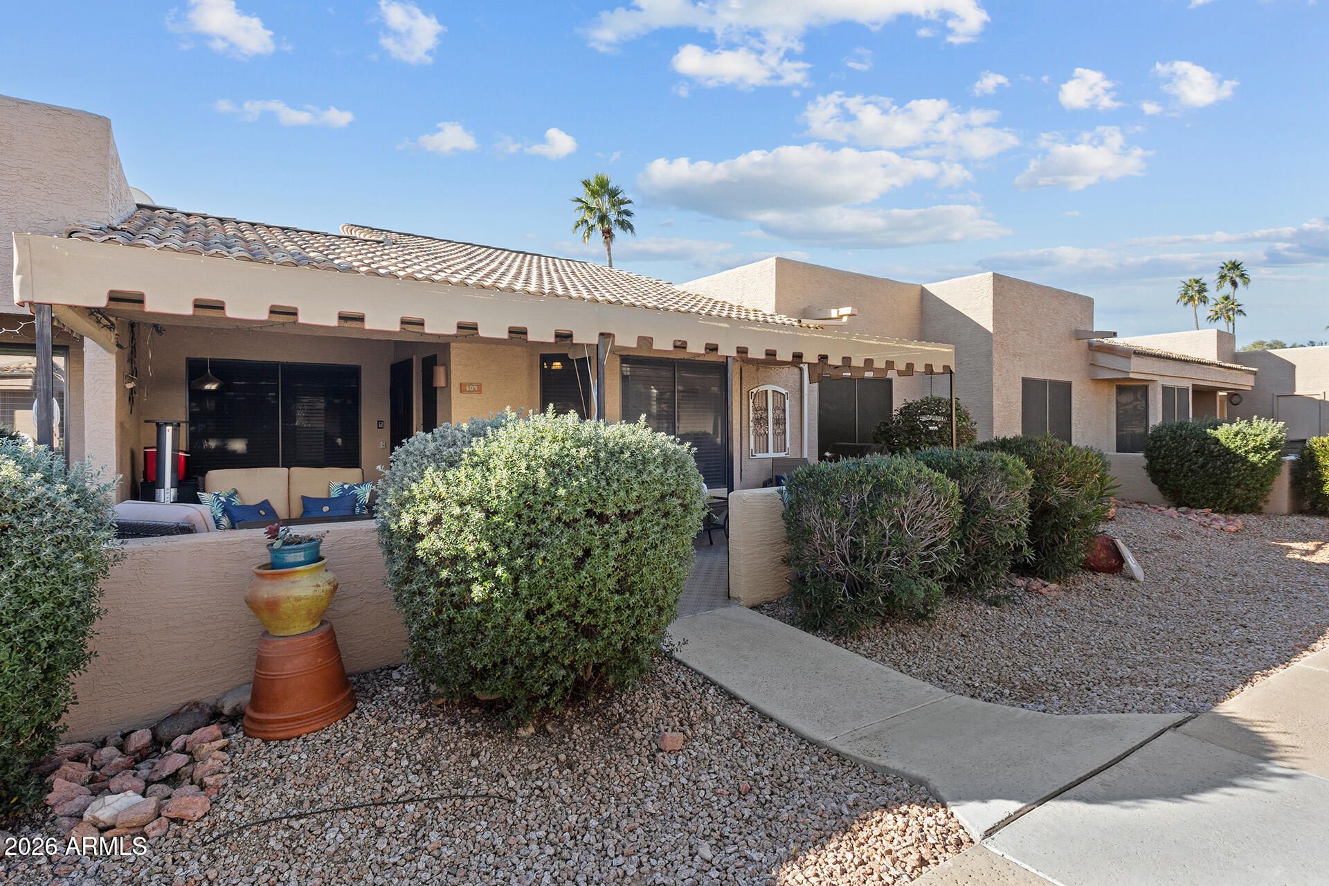 FURNISHED Vaulted Socorro model with HUGE patio! Don't mis this updated condo in Gated Sun Village Resort. This split plan, (each room has own bath!) with highly desired vaulted ceiling is light & bright! Tile flooring and nicely painted cabinets in kitchen with granite countertop. Upgraded 2nd bath with granite counter top. Nice vinyl plank flooring through the rest of the condo. Large Covered patio ( new awning cover) for relaxing or entertaining! Sun Village is a 55+ Gated, Resort Style Community. Enjoy the 18 hole par 3 golf course, gigantic heated pool & spa, pickleball, tennis, fitness gym, woodshop, billiards, onsite entertainment in our ball room and onsite restaurant!Sun Village, is a gated, security guarded, age 55+, community, in the city of Surprise, Arizona. This small community is made up of just under 1400 homes and condominiums. The Sun Village Community has an 18 hole, par three "no-"riding" golf course, an heated swimming pool and spa, tennis, pickle ball and shuffleboard courts, horseshoe pits, an exercise room, a billiards room, sewing and crafts rooms, and a ballroom where national and international entertainment can be enjoyed! Close by you will find the spring training home of the Texas Rangers and the Kansas City Royals. Across the street from Surprises' baseball complex, is a 25 court tennis complex that is home to national and international tennis tournaments. A Regional Library, a park, and a fishing lake are also part of this fantastic recreational area.