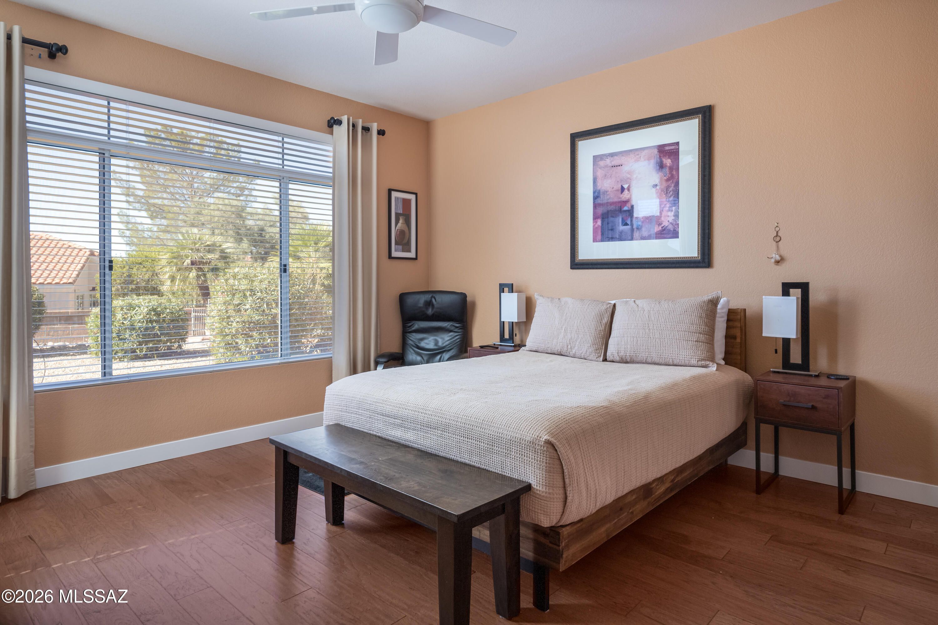 Charming 1,093sf 2BR/2BA Oasis floorplan in Sun City Oro Valley, situated on a fully fenced lot w/stunning mountain views. Inviting fully-fenced front courtyard features pavers. Paver driveway adds to the curb appeal. Kitchen has newer maple cabinets w/pull-outs, quartz countertops & stainless-steel appliances. Bay window in breakfast nook has beautiful mountain views creating the perfect setting for morning coffee. Wood flooring extends through most of the home with ceramic tile in the kitchen & guest bath. Updated interior doors & baseboards add a fresh, modern touch. 2nd bedroom features a built-in desk & sliding glass door to patio ideal for guests or home office. Both bathrooms have been tastefully updated. Covered patio has ceiling fan & remote-controlled sunscreens.