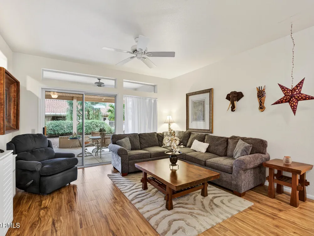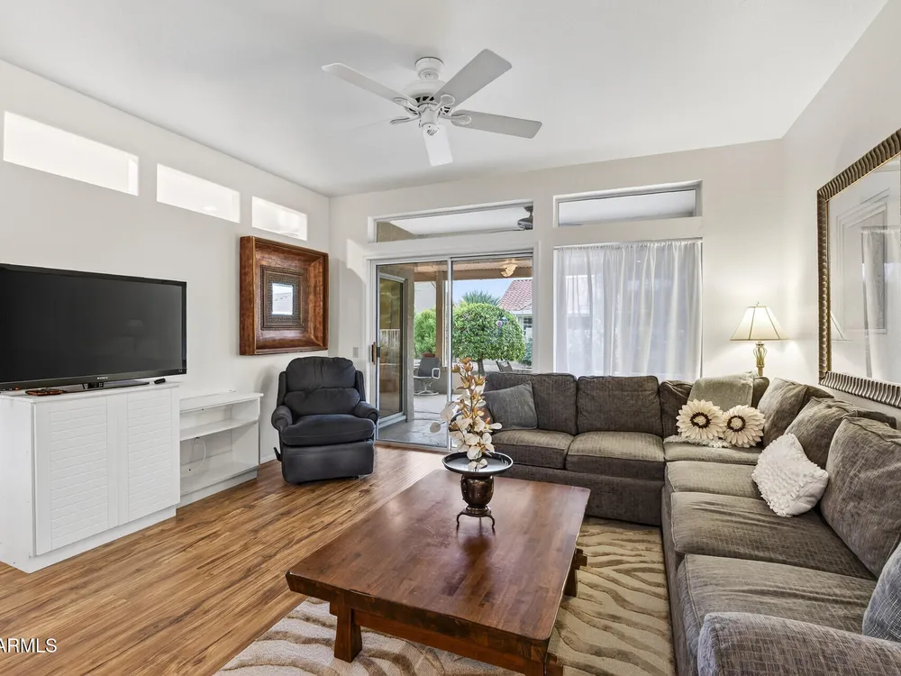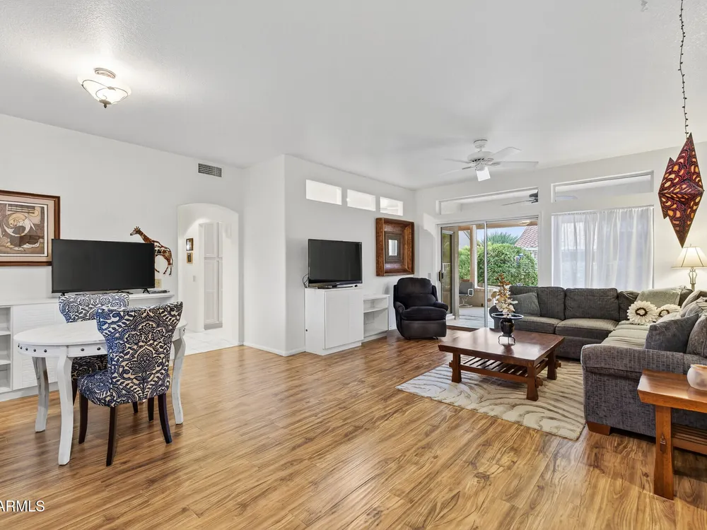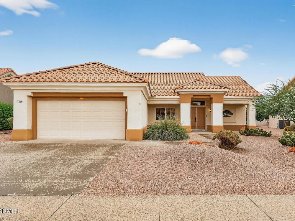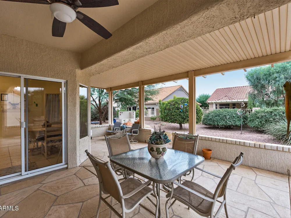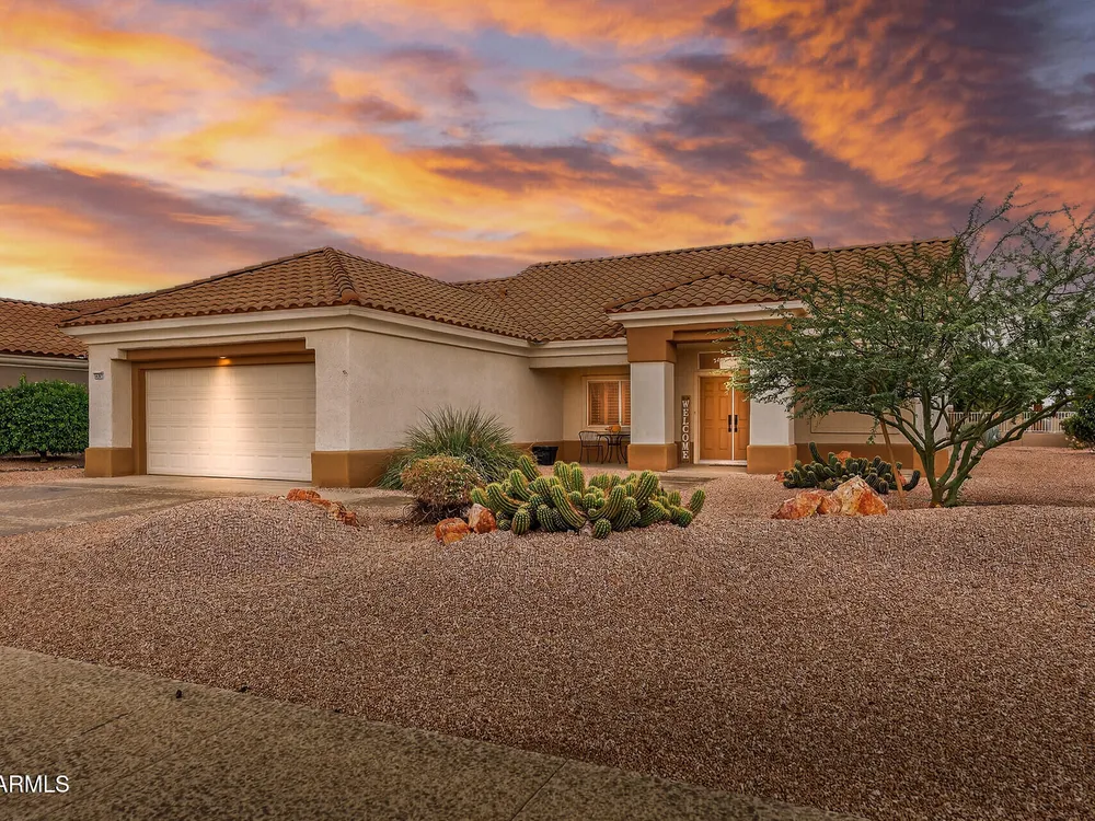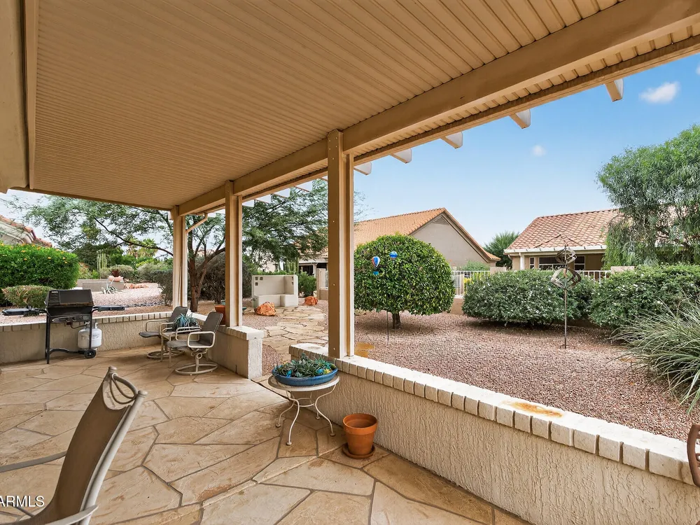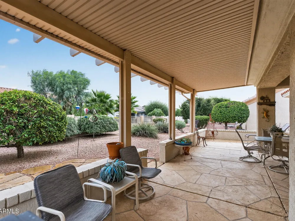 Popular Cameron split floor plan featuring 2 bedrooms, 2 baths, plus a versatile office/hobby room. This 1,336 sq ft home sits on an 8,962 sq ft lot with excellent curb appeal and a beautifully landscaped yard. Warm wood-grain vinyl plank flooring, plantation shutters, ceiling fans throughout, and newer appliances with a gas range. Spacious bedrooms with bay windows and walk-in closets. The primary bath includes dual sinks and a walk-in shower. Enjoy Arizona Prime Time living on the huge extended covered patio surrounded decorative hardscape, manicured landscape with a citrus tree and shade tree. W/D & Utility sink in the garage with plenty of storage cabinets. No HOA fees and a convenient golf cart ride to Sun City West golf courses, recreation centers, and shopping.