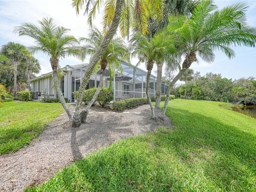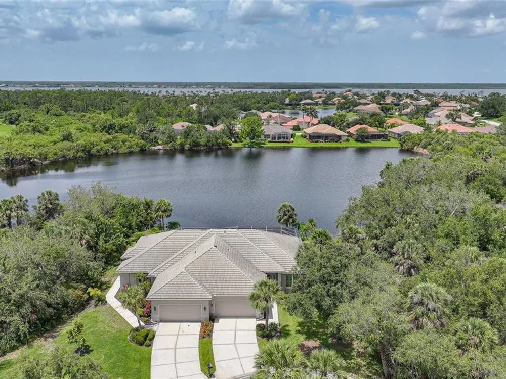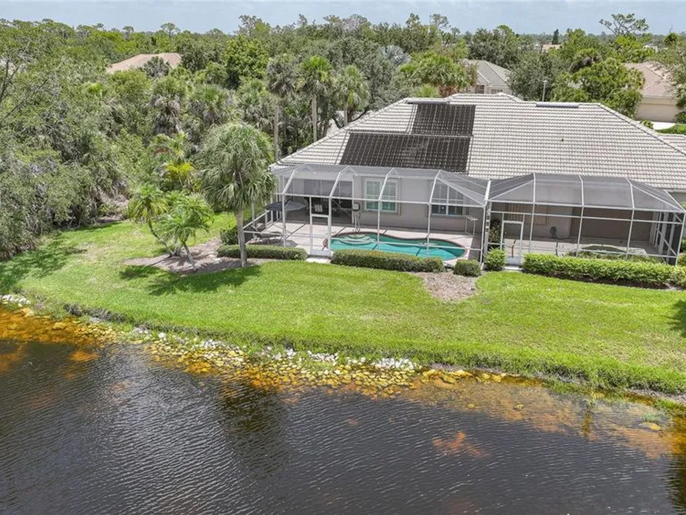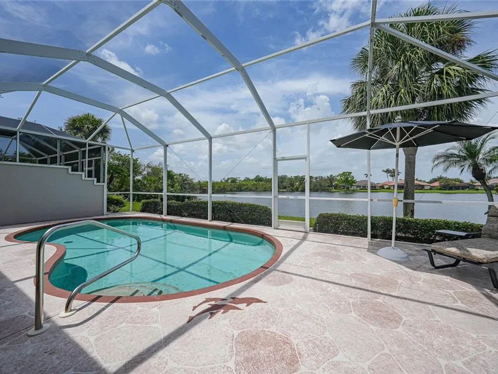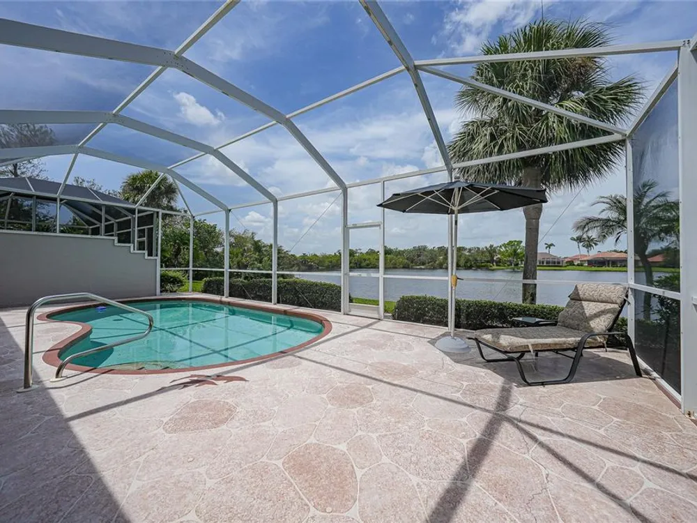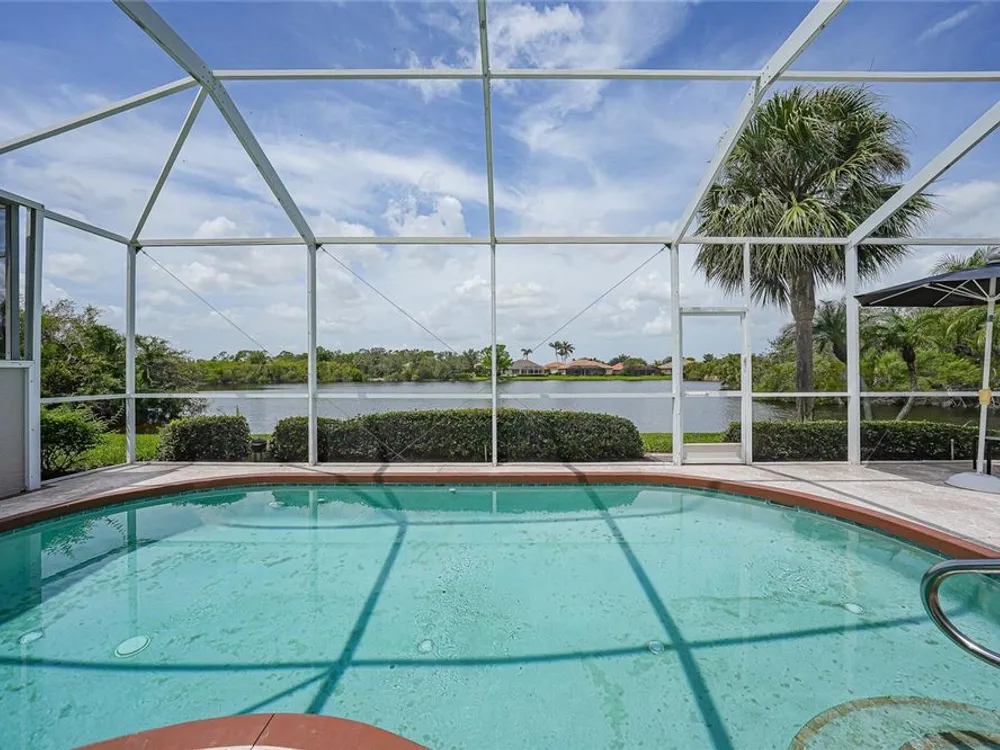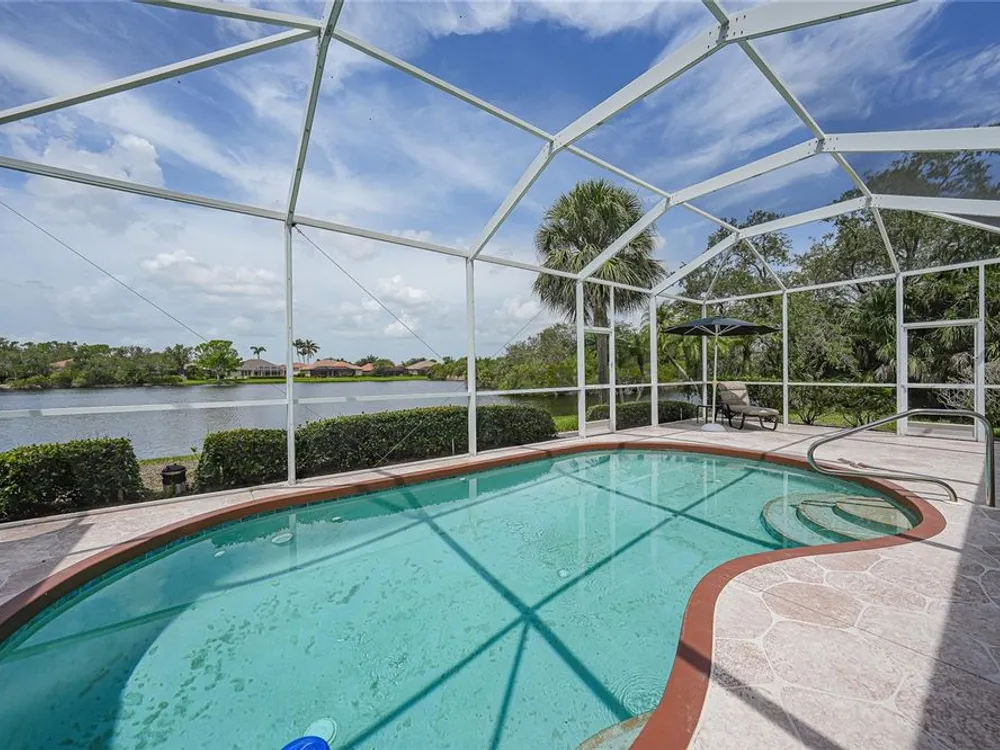 One or more photo(s) has been virtually staged. Welcome to your private lakefront oasis in the heart of Riverwood! This beautiful 2-bedroom, 2-bath villa with a den and solar-heated pool offers the perfect blend of style, comfort, and location. Nestled at the end of a quiet cul-de-sac and adjacent to a serene nature preserve, the home captures stunning southwestern views—ideal for savoring both sunrise serenity and sunset splendor. Step inside to discover a modern, open-concept living space designed for everyday luxury and effortless entertaining. The stylishly renovated kitchen serves as the heart of the home, while the expansive living and dining areas flow seamlessly to the enclosed lanai and private pool—creating an inviting retreat for gatherings with family and friends. Enjoy added conveniences like a 2-car garage, dedicated laundry room, and an upgraded primary bath. Located within the gates of Riverwood, one of Southwest Florida’s premier communities, residents enjoy a rich array of resort-style amenities. Take advantage of the 72-par championship golf course (private memberships and public play available), a private beach club on Manasota Key (subject to availability), and a vibrant activity center featuring a resort pool and spa, tennis, pickleball, bocce, croquet, and more. With a 24-hour fitness center, dog park, library, arts and crafts room, and a full-time Activities Director curating year-round events, there's always something to enjoy. Nature lovers will relish birdwatching, biking, kayaking on the Myakka River, or simply soaking in the peaceful natural beauty that surrounds you. This villa isn’t just a home—it’s the lifestyle you’ve been waiting for.