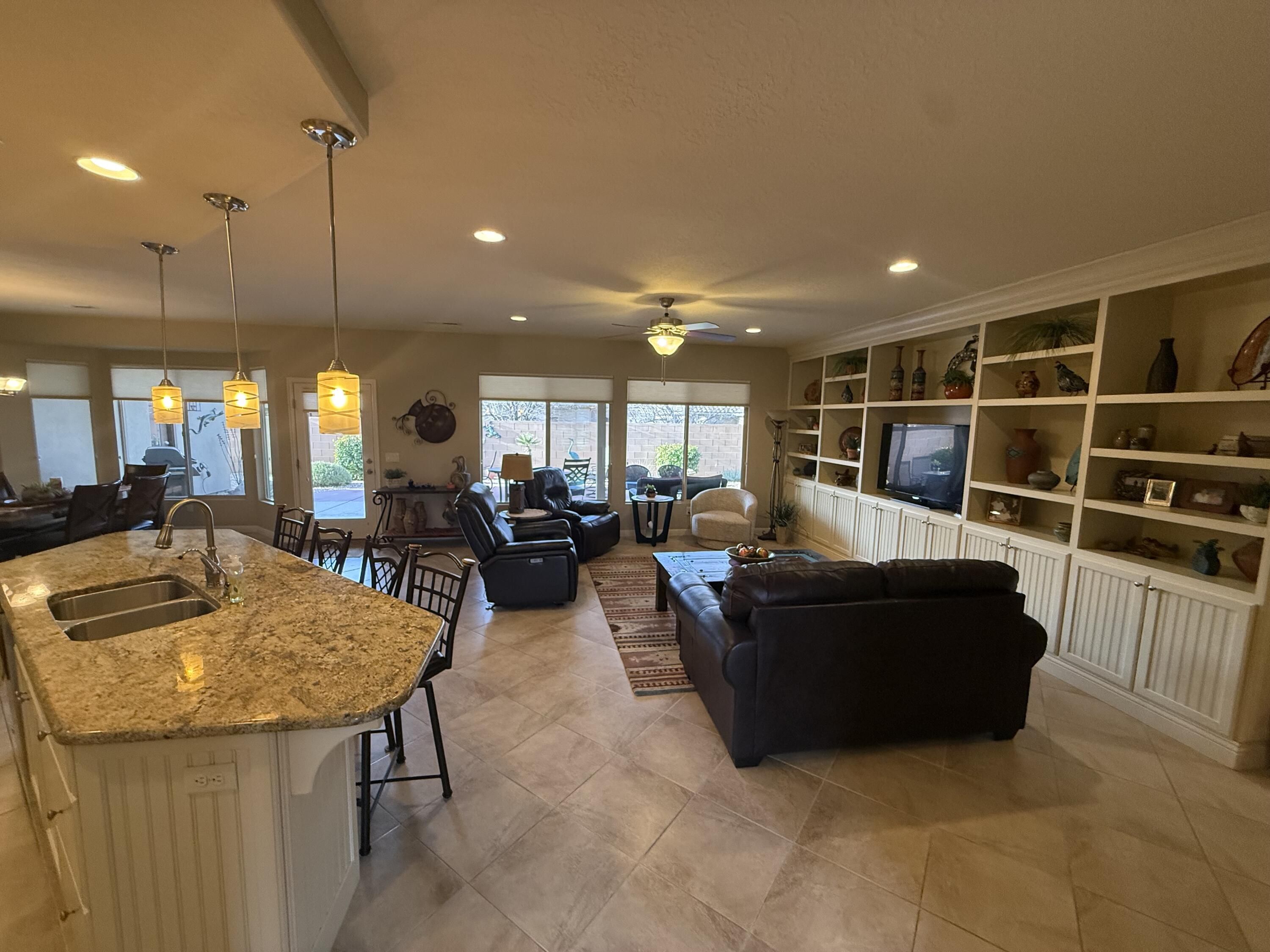 Gorgeous Aspirations model with 3 bedrooms, 3 bathroom, a den, and a 4 car garage with epoxy floors. The CASITA has a bathroom can also be accessed by the workshop in the 4th tandem stall. Both the casita and workshop have their own mini-splits for heat and air. The fenced back yard features both open and covered patios and a soothing water feature. DR Builders just put in the new patio cover. The home features custom cabinets through the house, from the kitchen & bathrooms, to the built-in entertainment center in the living room, to the desk and cabinets in the den, to the extra storage in the laundry room. This house is a must see for those who appreciate tasteful, upgraded living. Washer, dryer, refrigerator, and cabinets in garage and workshop included. Prof photos coming soon