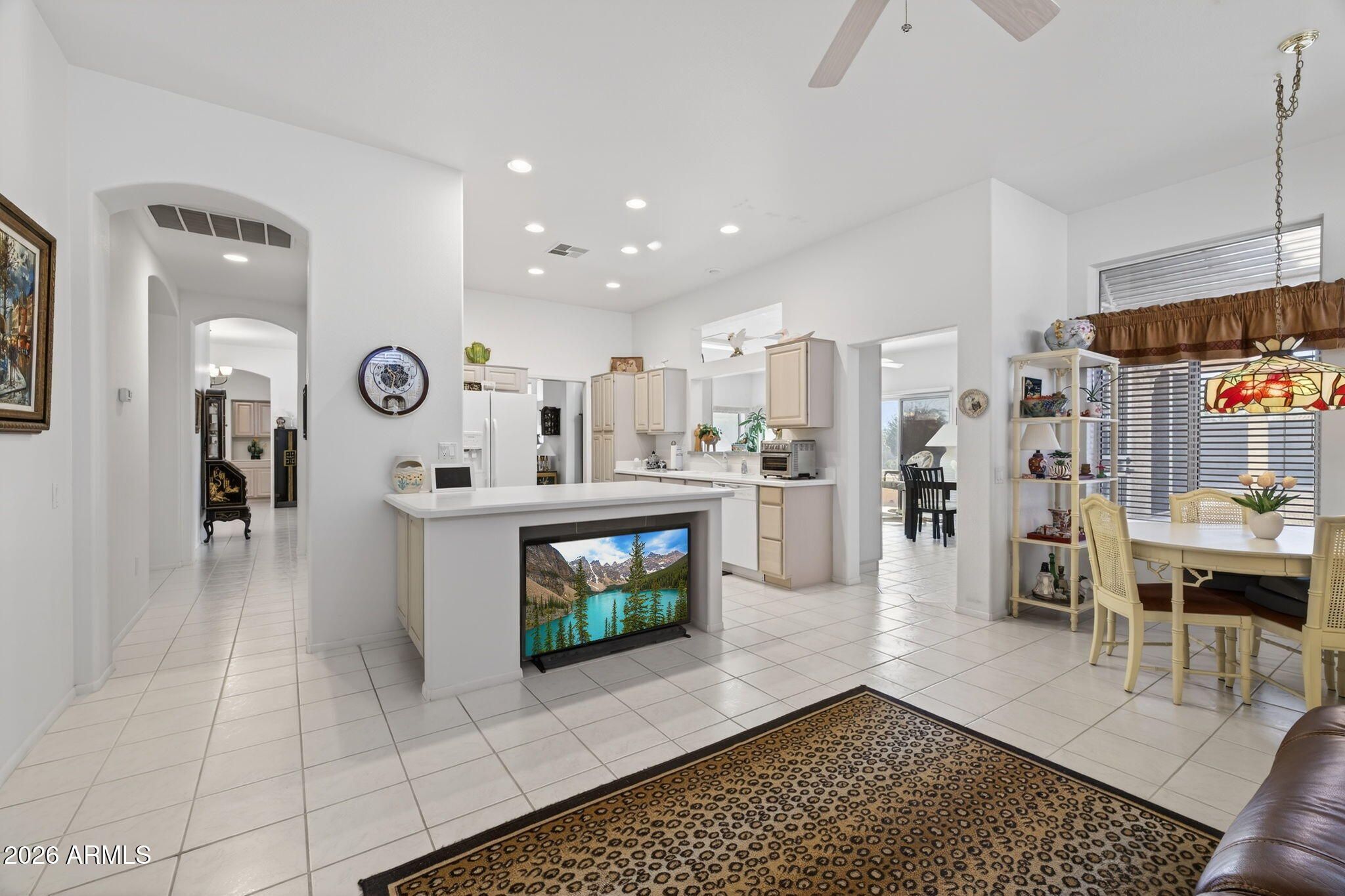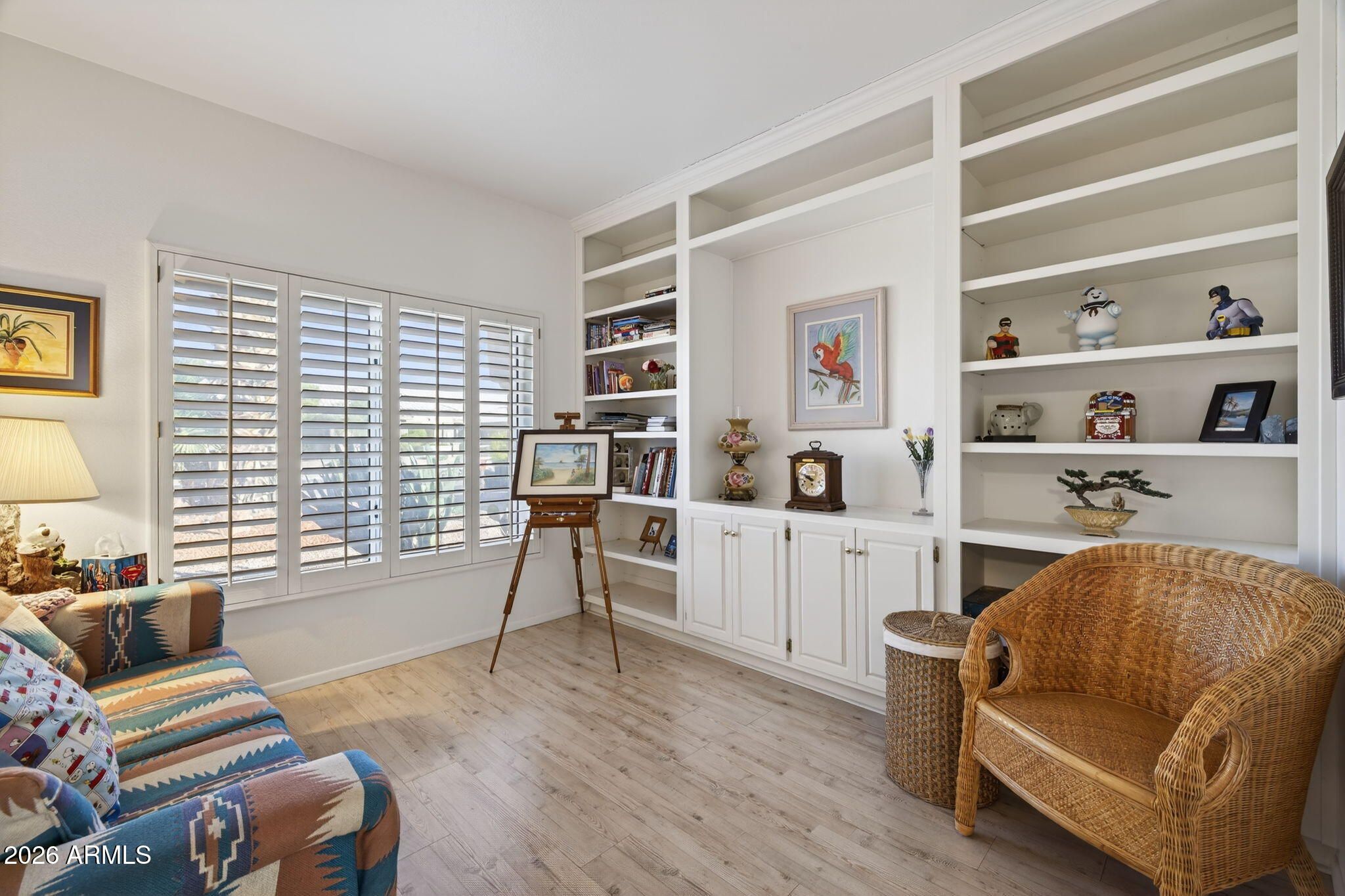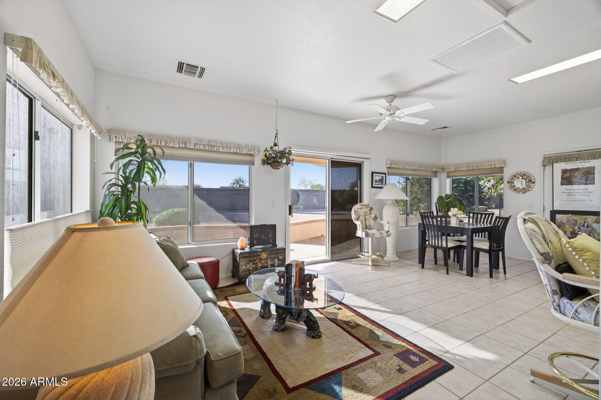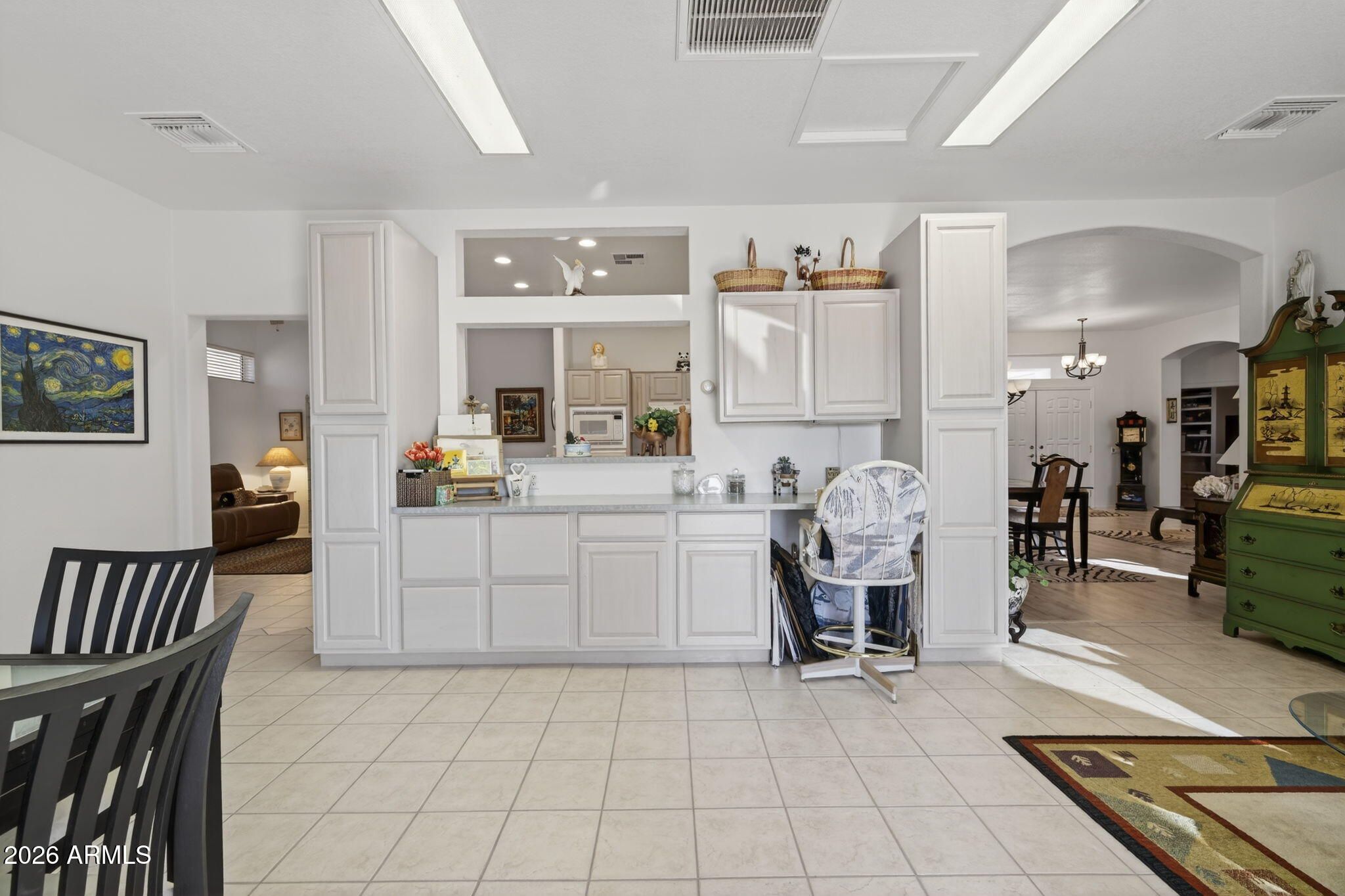 Welcome to this beautifully expanded Pinetop floorplan, thoughtfully designed for comfort and flexibility. A 14 x 23 Arizona room, located just off the dining room and kitchen, offers the perfect space to relax or create, it is fully heated and cooled. The split bedroom layout provides privacy, while the spacious primary suite features two separate closets, skylights, and a bath with a soaking tub and separate shower. 3rd bedroom is a generous den or office with custom built ins and a convenient powder room add everyday ease. Enjoy a south facing covered patio, tile flooring in all the right places, soft water and reverse osmosis systems, fresh exterior paint, and a true move in ready feel. The main A/C was replaced last year. Welcome to this beautifully expanded Pinetop floorplan, thoughtfully designed to offer comfort, flexibility, and a relaxed Arizona lifestyle. Just beyond the dining room and kitchen, a generous 14 x 23 Arizona room creates a wonderful extension of the living space. This bright and versatile area has been enjoyed as both a creative studio and a comfortable retreat, making it ideal for hobbies, entertaining, or simply unwinding. Fully heated and cooled with its own heat pump, this space can be enjoyed year round, and the main air conditioning system was replaced last year for added efficiency and peace of mind. The home's split bedroom layout provides a sense of privacy and separation, perfect for hosting guests or creating quiet personal spaces. The primary suite feels like a true sanctuary, featuring two separate closets, skylights that fill the room with natural light, and a well appointed bathroom with both a soaking tub and a separate shower. It is a space designed for comfort and relaxation at the end of the day. A spacious den or office offers excellent flexibility, enhanced by a wall of custom built ins that provide both storage and character. A conveniently located powder room adds functionality for everyday living and entertaining. Throughout the home, tile flooring is thoughtfully placed to complement the open layout and make maintenance easy. Step outside to the south facing covered patio, where you can enjoy morning coffee, afternoon shade, or evenings under the Arizona sky. Additional features include soft water and reverse osmosis systems, fresh exterior paint, and a truly move in ready condition that allows you to settle in and enjoy from day one. This home combines thoughtful upgrades, versatile living spaces, and a welcoming atmosphere that makes it easy to feel at home.