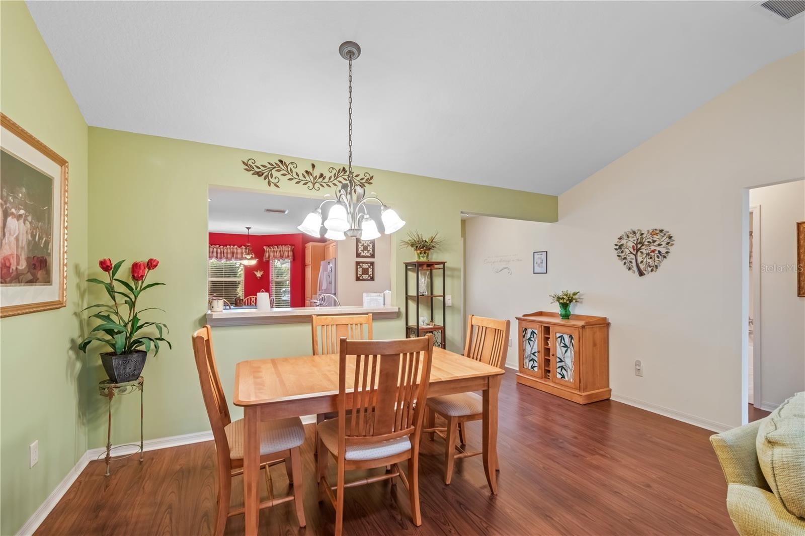 Welcome to a charming slice of The Villages lifestyle, where comfort and convenience meet timeless design in this beautifully maintained home. Nestled on a neatly manicured lot in a quiet, gated neighborhood, this home features plenty of curb appeal with tidy landscaping, a classic exterior, and a brick drive and walkway. Offering a total of 3-bedrooms and 2-baths, the home showcases vaulted ceilings, a thoughtful layout, and lots of natural light throughout. The open-concept living and dining area is warm and inviting, with laminate flooring that flows throughout complemented by modern paint colors. The main living space is perfect for entertaining or quiet evenings at home, with ample room for seating and direct access to the rear lanai through sliding glass doors. Just off the main living area, the kitchen boasts a practical design with ample cabinet storage, crisp white appliances, and a breakfast nook surrounded by windows. Whether you're preparing meals or enjoying morning coffee, this space is filled with natural light and a touch of cozy charm. The primary suite is a peaceful retreat with plush carpeting, a walk-in closet, and a spacious ensuite bath with dual sinks and a walk-in shower. Two additional bedrooms, each with ceiling fans and generous closet space, provide flexibility for guests, hobbies, or a home office as desired. At the back of the home is the fully enclosed lanai, ideal for year-round relaxation with panoramic windows and dual ceiling fans that make it easy to enjoy the Florida breeze. Located in the heart of The Villages, this home offers easy access to golfing, recreation centers, shopping, dining, and medical services. Enjoy a vibrant lifestyle with plenty of nearby amenities including pools, tennis, fitness facilities, and more—all accessible by golf cart! With a quiet setting and convenient location, this home is the perfect place to live the active, relaxed Florida life. Schedule your private tour today and discover how easy it is to feel at home here!