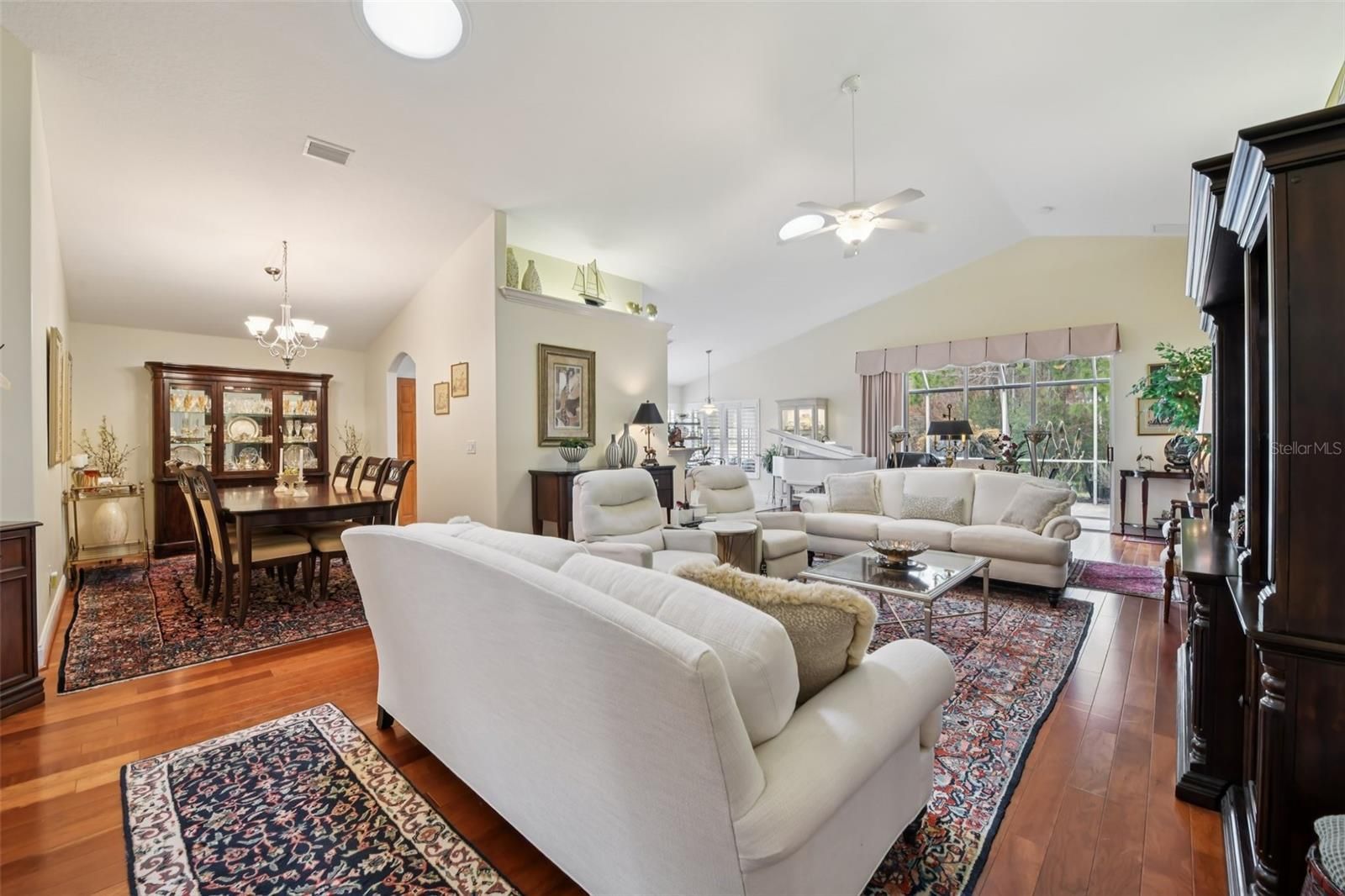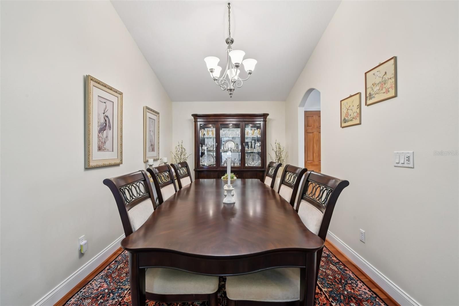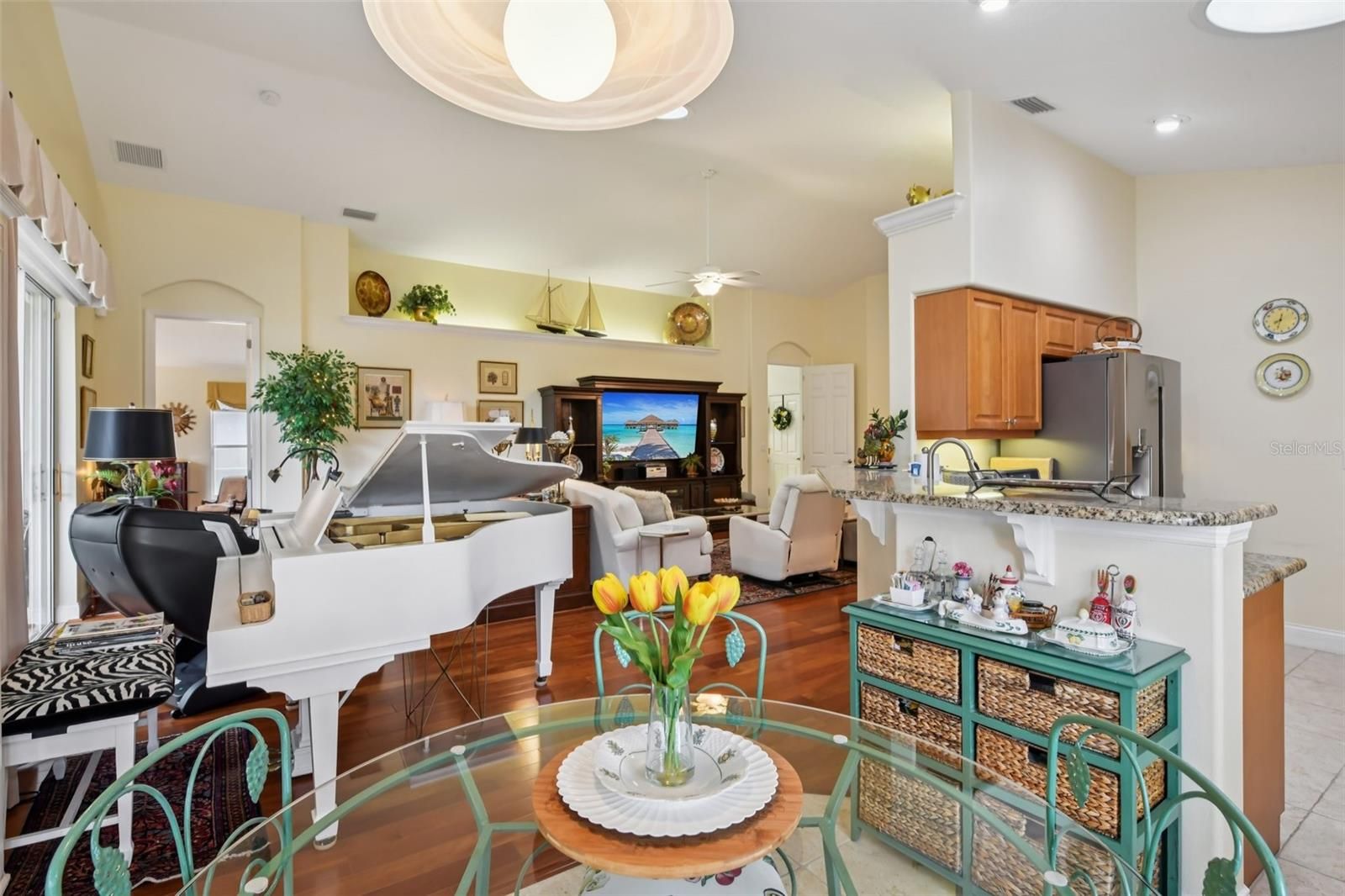 - Ceiling Fan(s), Crown Molding, Eat-in Kitchen, High Ceilings, L-Shaped Dining Room, Open Floorplan, Main Level Primary, Solid Surface Counters, Split Bedrooms, Thermostat, Vaulted Ceiling(s), Walk-In Closet(s), Window Treatments