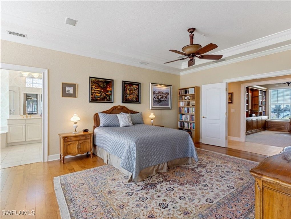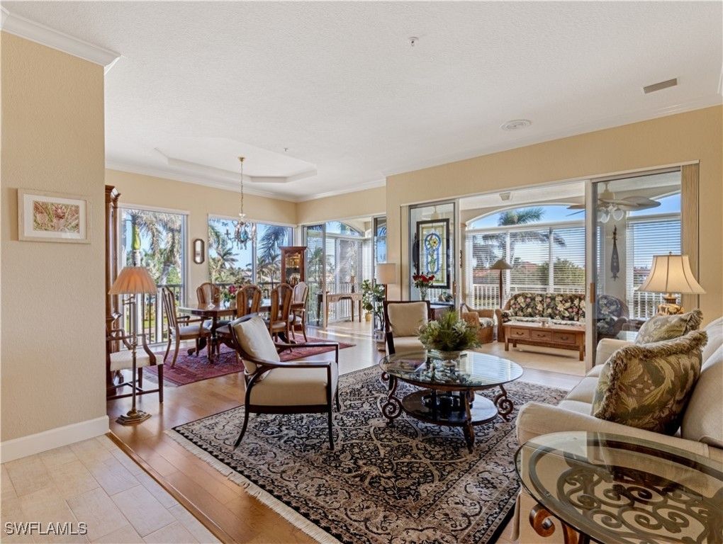 Spectacular views of the golf course and partial views of the river! This beautiful condo encompasses the entire 2nd floor with 3 bedrooms, 2.5 bathrooms, third bedroom with built in book case and murphy bed, formal living and dining rooms, family room and a 2 car garage. Spacious kitchen with center island, granite counters, breakfast bar and breakfast nook. Watch the sunrise from your glass enclosed lanai overlooking the golf course and enjoy Florida sunsets from your balcony off of your Family room. Primary Bedroom offers lanai access and a lovely sitting area. En-suite bathroom with glass enclosed shower, soaking tub, dual sinks and a walk in closet. New Roof, new windows and sliding glass doors in 2024. Close to beaches, shopping,and restaurants. Memberships available for purchase. Enjoy the Florida lifestyle and amenities including championship golf course, tennis programs, Marina, fitness center, restaurants and so much more!