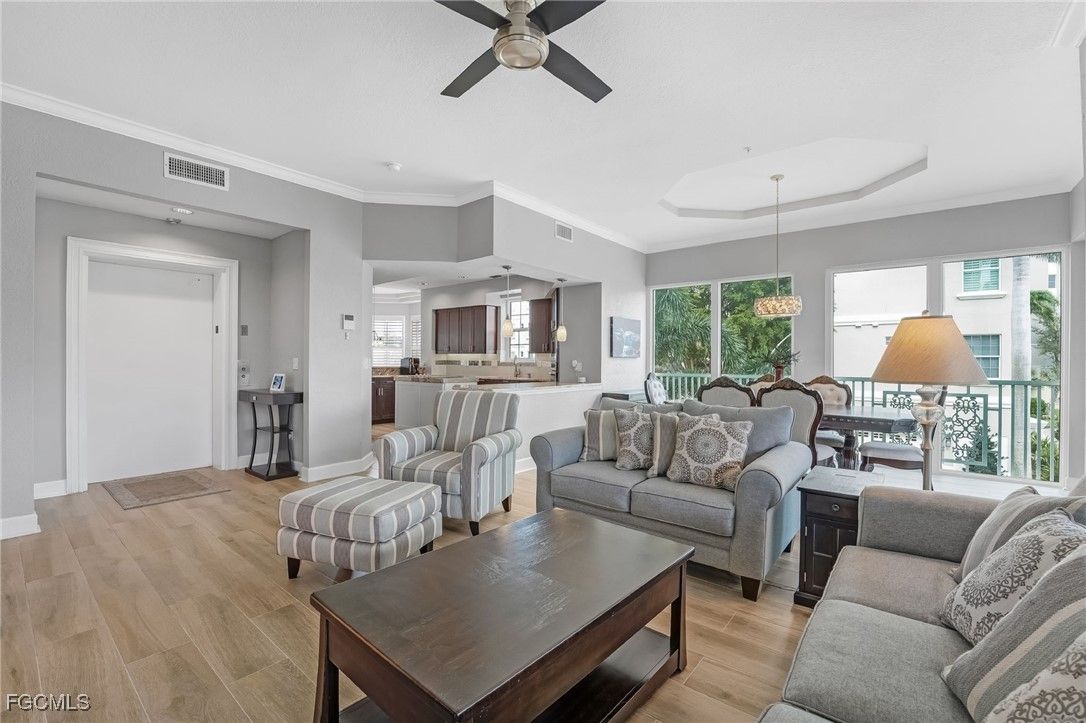 Located in the highly sought-after Harbour Landings at Gulf Harbour, this exceptional three-bedroom, two and a half bath residence offers breathtaking panoramic views of the 10th and 14th fairways and shimmering lakes beyond. Hurricane protection is provided for the majority of the condominium, offering peace of mind. The beautifully remodeled kitchen and baths elevate the home’s sophisticated appeal. The chef’s kitchen features granite countertops, a designer backsplash with elegant listello detail, under-lit island, rich wood cabinetry, stainless steel appliances, and a new refrigerator and dishwasher. The open-concept design is filled with natural light and is perfectly suited for entertaining. A stylish wet bar with refrigerator and sink adds to the home’s hosting appeal. Step onto the open-air lanai and enjoy tranquil marina views, while the oversized private lanai provides the perfect vantage point for watching golfers and native wildlife. The primary suite is a serene retreat with a cozy seating area and stunning golf course and lake views. The remodeled primary bath showcases a seamless glass walk-in shower, freestanding soaking tub, dual granite vanities, and custom walk-in closet. The second bedroom, currently utilized as an office, includes a Murphy bed for versatility. The third bedroom is generously sized and features a charming window bench—ideal for relaxing with a good book. The second full bath offers a walk-in shower and single vanity. Additional highlights include tile flooring throughout the main living areas, carpeting in the bedrooms, a private elevator, and the rare advantage of occupying the entire floor. The community offers a resort-style pool, with new roofs and refreshed landscaping recently completed. Private memberships are available for separate purchase, allowing access to the world-class amenities that Gulf Harbour Yacht & Country Club has to offer.