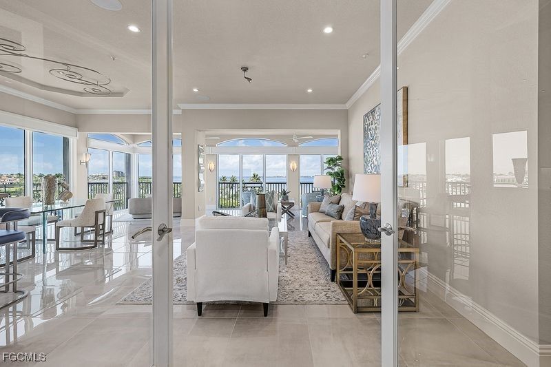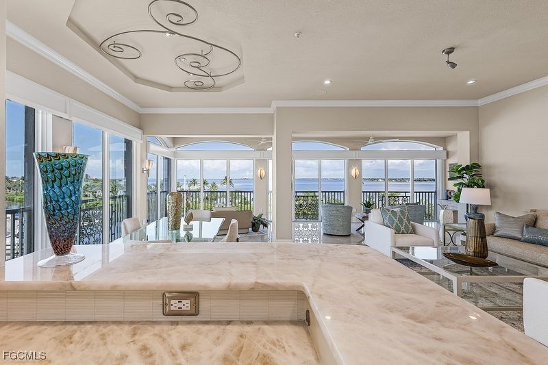 Harbour Landings Top Floor Riverfront is Exquisite throughout with no expense spared. Every Room is High Quality Custom Upgraded Professionally with a Clean Tasteful Elegant Feel. No Adjacent Building to the South and Waterfront West Views creates a One-of-a-Kind Light and Bright Atmosphere Throughout. Living-Dining Expanded into Lanai with Raised 24"x 24" Porcelain Flooring creating an extra 300 s.f. living space offering Spectacular Panoramic Marina and River Views, Retractable Screens and Sun Shades. Open Kitchen with White Custom Cabinetry, Quartzite Counters and Backsplash, Center Island, High Quality Appliances, Large Breakfast Nook and Wood Flooring. Family Room Expanded into Balcony with Unique Coffered Ceiling, Custom Cabinetry and Wood Flooring adjacent to Powder Room with Comfort Height Counters. Master Bedroom Suite is also Riverfront and Opens to Lanai, Custom Private Bath with Heated Porcelain Flooring, Free Standing Tub, Shower, Comfort Height Counters and Walkin Closet. Pocket Door installed creating a Second Bedroom Suite, Window Seat Tray Ceiling and Full Bath with Comfort Height Counters. Bedroom III-Den has French Doors, Wood Flooring, Custom Shelving and Storage Closets. Huge 3+ car Garage with Cabinetry, Granite Counter, Sink, Whole House Water Softener and Epoxy Flooring. Elevator from guest lobby Opens Directly into unit with Glass Foyer Doors. Storm Rated Doors and Windows, Custom Solid Core interior Doors, Custom Baseboard, Plantation Shutters. Sonos Music System with Built-in Speakers Living Room, Family Room, Kitchen, Master Suite and Bedroom III-Den. Only 2 neighbors in building on Quiet Circle Drive. Staged furniture could be purchased.