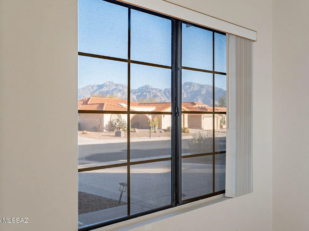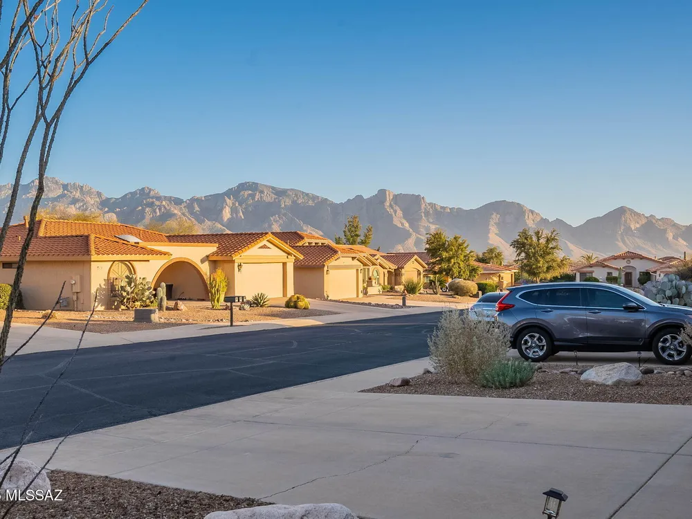 Nestled in the heart of Oro Valley, this charming 2 bedroom, 2 bath home with 1035 sq ft of comfort and style on 9,627 sq ft corner lot. Fully fenced with a block privacy wall. Views of the Catalina Mountains from the vaulted living room. Enjoy recent updates, including New Roof underlayment, fresh ext paint, quartz kitchen countertops, and tastefully painted cabinets. The interior has new paint throughout the kitchen, primary bedroom, living room and both bathrooms. Office off the kitchen, w/desk and cabinets. The garage has added storage w/attached cabinets. Step out the slider to the covered patio, perfect for relaxing. 45+ community amenities include 18 hole golf course, tennis/pickle ball, 2 pools, restaurant, fitness center, activity center, putting course. Don't miss this gem