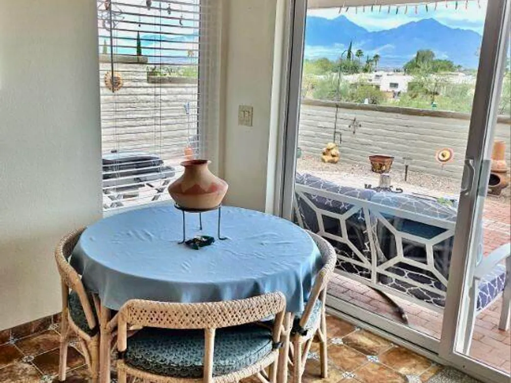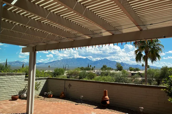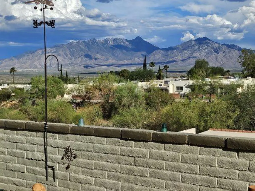 Perched high on a hilltop with panoramic Santa Rita Mountain views, this 1982-built 2BD/2BA plus den with views, offering 1,384 sq ft of beautifully updated living. Every room shines, including a kitchen with quartz counters, cabinets with roll-out shelves. Solid 8'' stucco walls ensure efficiency and durability. Enjoy light-filled spaces, stunning vistas. Step outside to a low-maintenance yard--perfect for morning coffee, evening sunsets, and year-round desert enjoyment and entertaining in serene desert surroundings. The sunroom is nicely appointed with wonderful views. GVR Desert Hills Center is just down the street within walking distance.