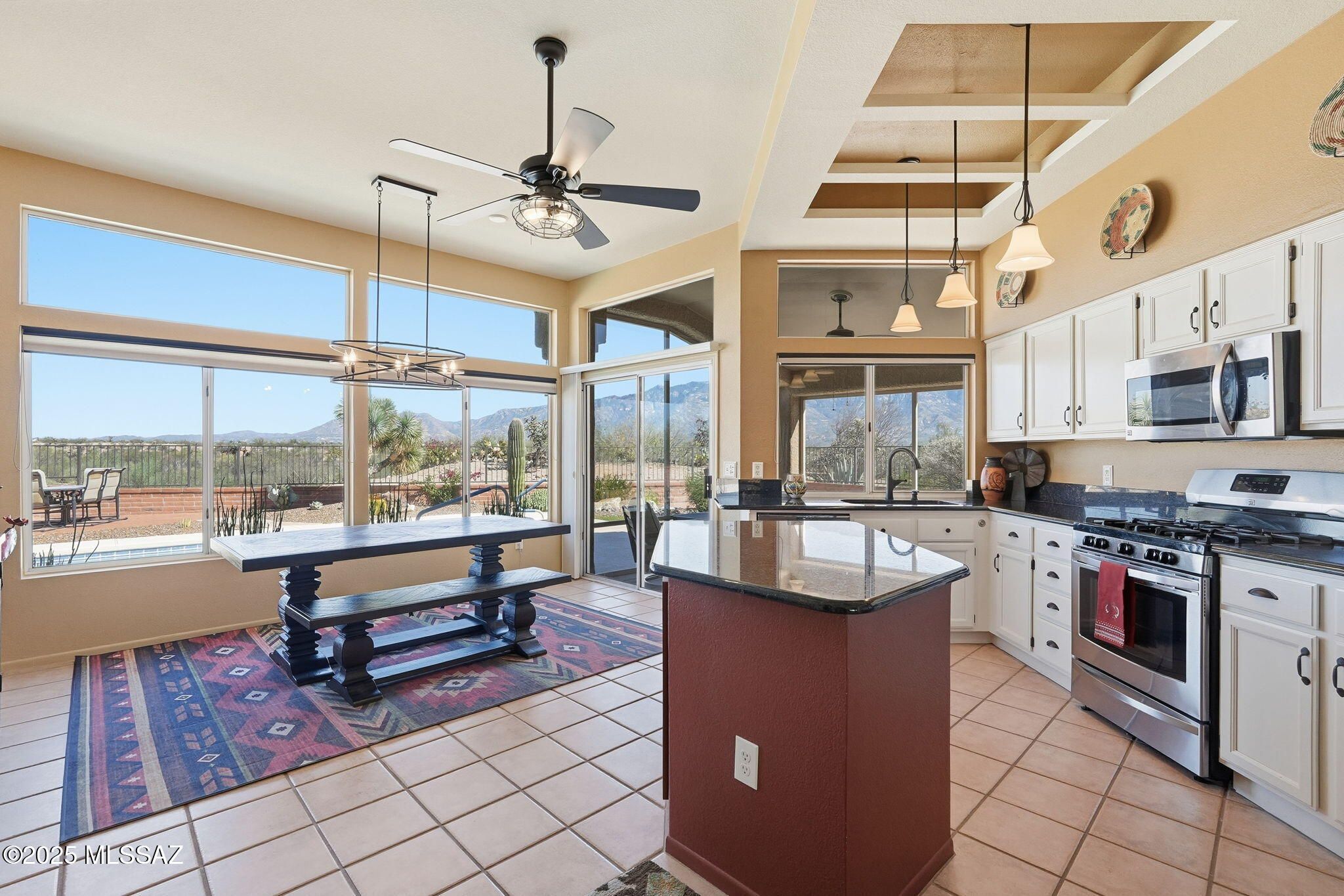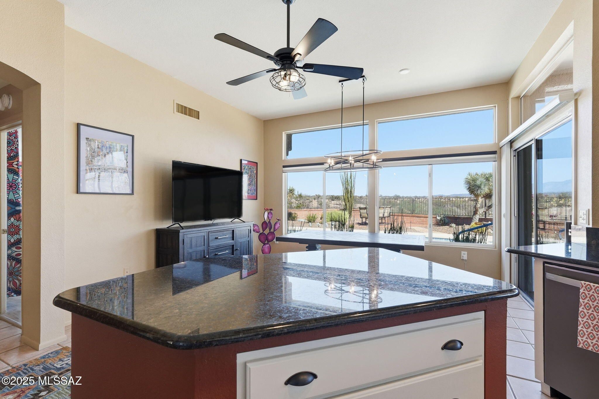 One of the best lots in Sun City Oro Valley, this beautifully maintained home captures sweeping Catalina Mountain views and serene desert vistas from a private, resort-style backyard. Backing to a common area for added privacy, this home perfectly balances peaceful seclusion with luxurious living.Step inside to find an open, inviting floor plan with neutral ceramic tile throughout (except in the primary bedroom) and new LVP flooring in the secondary bedroom. The separate living and dining rooms provide elegant entertaining spaces, while the open-concept kitchen and dining room are ideal for relaxed everyday living.The updated kitchen features granite countertops, stainless steel appliances, and custom cabinetry, flowing seamlessly into the dining room where large windows
