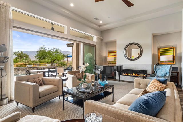 Located in the desirable 55+ community of Del Webb Rancho Mirage, this beautifully upgraded Journey model offers a thoughtful blend of design, comfort, and truly incredible views. Perched on a premium lot backing to a quiet greenbelt, the backyard captures sweeping 230 mountain vistas, with the Santa Rosa and San Jacinto ranges as your daily backdrop.Inside, the open-concept floor plan is filled with natural light thanks to multi-panel sliding glass doors, transom windows, and high coffered ceilings throughout the main living areas and primary bedroom. The kitchen is a true centerpiece--equipped with a quartz waterfall island, KitchenAid appliances, ceiling-height cabinetry, and refined finishes that make cooking and entertaining a pleasure.Every detail of the build-out was selected with care to offer both style and function. Upgrades include a Lutron smart lighting system, hard-wired security, and custom cabinetry in both the butler's pantry and laundry room. The primary suite opens directly to the backyard and features a spa-like ensuite bath and large walk-in closet. Guests will love the private bedroom with its own access to the interior courtyard--an inviting and quiet place to relax. Step outside to your own desert retreat, complete with a Pebble Tec saltwater pool, new salt cell, and several outdoor seating areas perfect for everything from sunbathing to sunset dinners. The views evolve throughout the day, offering a stunning desert backdrop that feels different and beautiful at every hour.As a resident of Del Webb Rancho Mirage, you'll enjoy resort-style amenities including a clubhouse, fitness center, pools and spas, tennis and pickleball courts, scenic walking trails, and an active social calendar--all within a gated, well-maintained community.This is a rare opportunity to own a thoughtfully upgraded home with unforgettable views in one of the desert's most sought-after 55+ communities.
