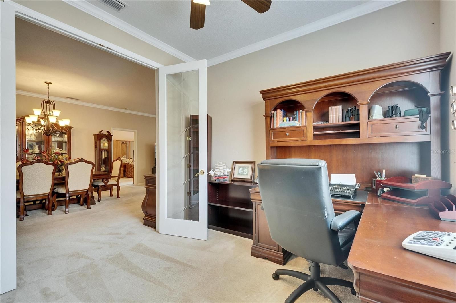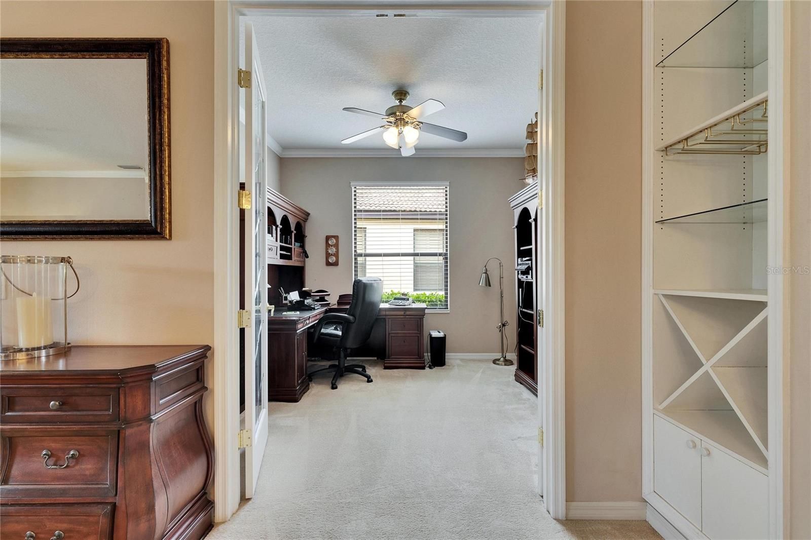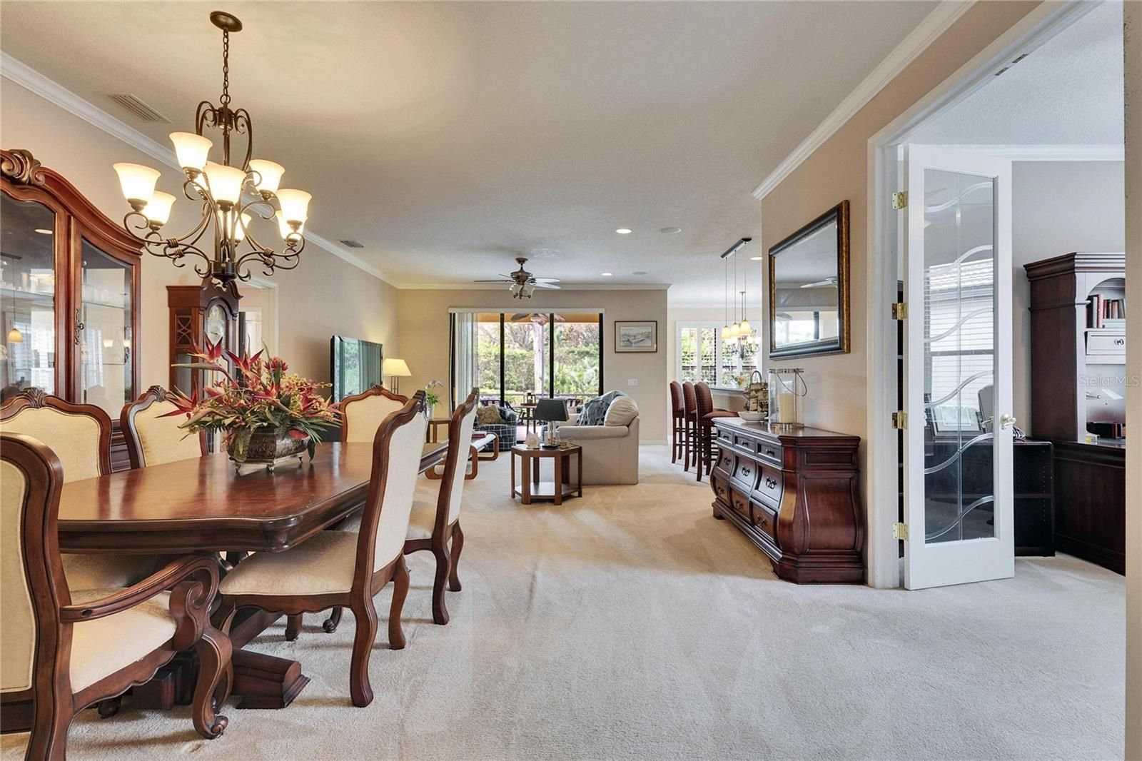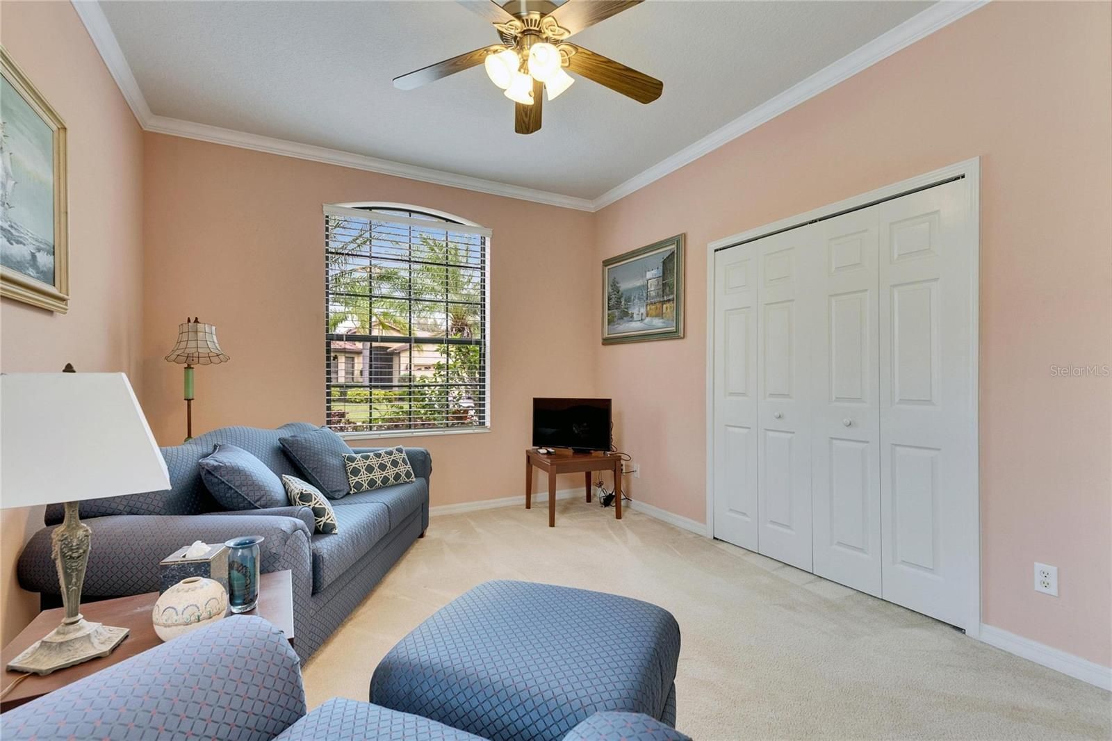PRICE ADJUSTMENT: YOUR SEARCH IS OVER!!! Located in the beautiful highly desirable gated 55+ Southshore Falls Del Webb Community. 2 bedrooms and an additional flex room (office/study/den/hobby room with beautiful glass doors) 2 bathrooms and 2 car garage. From the moment you arrive at this immaculately maintained home you will sense the pride of ownership. This home is perfectly situated on beautiful lot (landscaping maintained by HOA) and is move-in ready. As you enter through the decorative front door into the gorgeous foyer you will be impressed with the open spacious floor plan, tile on diagonal with a custom design insert. There is crown molding throughout the home with tasteful overhead lighting. A Large bright chef's dream gourmet kitchen with beautiful tiled backsplash, granite countertop, with plenty of workspace, gorgeous 42" cabinets, recessed lighting, breakfast bar and a large pantry closet. Relax with your morning coffee in the bistro area. Spacious living room and dining & sitting room providing the perfect open floor space for entertaining. The large master suite includes, a large walk-in closet, adjoining bathroom with double vanities and a large walk-in shower. As you step outside into your HUGE private lanai to Perhaps enjoy a cup of coffee or an adult beverage with a good book or watch the ever-changing views of nature Many upgrades including granite countertops, plantation shutters crown molding, ceiling fans and extended tiled extended lanai. SELLERS OFFERING A CREDIT FOR CARPET REPLACEMENT. Relax and enjoy an active adult lifestyle with resort style amenities: 14,000 sq.ft. clubhouse offers billiards, coffee/internet cafe, state of the art fitness center, library/card room, hobby/craft room and grand ballroom for parties and events! A sparkling lagoon pool and spa, resistance pool. Bocce ball, pickle ball courts, tennis courts and a putting green trail. Private roads with nature and walking trails, sidewalks and biking. Plus, the community offers numerous activities and social/special interest clubs. This gated 24-hour manned guarded community has everything you could ever need so there’s always something to do! Truly a wonderful place to entertain family and friends! Located near shopping, waterfront dining, and a short drive to the beautiful Florida beaches! No CDD. Call for an appointment to view this stunning home. Easy to view. You will not be disappointed. Welcome to your own piece of Paradise! Some furniture available