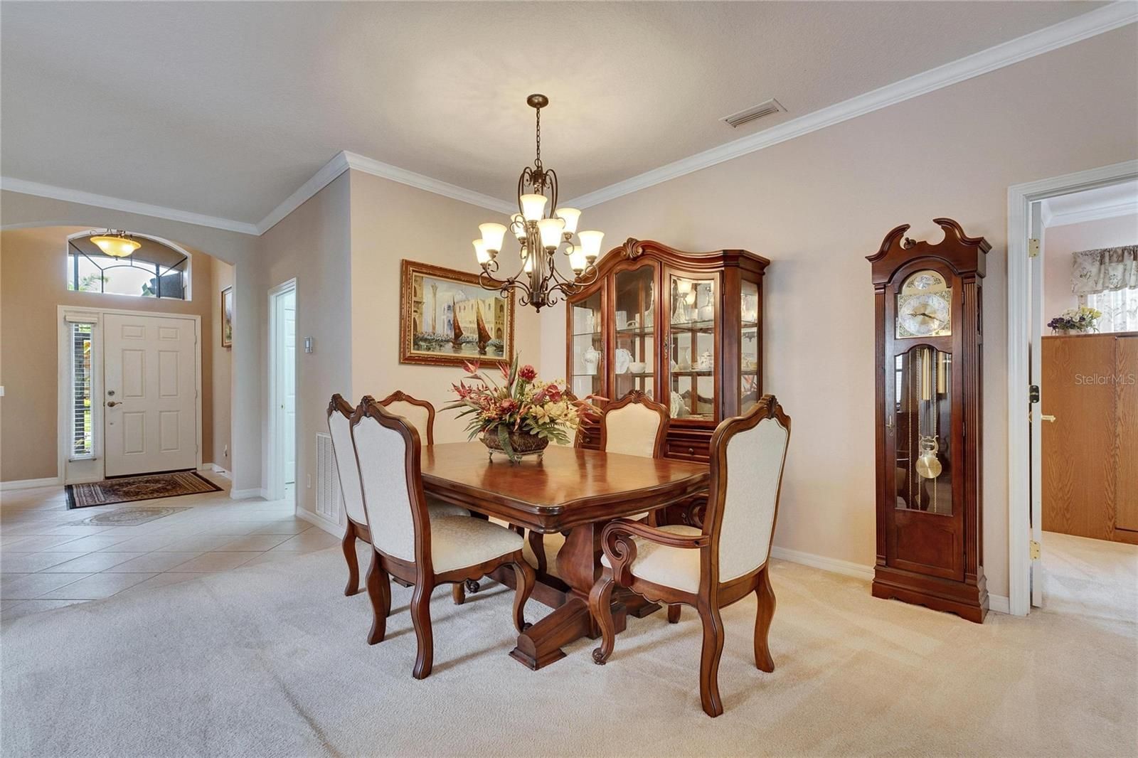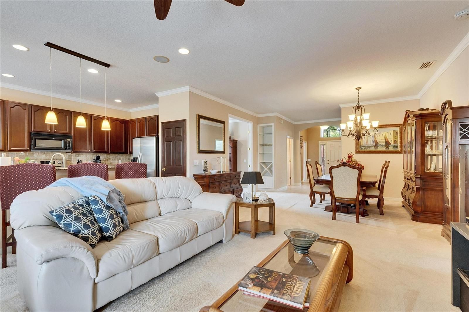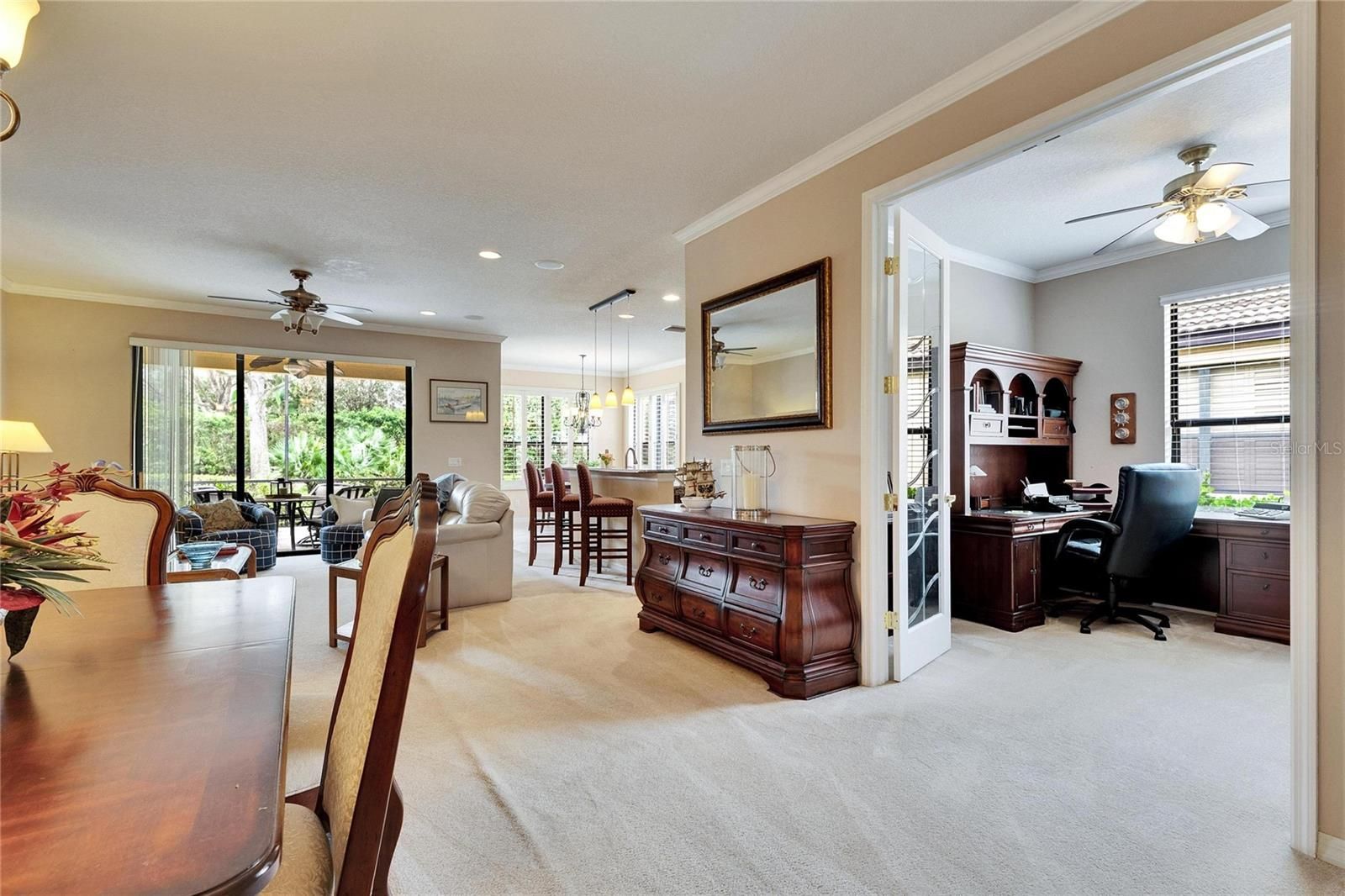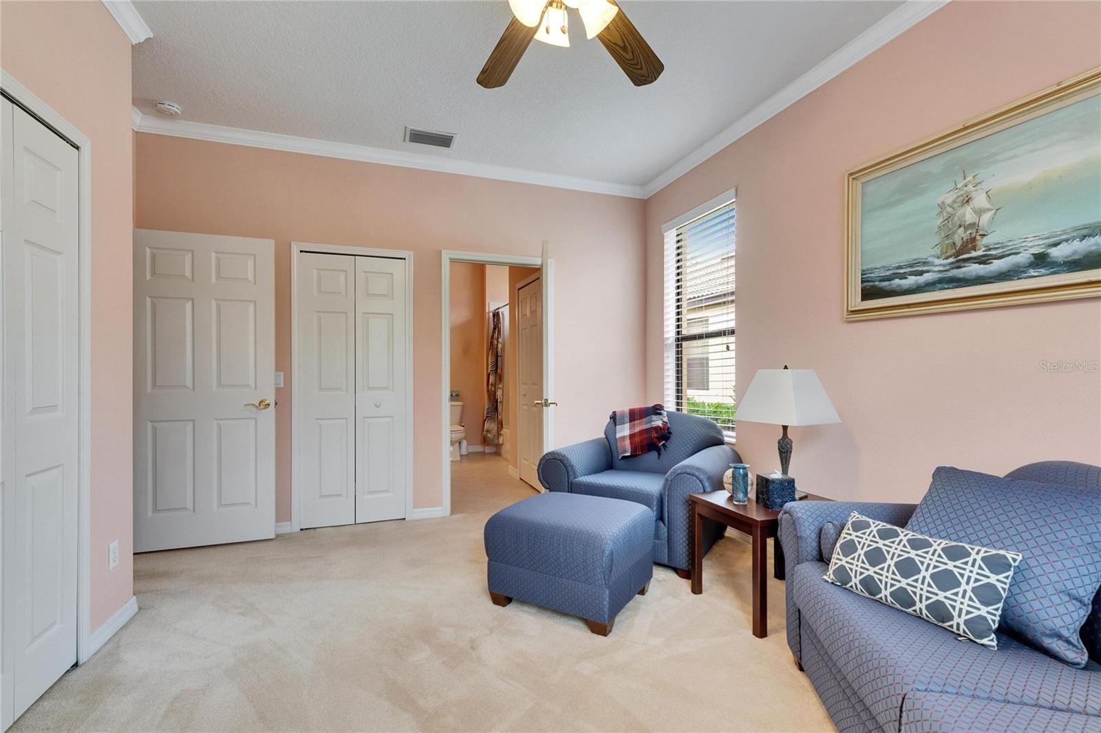 PRICE ADJUSTMENT: YOUR SEARCH IS OVER!!! Located in the beautiful highly desirable gated 55+ Southshore Falls Del Webb Community. 2 bedrooms and an additional flex room (office/study/den/hobby room with beautiful glass doors) 2 bathrooms and 2 car garage. From the moment you arrive at this immaculately maintained home you will sense the pride of ownership. This home is perfectly situated on beautiful lot (landscaping maintained by HOA) and is move-in ready. As you enter through the decorative front door into the gorgeous foyer you will be impressed with the open spacious floor plan, tile on diagonal with a custom design insert. There is crown molding throughout the home with tasteful overhead lighting. A Large bright chef's dream gourmet kitchen with beautiful tiled backsplash, granite countertop, with plenty of workspace, gorgeous 42" cabinets, recessed lighting, breakfast bar and a large pantry closet. Relax with your morning coffee in the bistro area. Spacious living room and dining & sitting room providing the perfect open floor space for entertaining. The large master suite includes, a large walk-in closet, adjoining bathroom with double vanities and a large walk-in shower. As you step outside into your HUGE private lanai to Perhaps enjoy a cup of coffee or an adult beverage with a good book or watch the ever-changing views of nature Many upgrades including granite countertops, plantation shutters crown molding, ceiling fans and extended tiled extended lanai. SELLERS OFFERING A CREDIT FOR CARPET REPLACEMENT. Relax and enjoy an active adult lifestyle with resort style amenities: 14,000 sq.ft. clubhouse offers billiards, coffee/internet cafe, state of the art fitness center, library/card room, hobby/craft room and grand ballroom for parties and events! A sparkling lagoon pool and spa, resistance pool. Bocce ball, pickle ball courts, tennis courts and a putting green trail. Private roads with nature and walking trails, sidewalks and biking. Plus, the community offers numerous activities and social/special interest clubs. This gated 24-hour manned guarded community has everything you could ever need so there’s always something to do! Truly a wonderful place to entertain family and friends! Located near shopping, waterfront dining, and a short drive to the beautiful Florida beaches! No CDD. Call for an appointment to view this stunning home. Easy to view. You will not be disappointed. Welcome to your own piece of Paradise! Some furniture available