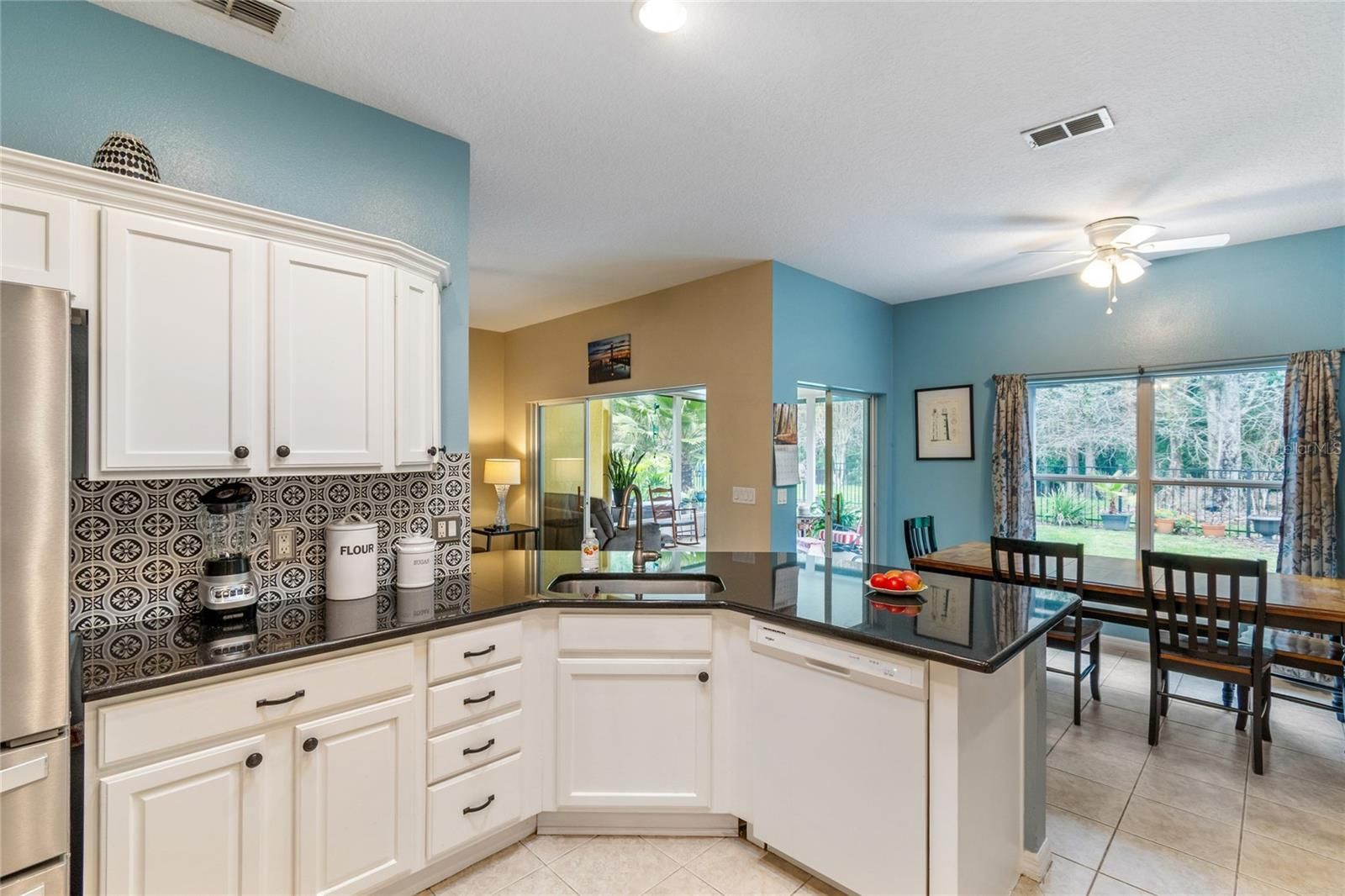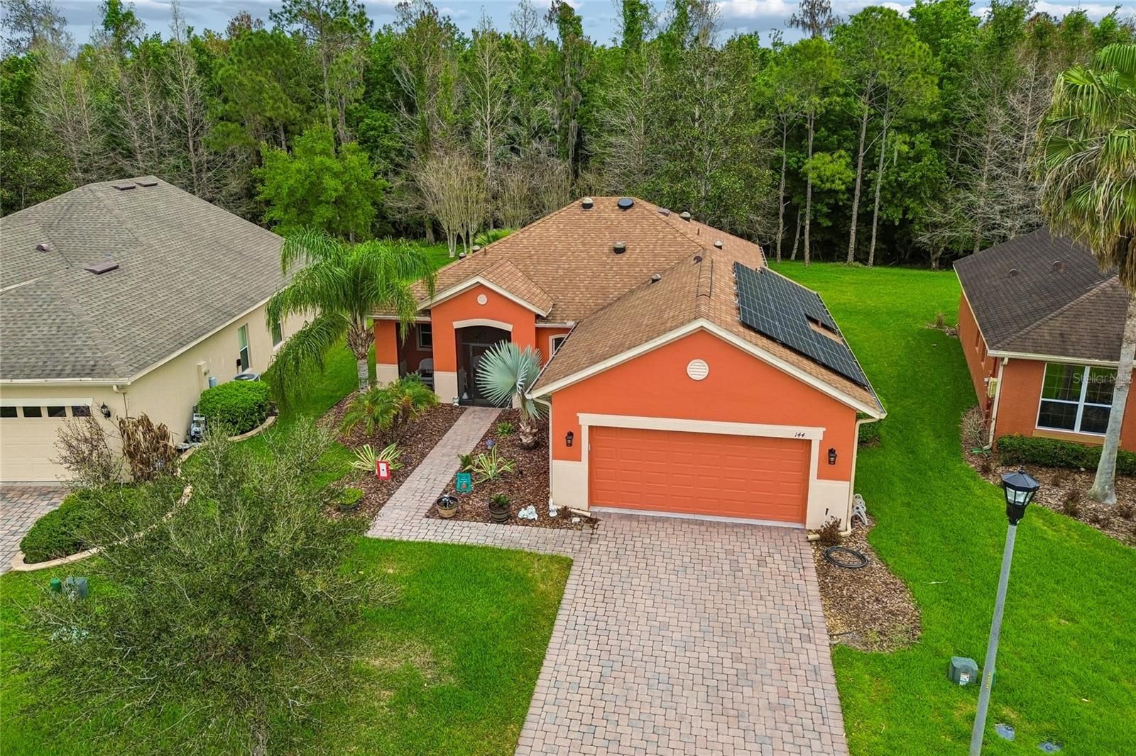 Allegro Model on a TREE-LINED Conservation Lot!!! This bright and inviting 2-bedroom, 2-bathroom home features CERAMIC TILE throughout—NO CARPETS. Natural light floods the interior through SIX SOLAR TUBES, creating a warm and welcoming atmosphere. The home comes with a PHOTOVOLTAIC SOLAR SYSTEM with a transferable lease, and the ROOF WAS REPLACED in 2016 for peace of mind. The kitchen is a true centerpiece, boasting new GRANITE countertops with an EXTENDED breakfast bar, PORCELAIN TILE backsplash, and a closet pantry, perfect for both style and functionality. The PRIMARY SUITE is spacious and features a WALK-IN CLOSET with custom BUILT-INS and a stylish BARN DOOR entry. It also includes a convenient LINEN CLOSET and a beautifully remodeled ENSUITE BATH, complete with a walk-in shower, new raised DUAL SINK vanities with QUARTZ COUNTERS, and UPGRADED MIRRORS. The split floor plan offers a second bedroom and adjacent full bath with a walk-in shower, thoughtfully positioned on the opposite side of the home to provide added privacy for guests. An expansive COVERED and SCREENED lanai serves as a true EXTENSION of the living space, with TILE FLOORING and YEAR-ROUND usability. It OVERLOOKS a serene, tree-lined conservation area, offering a completely PRIVATE and PEACEFUL SETTING—ideal for relaxing or entertaining family and friends. A large FENCED-IN YARD adds a safe space for pets to play and roam freely. Situated on a serene conservation lot, this home combines comfort, modern upgrades, and eco-friendly living. Separate laundry room features a WASHER AND DRYER INCLUDED IN SALE. The HOA: - maintains the LANDSCAPING & IRRIGATION systems in the common areas as well as at individual homesites - maintains the roads throughout the community - PROVIDES SECURITY with gate guards and mobile patrols including the Polk County Sheriff - allows AUTOMATED GATE ACCESS for residents via license plate readers - provides residents with Fiber Optic Internet & TV service.***Poinciana Lakes Plaza is a MAJOR NEW SHOPPING CENTER directly across from the Solivita Main Gate. It features Sprouts Grocery, TJ MAXX, Ross, Burlington, Rack Room Shoes, 5 Below, Ulta, Outback, First Watch, 5 Guys, Panda Express, Bojangles, Jersey Mike's Subs, 5 Guys, Papa John's Pizza, Burrito Bar, Cold Stone Creamery, Urgent Care, Dentist, Hand & Stone Massage, America's Best Eyeglasses, Crunch Fitness, Hair Cuttery, Petco, TD Bank, Verizon Mobile, PLUS MORE TO COME.***