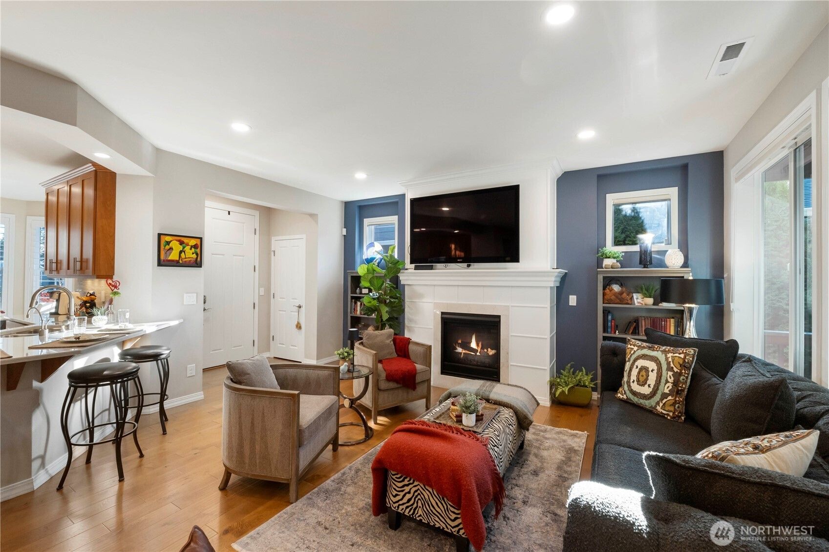 Welcome to active 55+ Trilogy in Tehaleh. Resort type living with access to the Mantle restaurant, pickle ball, fitness center and miles of groomed, walking trails. This 2bd 2bth, rambler, sports, real wood floors, tile in the bathrooms, quartz countertops, SS Cafe appliances with gas range and a brilliant floor plan that separates the 2 bedrooms. This turn key gem only needs your furniture to make it your own. This home not only has a rare mountain view, but also backs up to a large green belt for extra privacy that could be enjoyed from a massive covered patio.