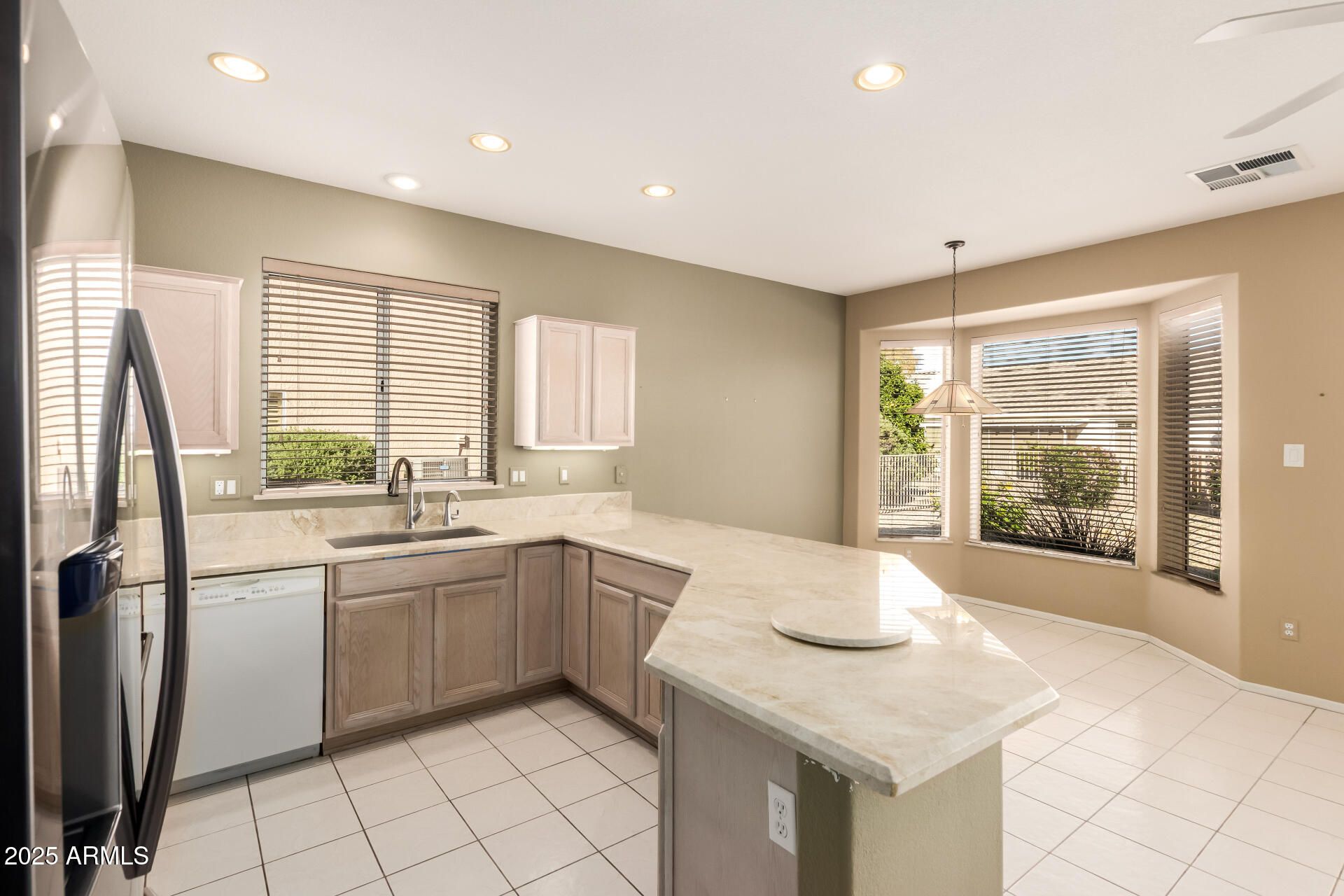Nestled in a peaceful retirement community, this spacious 1,653 sq ft single-family home offers a fantastic open floor plan with separate living room, dining room, and family room—perfect for comfortable living and entertaining.The spacious kitchen features plenty of room for cooking and gathering, complete with a charming bay window in the eating area that floods the space with natural light.Both bedrooms are generously sized with convenient walk-in closets. The home includes 2 full bathrooms and tile flooring throughout, presenting a wonderful opportunity to refresh with new paint and your own cosmetic touches. Enjoy Arizona's beautiful weather year-round in the screened-in Arizona room, ideal for relaxation or hobbies. Additional highlights include a large oversized garage with attached cabinets and a dedicated office area, a wide driveway for ample parking, durable tile roof, and efficient gas heat (new HVAC installed in 2022), gas dryer, and gas stove. This home combines great bones and layout with tremendous potentialideal for buyers looking to personalize in a vibrant 55+ community!