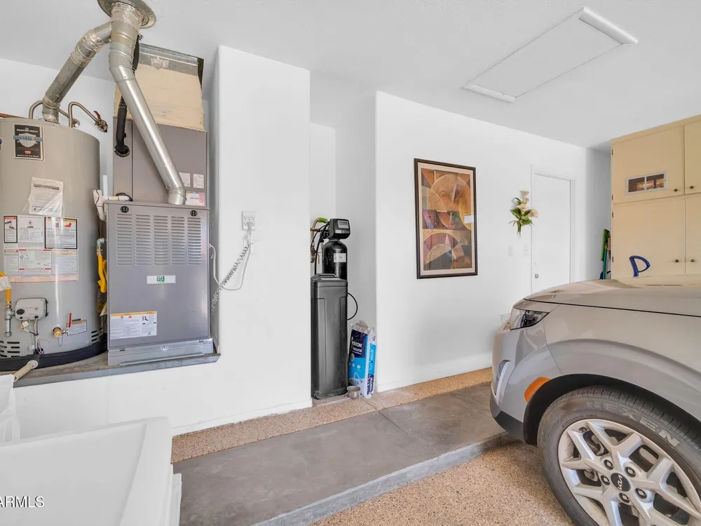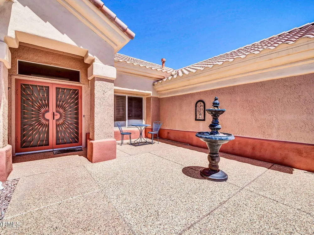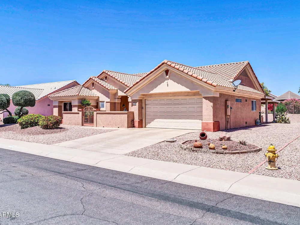 Expanded Safford Model with steel construction, 2,039 sq. ft. including 14x15 Arizona Room & 9x12 utility room. Features a gated walled courtyard with fountain, epoxy-coated surfaces, front security door, 20'' neutral tile (carpet in bedrooms 2013), Silestone counters/backsplash, undermount sink, Kenmore appliances (2008), plantation shutters, updated baths, and master with bay window. Major updates: AC/heat 2020, water heater & softener 2021, disposal 2022, shut-off valves/flex hoses 2022, toilets 2022, new garage door 2022, sprinkler valves 2022. Interior painted 2013, exterior 2015. Extended covered patio & 2-car garage with cabinets.