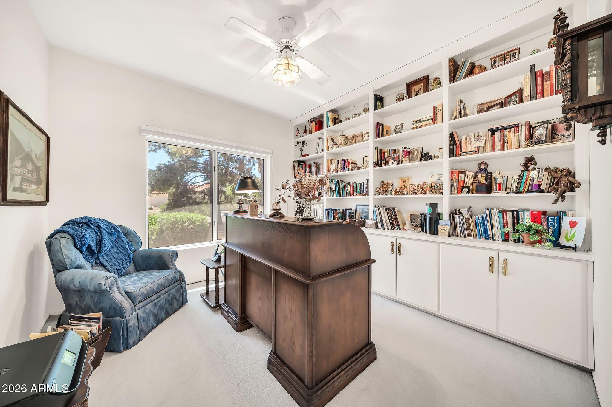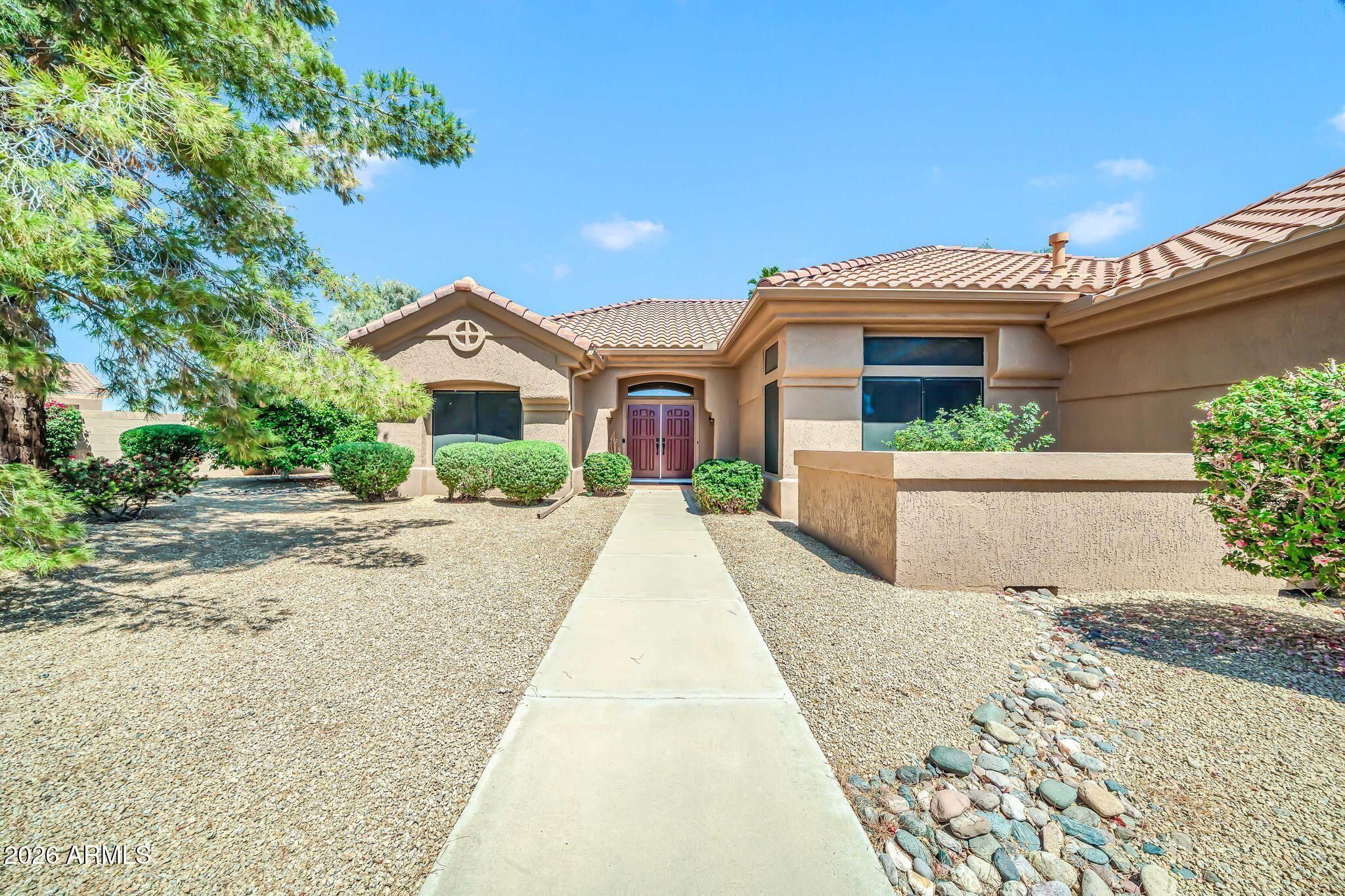 Location is everything, and this expanded Pinetop model delivers. Offering 2,207 sq ft on an elevated 11,474 sq ft golf course lot with stunning water and mountain views. The updated kitchen features granite counters, stainless steel appliances, custom backsplash, and raised-panel cabinetry. Custom built-ins enhance the extended family room. Split floor plan with spacious primary suite, spa jetted tub, separate shower, large guest bedroom, full guest bath, and built-in library/office. Additional highlights include a powder room, an extended laundry, and a golf cart garage. Roof replaced in 2018 with a transferable warranty. Exterior painted in 2024. North/south exposure with an extended patio and no golf cart path behind.